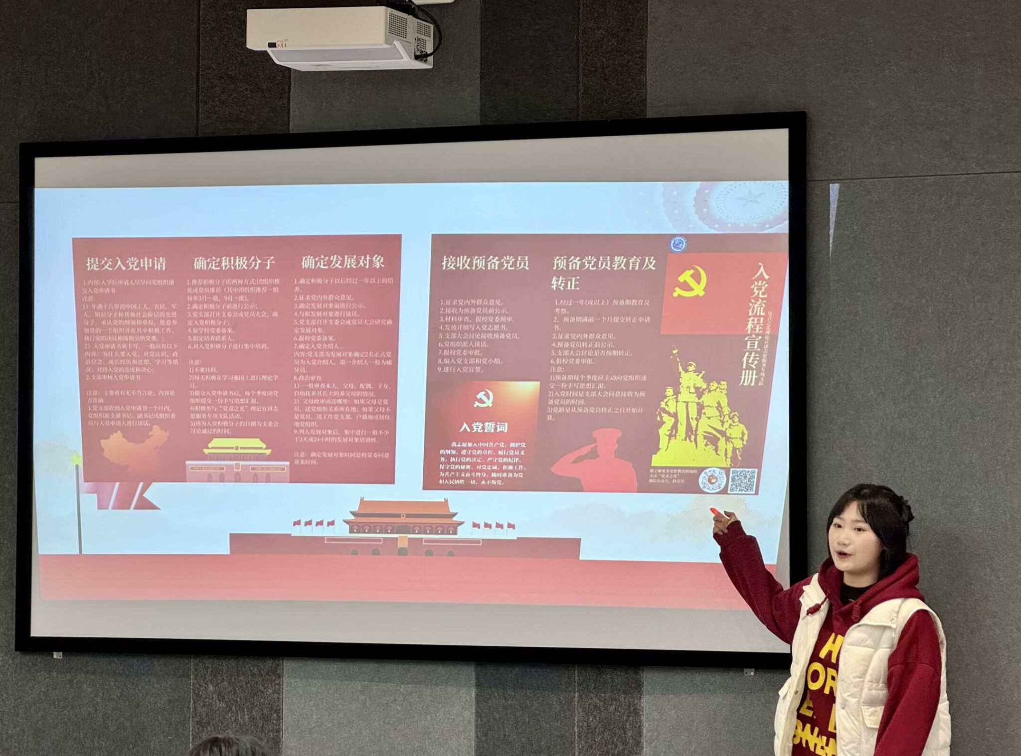 荧荧信仰光,昭昭入党情。为解答学生对入党流程及入党准备方面的疑惑,“党青之光”理论宣讲志愿服务专项支队宣讲队队员陈顺在宣讲环节就如何提交入党申请书,怎样成为入党积极分子,如何确定发展对象以及最后成为预备党员需要参加的资料等系列流程问题做了详细讲解。为帮助同学们更好理解入党的知识,陈顺同学在现场答疑环节将互动式、互助式的宣讲和党的理论知识结合,带给通信学子更直观、有收获的体验。
