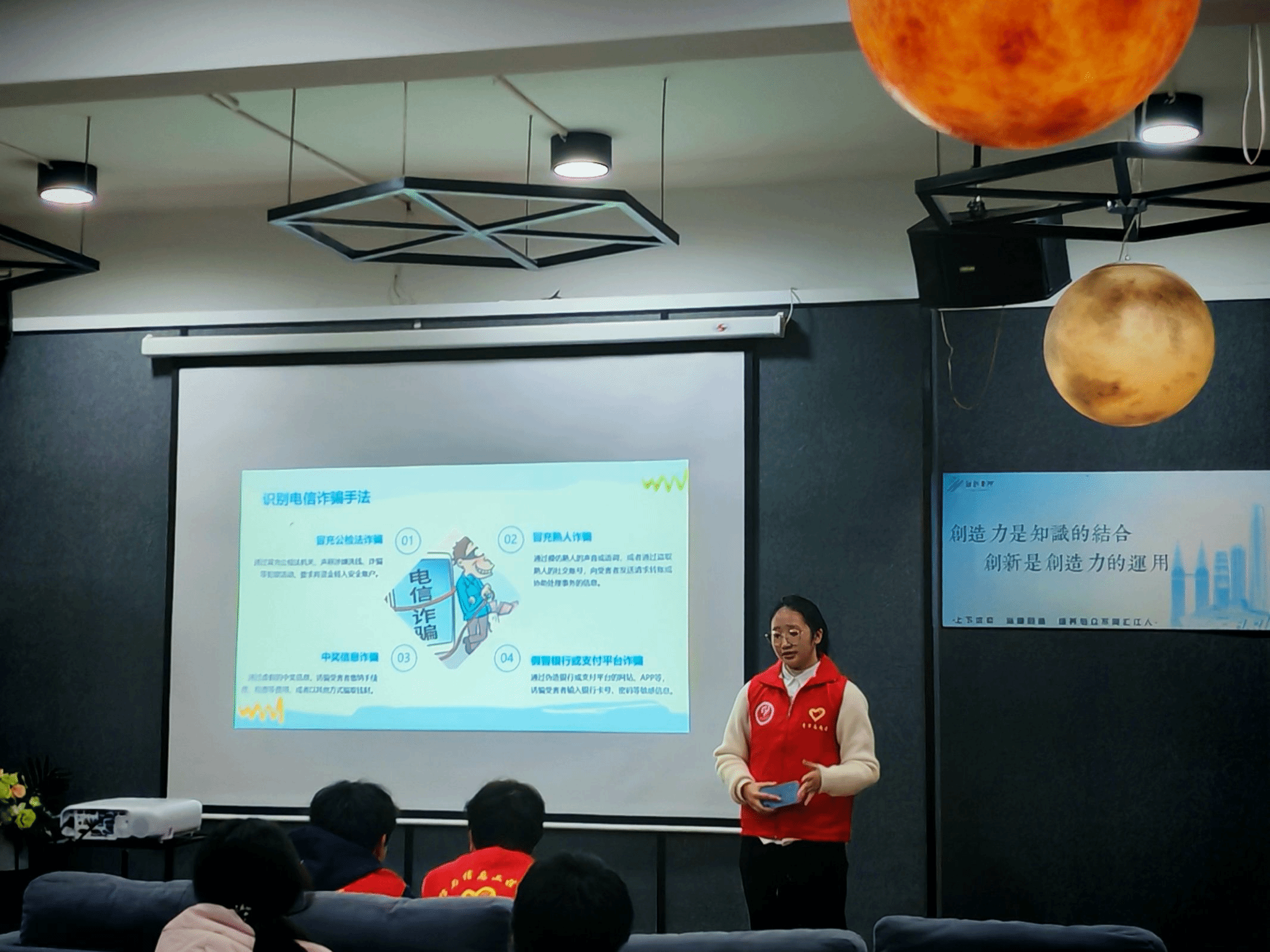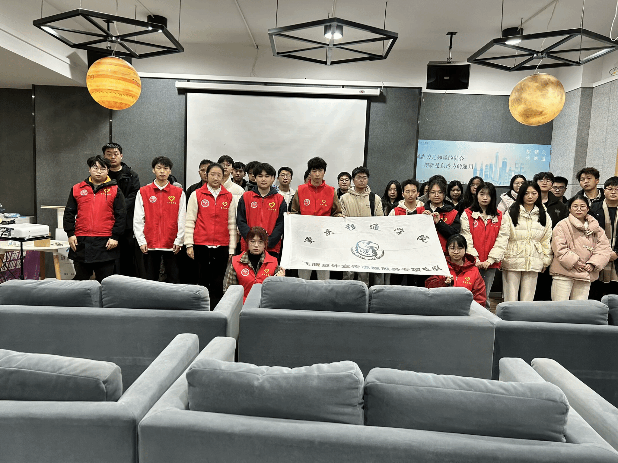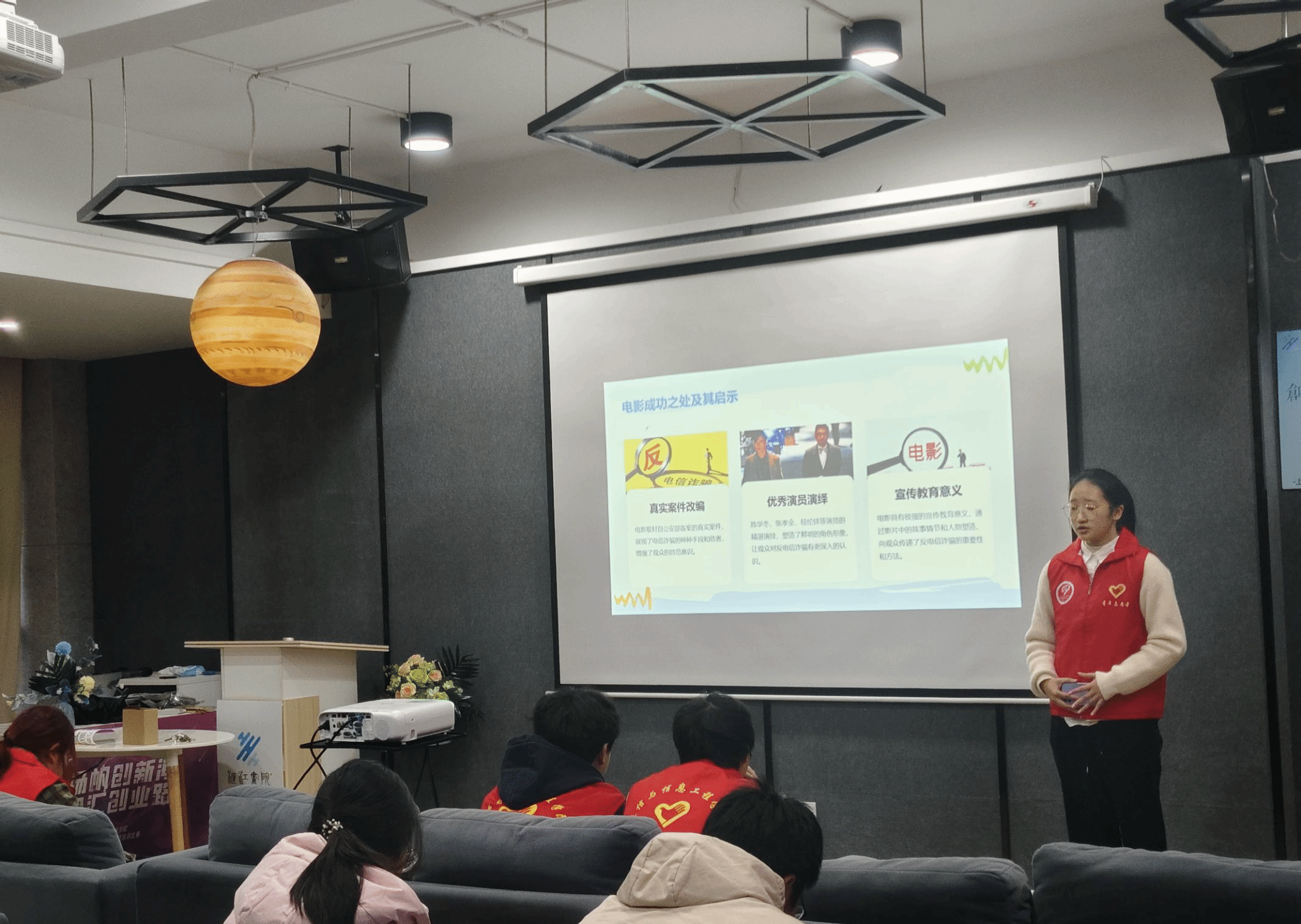 随着近年来电信网络诈骗犯罪的猖獗,国家层面的打击与防范工作持续升级,公众的防骗意识和能力在显著的提升。为了提高在校大学生的防诈意识,通信与信息工程学院“飞鹰”反诈宣传志愿服务专项支队于2024年12月7日下午三点在汇江书院影音活动室成功举办了“明眸识诈,青春护航”——电信反诈宣传活动。