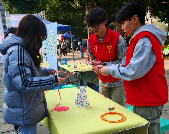 “圈定人际靶心”活动里,参与者们在摊位四领取套圈环,怀揣着期待与兴奋,站在距 KT 板 2 米处的“挑战线”上,目光如炬,将套圈环奋力投向对应人际关系类型的木棍。投完后,参与者们在摊位处深入了解人际关系,开启一扇洞察人心的知识之窗。若幸运地成功套中,可获得两个微笑表情贴纸的惊喜奖励,本环节将趣味性与教育性完美融合,以圈为引,链接众人。
