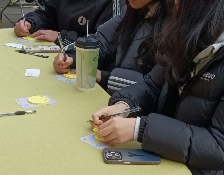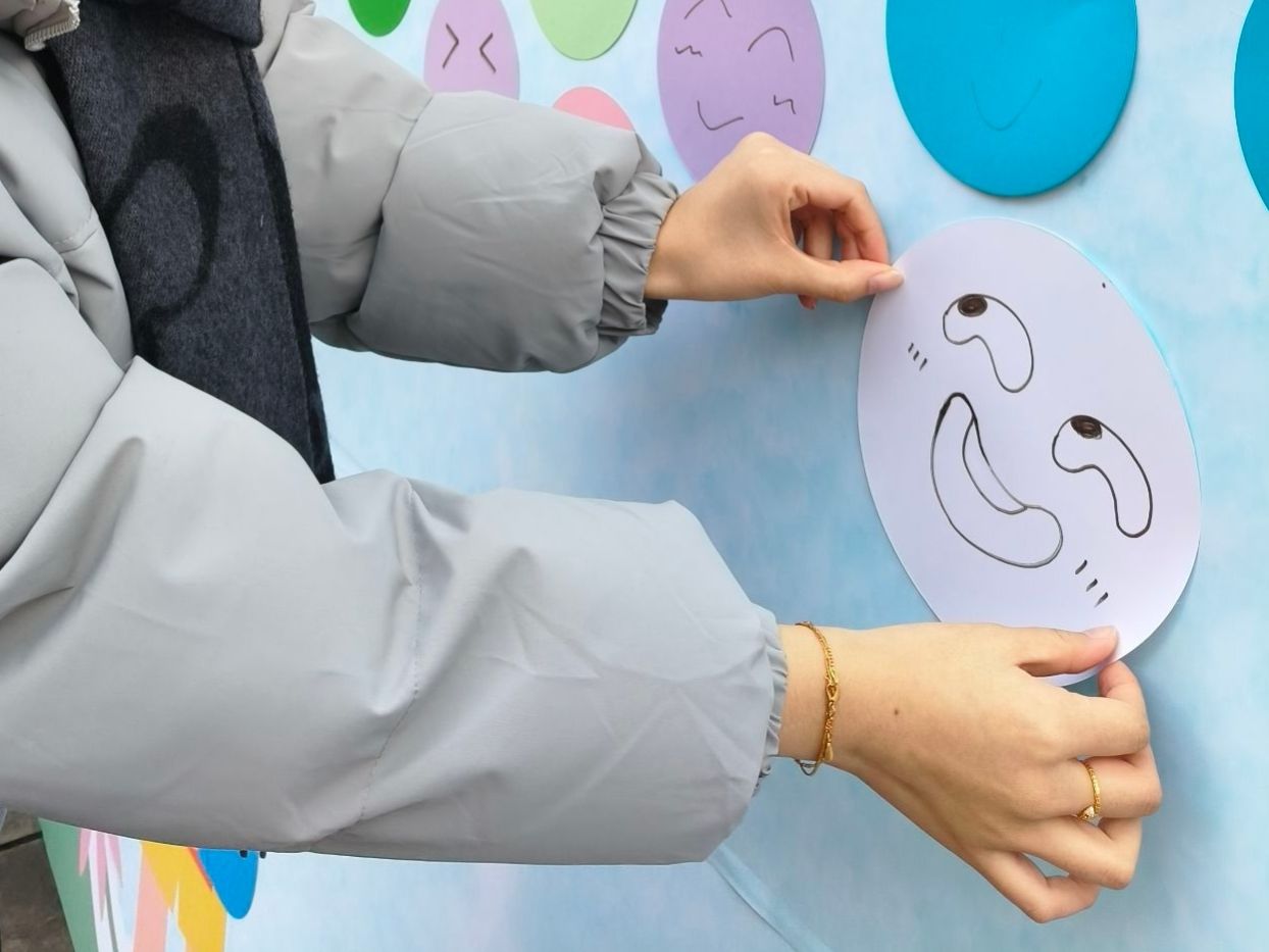 活动的终章——“笑影暖冬集”,参与者们在摊位五领取圆形卡纸,手中的黑色马克笔仿佛变成了描绘心灵画卷的神笔,精心绘制心中的笑脸。随后,他们勇敢地邀请陌生人一同在摄影处用笑脸卡纸遮挡脸部,随着快门的清脆声响,留下了冬日里最温暖的瞬间,也为小卡纸背面画上了一个圆满的句号。