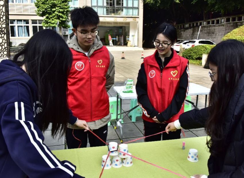 “齐心搭塔”环节,则是一场团队协作的精彩盛宴。只见志愿者有条不紊地组织参与者们以 4 - 5 人为一组,在摊位三前开启挑战。每位组员如同紧密咬合的齿轮,大家紧紧抓住绳子末端,巧妙地控制中心皮筋,运用皮筋捆绑纸杯,并齐心协力地移至指定地点搭建纸塔。本活动还专门邀请了通信与信息工程学院异科导师漆颖、常世萌老师参与。无声的默契考验悄然拉开,老师和同学们心有灵犀、密切配合,当纸塔成功搭建完成的那一刻,胜利的喜悦涌上心头,小卡纸背面盖上的印章是团队的荣耀。