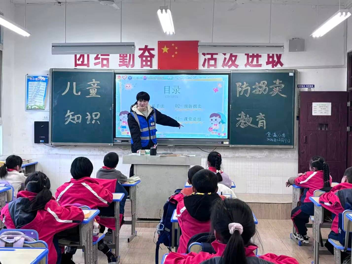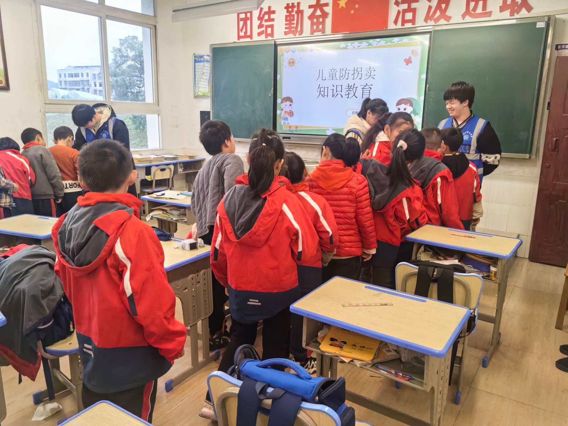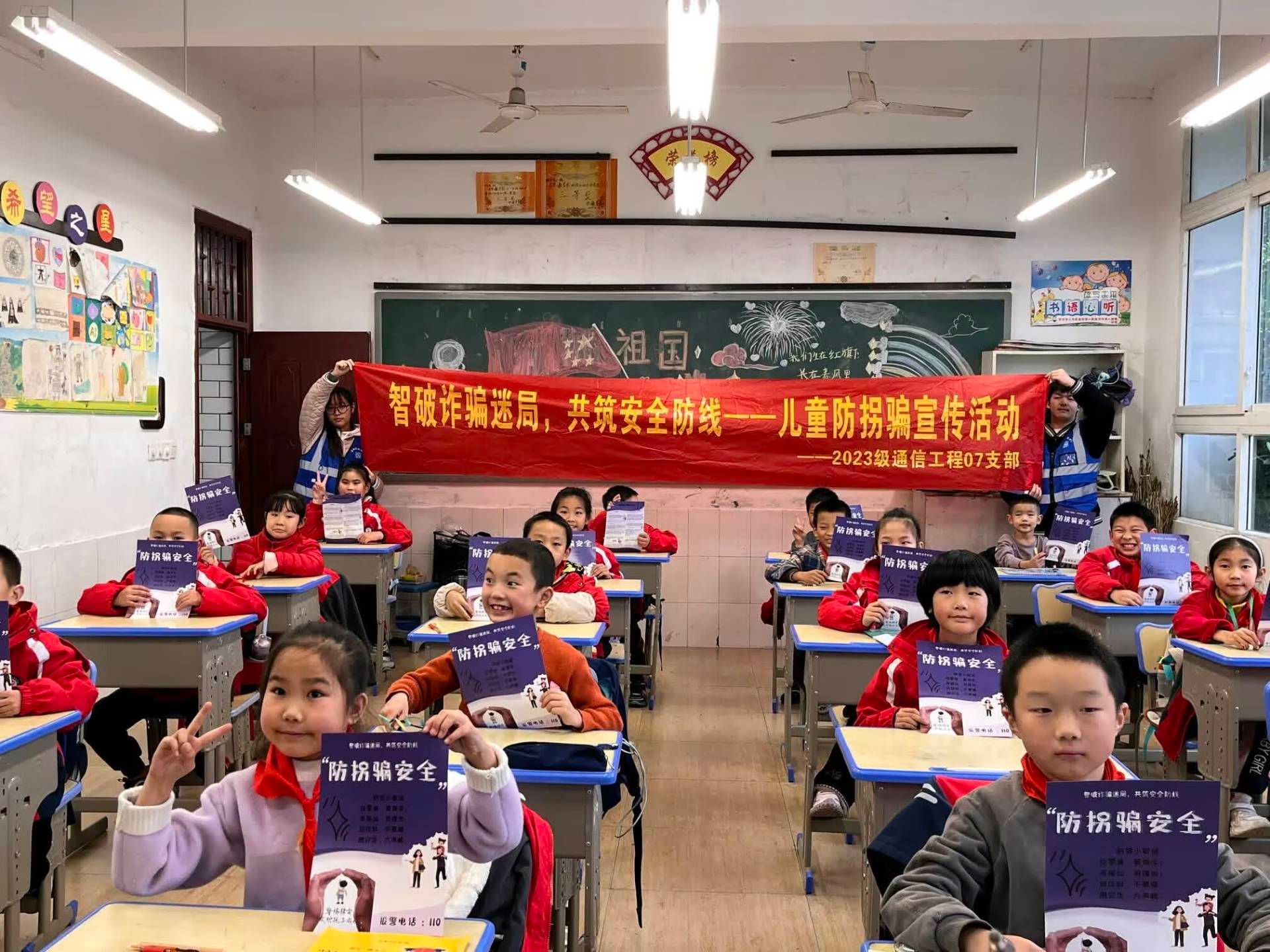当今,拐卖儿童的现象依旧是社会难以根除的顽疾,此类案件仍间歇性出现。为了切实提高儿童的自我防范意识,降低儿童被拐的风险,保障儿童能够健康无忧地成长,通信与信息工程学院飞鹰反诈宣传专项支队携手大数据学院青年志愿者协会联合通信与信息工程学院通信工程07团支部于2024年12月9日下午走进綦江区登瀛小学开展了“智破诈骗迷局,共筑安全防线”儿童防拐宣传进校园活动。此次活动参与人数共计19人,受益人数共计50人。