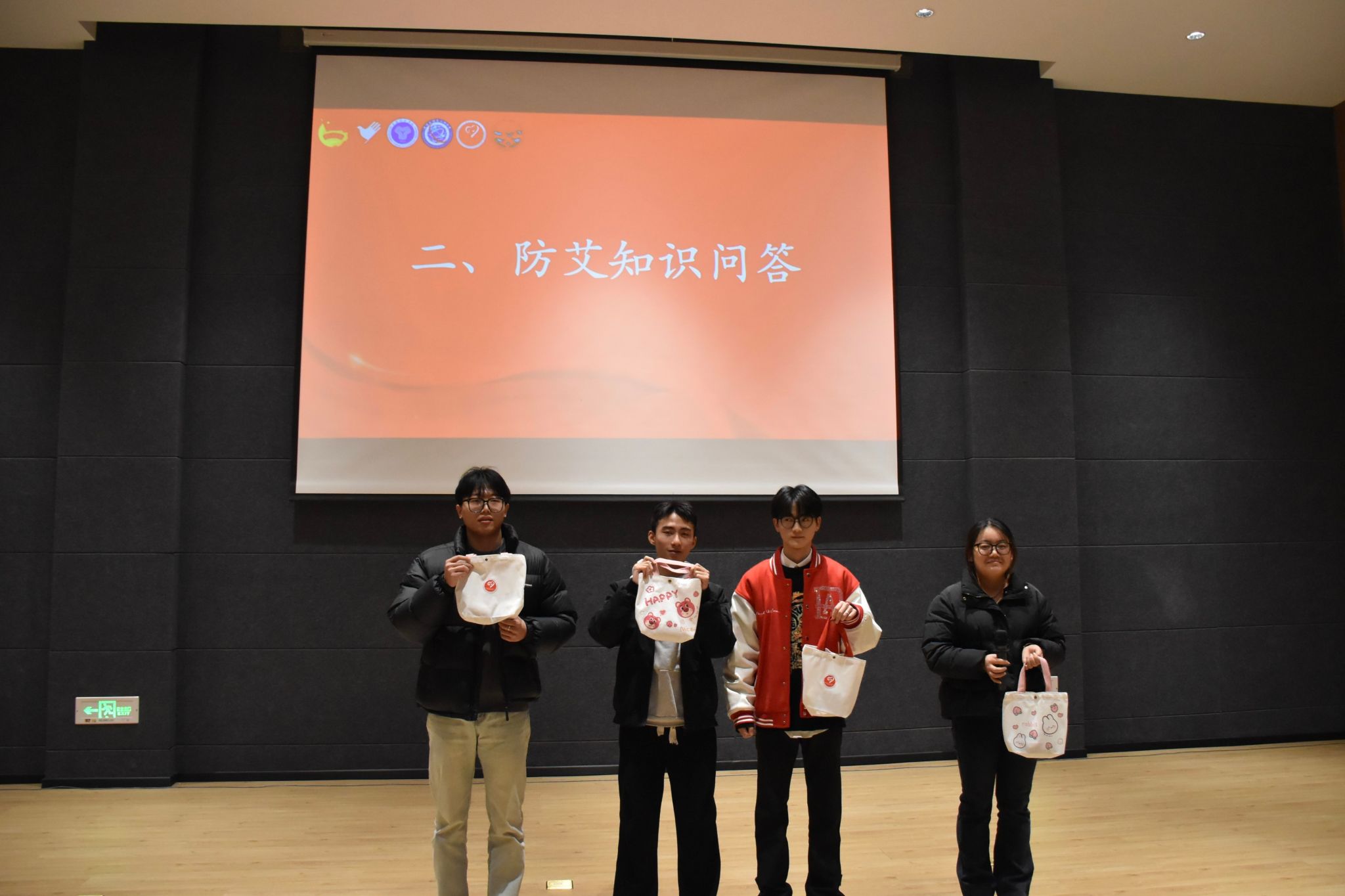 在知识问答环节中,现场气氛热烈而紧张。共四位同学们上台进行知识回答,题目类型丰富多样,涵盖了艾滋病的基础知识、预防要点、社会认知等多个方面,如 “日常生活中哪些行为不会传播艾滋病?”“如何正确使用安全套预防艾滋病?”等。选手们凭借着扎实的知识储备和敏捷的思维,快速思考、积极抢答,展现出了对防艾知识的深入理解和掌握。工作人员也为回答正确的同学送上了礼品。