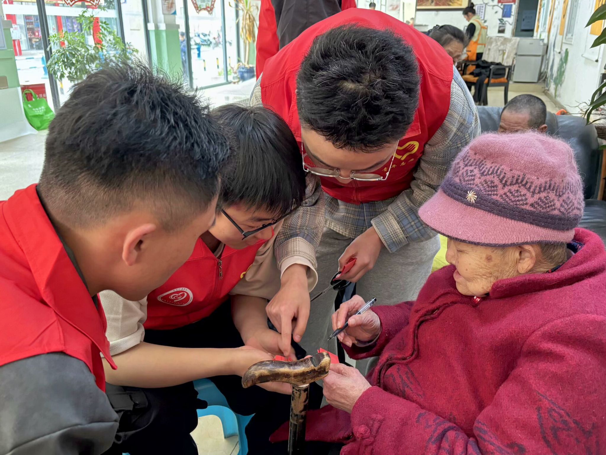 在这场活动的分享环节,剪纸老人们将剪纸要领倾囊相授,从纸张的纹理特性到剪刀的开合技巧,细致入微,尽显传统工艺的精妙。伴随着剪刀的“咔嚓”声,老人们缓缓讲述着往昔的故事,每一个故事都饱含着剪纸与生活的深厚羁绊。志愿者围坐四周,沉浸在剪纸艺术营造的独特氛围中。分享结束后,志愿者簇拥在老人身旁,镜头定格的瞬间,每一张笑容都满含对剪纸艺术传承的美好期许。这张合影,不仅是活动的留念,更是传统与现代交融的象征,寓意着剪纸艺术在代际传承中延续辉煌 。