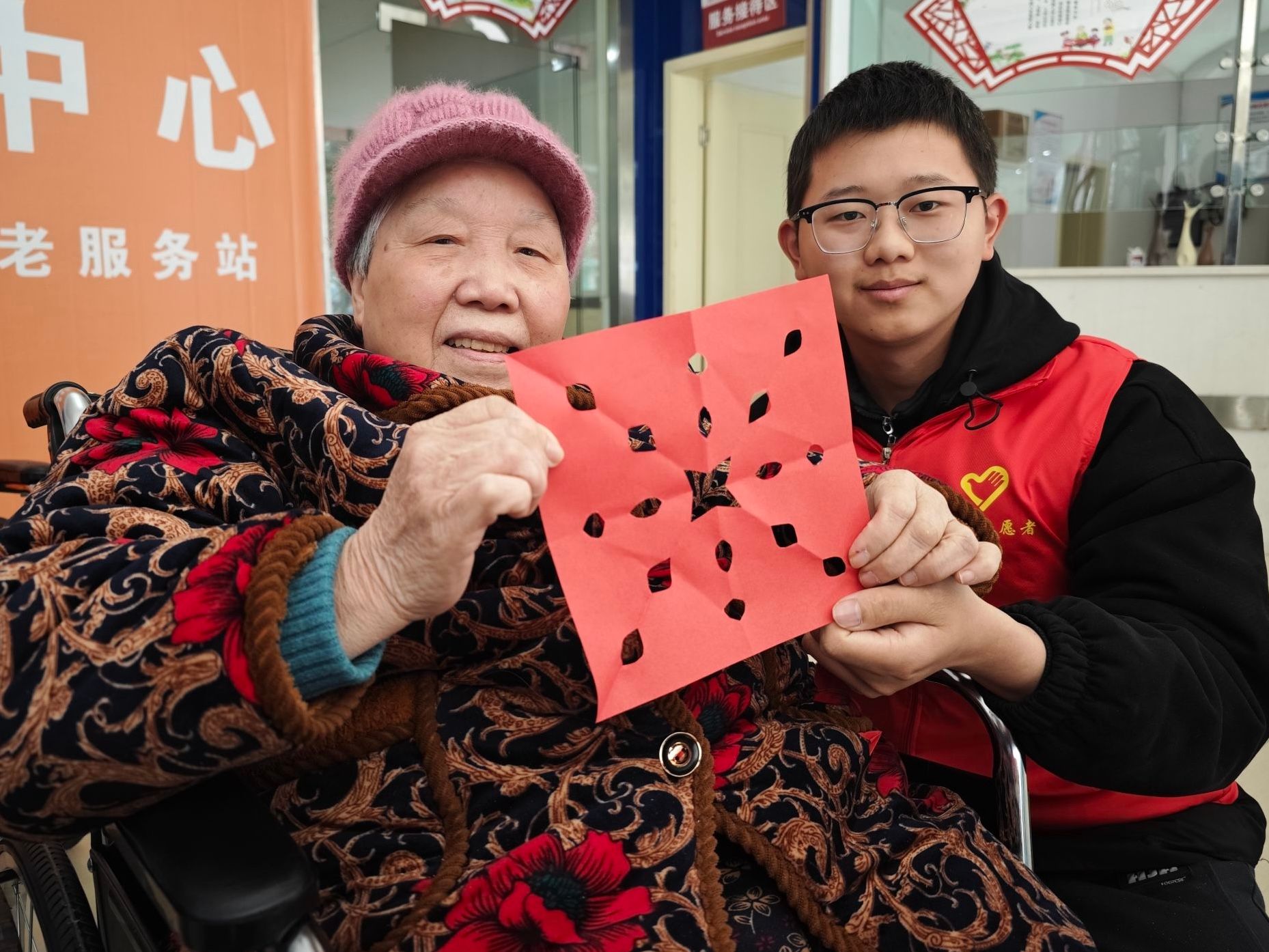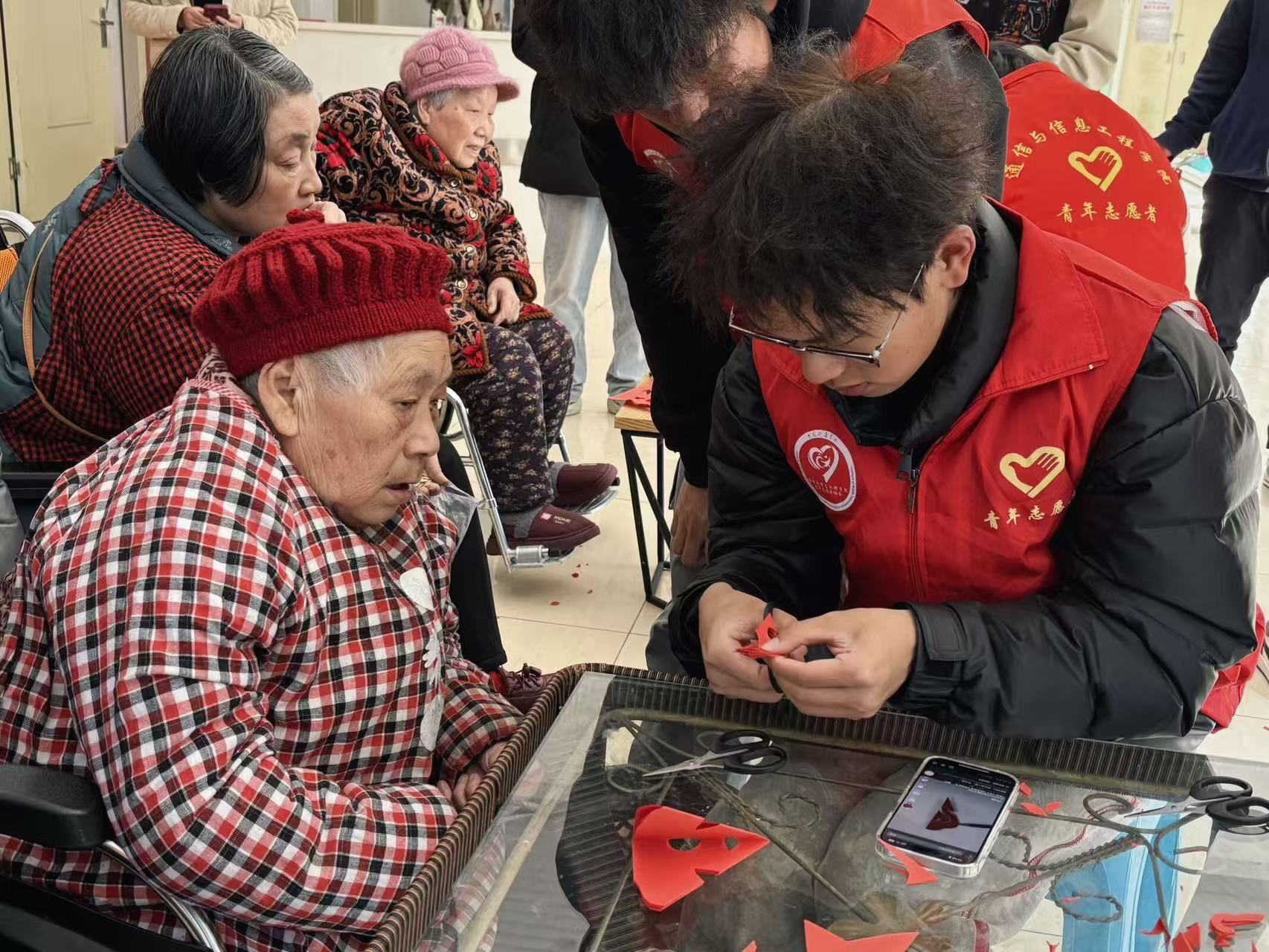 在温馨的交流互动环节,志愿者化身为文化的使者,怀揣着对传统艺术的热忱与敬畏,开启时光宝盒,以生动话语为匙,为老人们徐徐揭开剪纸艺术神秘的面纱。从远古走来的剪纸艺术,如历史长河中熠熠生辉的明珠,历经岁月洗礼,见证着朝代更迭、时代变迁,每一道剪痕铭刻着先人的智慧与生活的印记。老人们全神贯注,目光紧紧跟随志愿者手中的剪纸,沉浸于这门传统艺术的独特魅力之中,现场满溢着文化传承的脉脉温情。