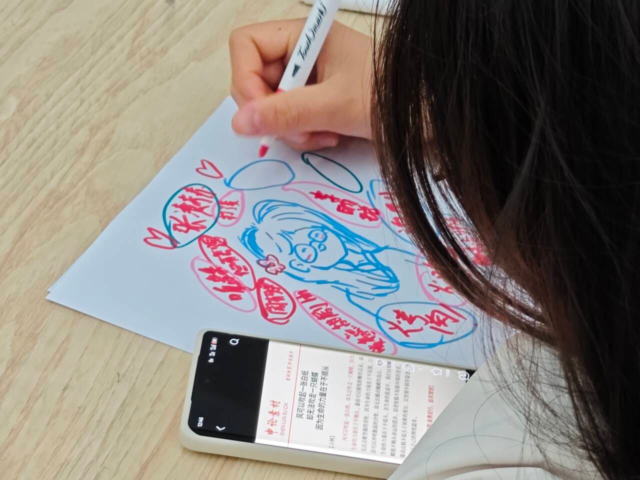 活动高潮“我希望爱我的人的样子”环节,主持人引导大家用画笔分解“爱心”,描绘亲情与期待。一颗心被分割成“妈妈的唠叨”“朋友的拥抱”等板块。活动现场,有的同学将“妈妈的唠叨”具象化为清晨催促起床的场景,笔触间饱含着对这份日常关怀的珍视;还有同学把“朋友的拥抱”描绘得生动形象,定格住朋友给予自己支持的瞬间。这些画作展现出的不仅是同学们的绘画技巧,更是他们对爱细致入微的感受。