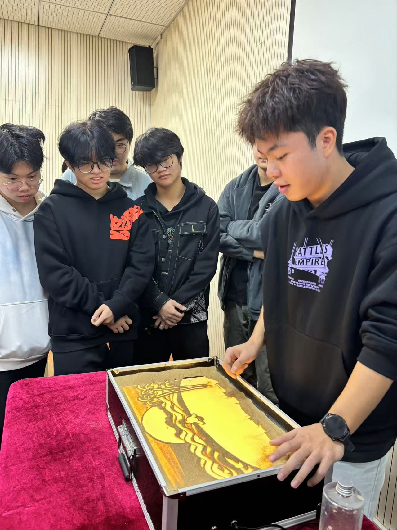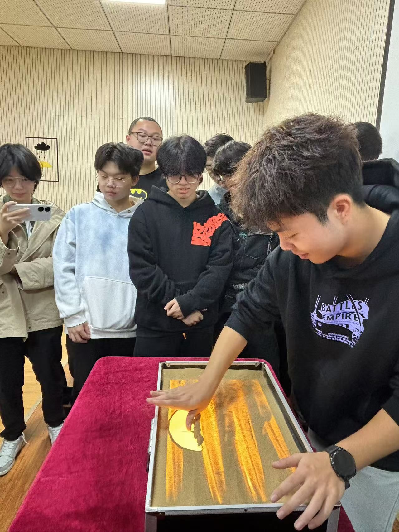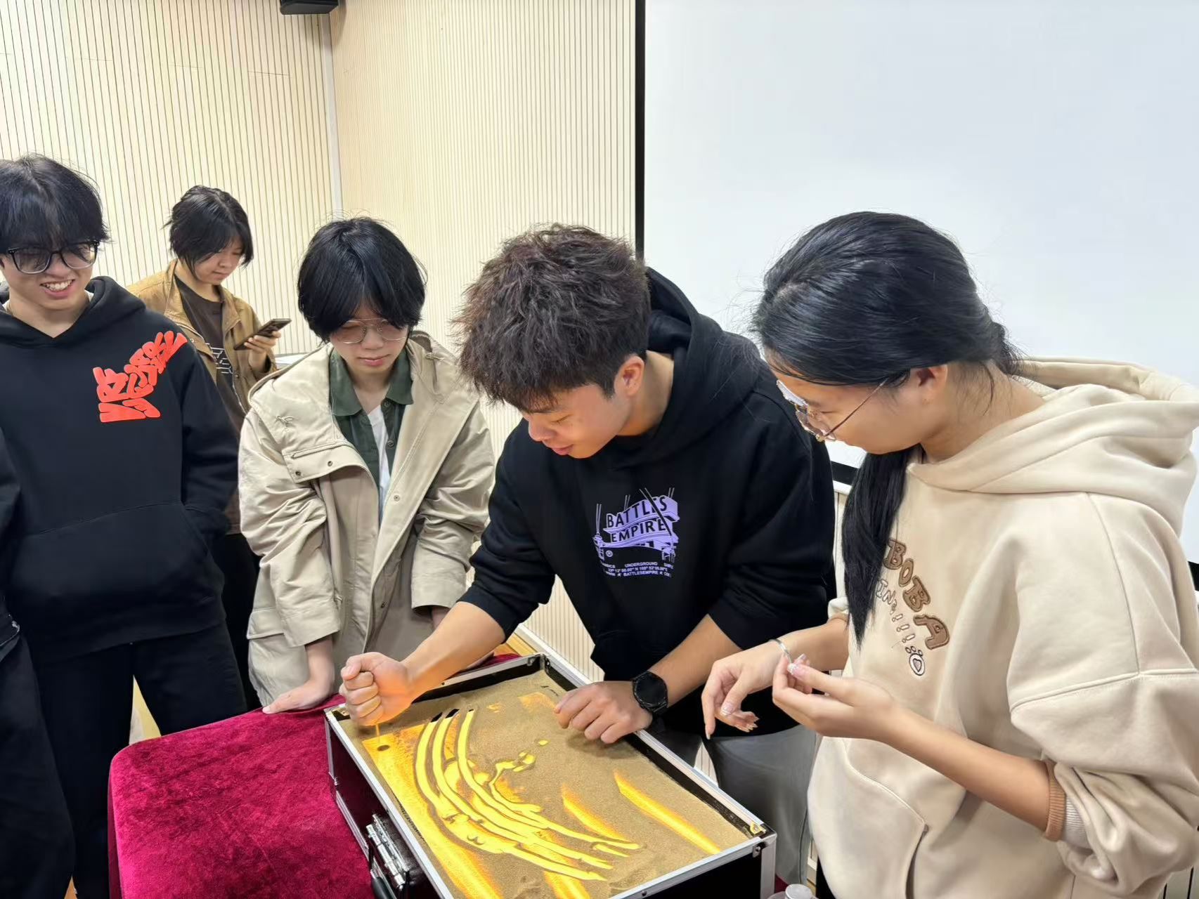 接下来,由沙画协会会长在桌子上演示如何制作一副沙画作品,同学们都围在沙画箱旁学习,紧接着,李欣成、郭妍等同学体验了画沙画的过程,纷纷表示可以减轻自身压力,达到心理调适的效果。通过沙画,同学们可以将内心的情绪和感受表达出来,实现情绪的释放和自我疗愈。
