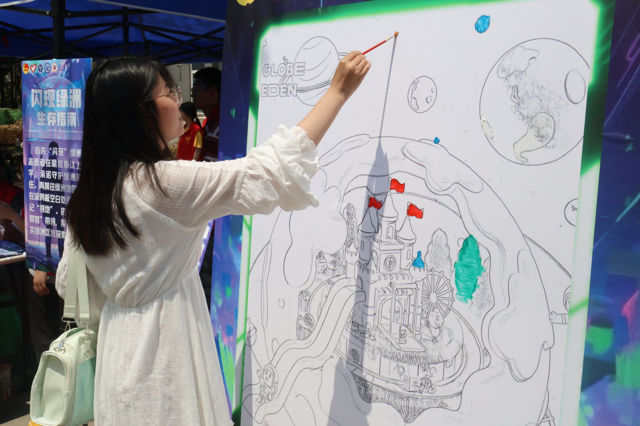 在“闪现”绿洲环节,参与者首先在喷绘上签署“守护协议”,以仪式感强化环保决心;随后在涂鸦板上用色彩勾勒虚拟绿洲,用画笔诠释对绿色家园的想象。志愿者化身“绿洲检察官”全程引导,让环保理念在创意互动中自然渗透。