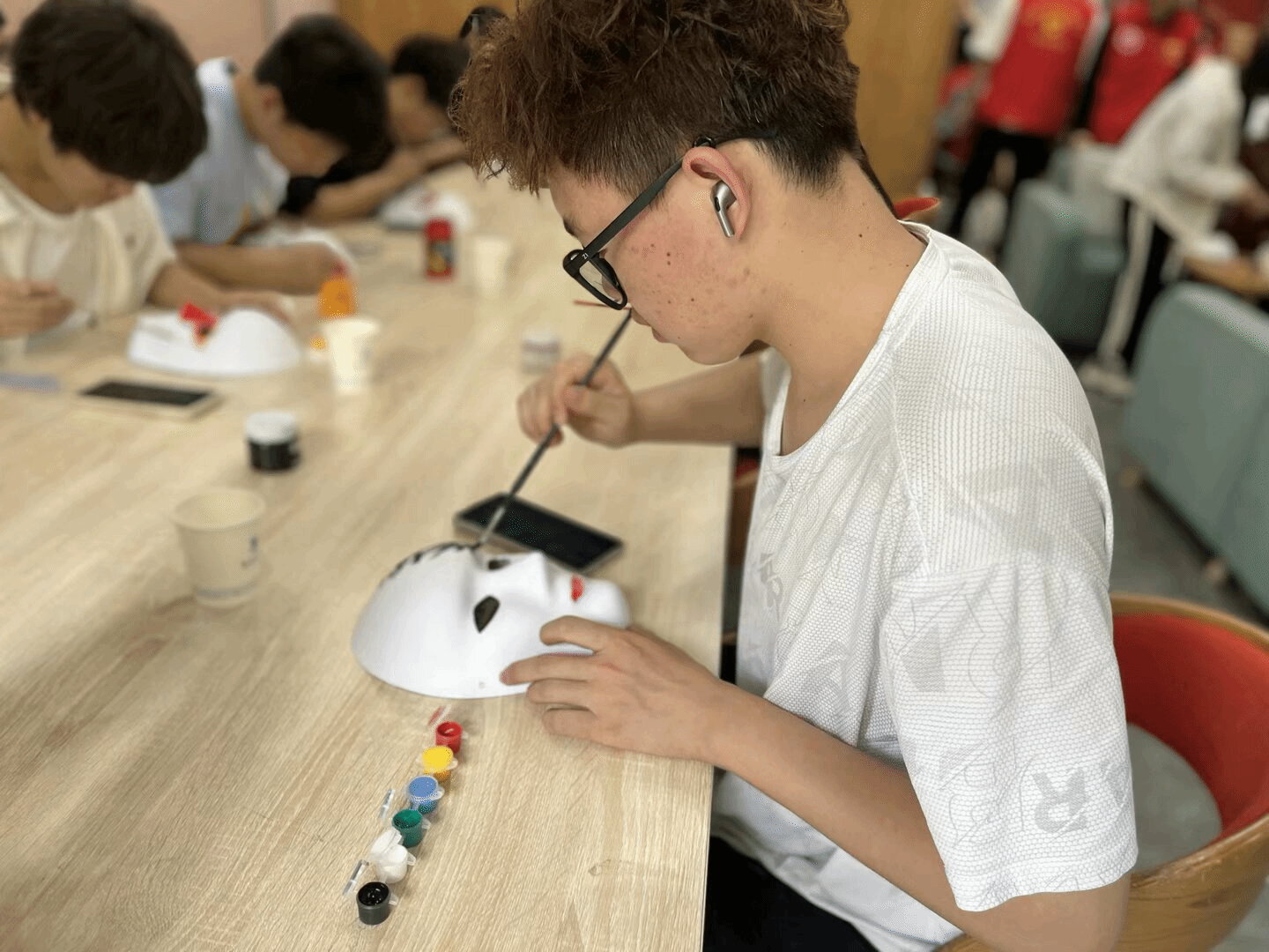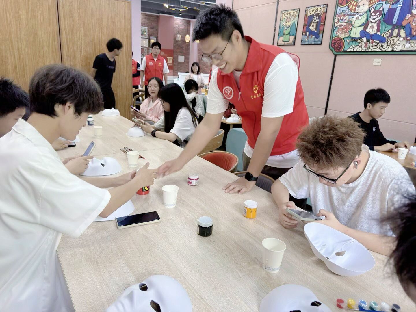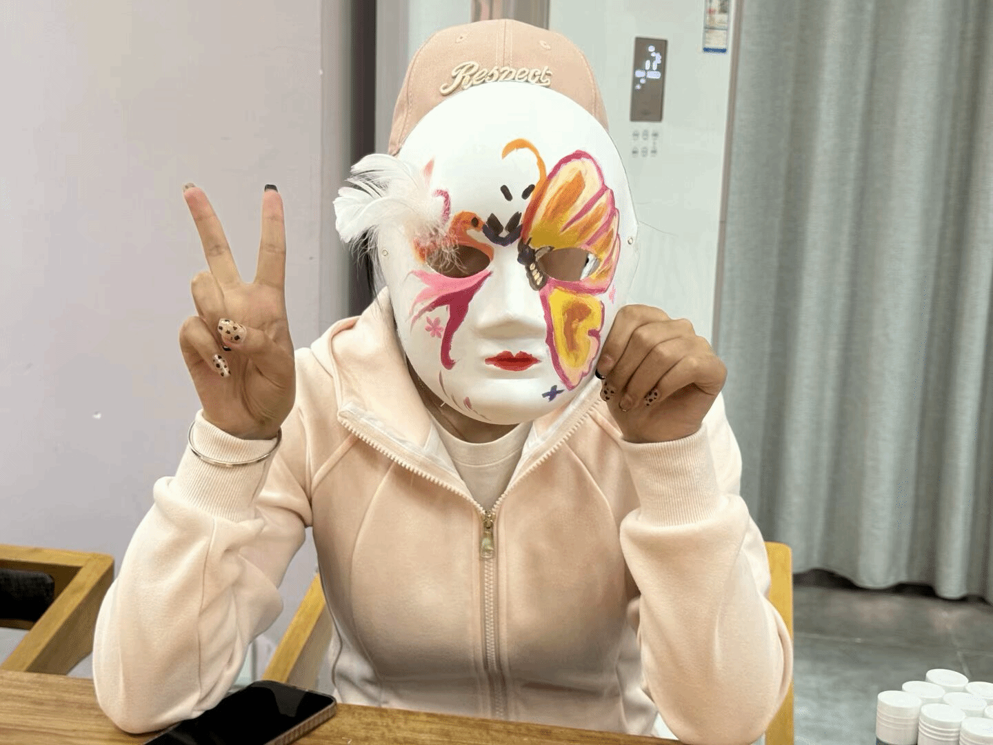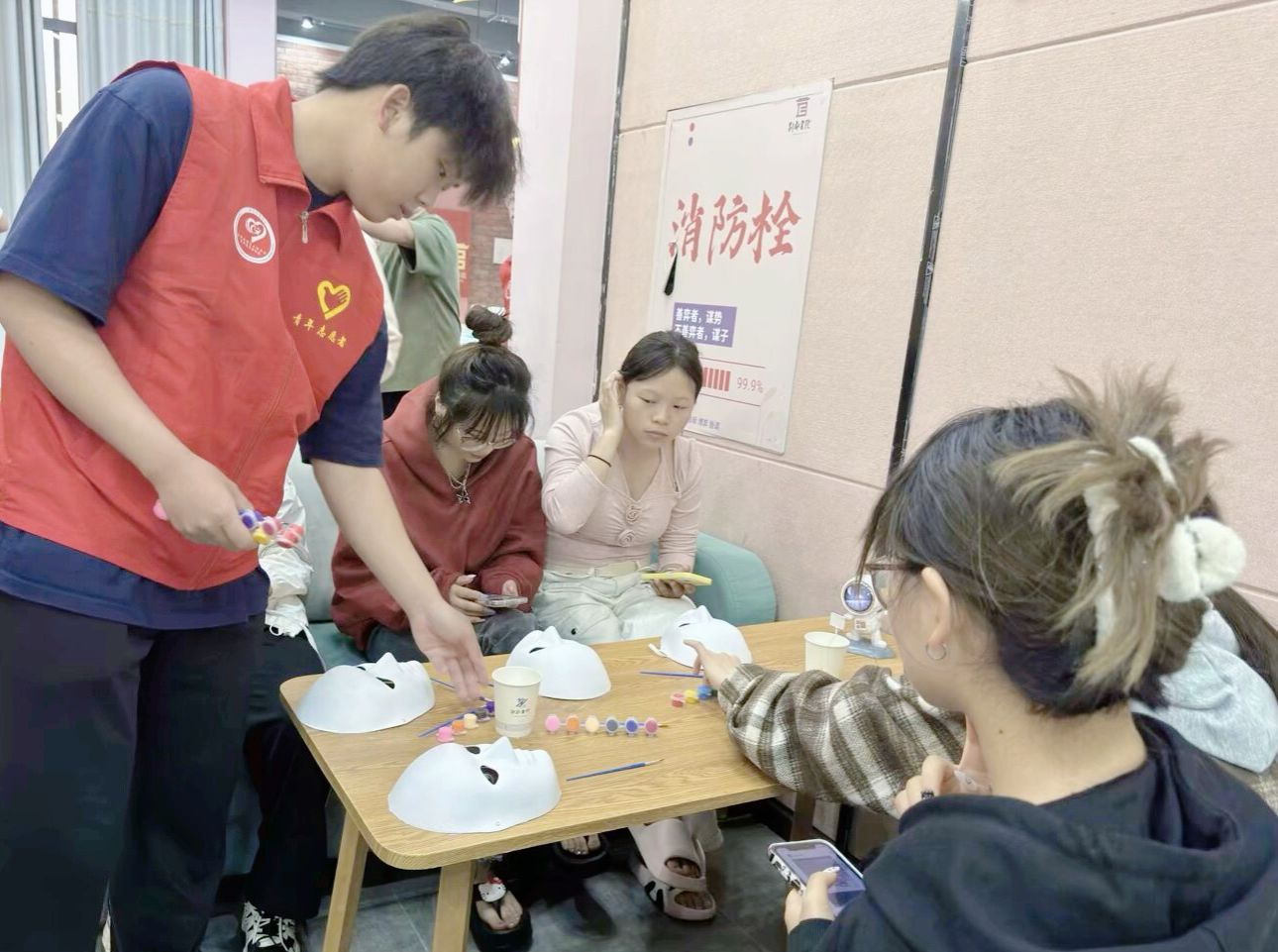 在面具制作实践环节,参与者使用空白纸浆面具、羽毛、亮片、颜料等材料自由创作。志愿者俯身穿梭指导,手把手雕琢色彩层次与立体装饰,让情感在面具纹理间悄然生长 。有位同学用暗红色与金色绘制出火焰纹路,象征“走出低谷的勇气”;另外一位同学则以蓝紫色渐变搭配星月贴纸,表达“对未来的浪漫憧憬”......
