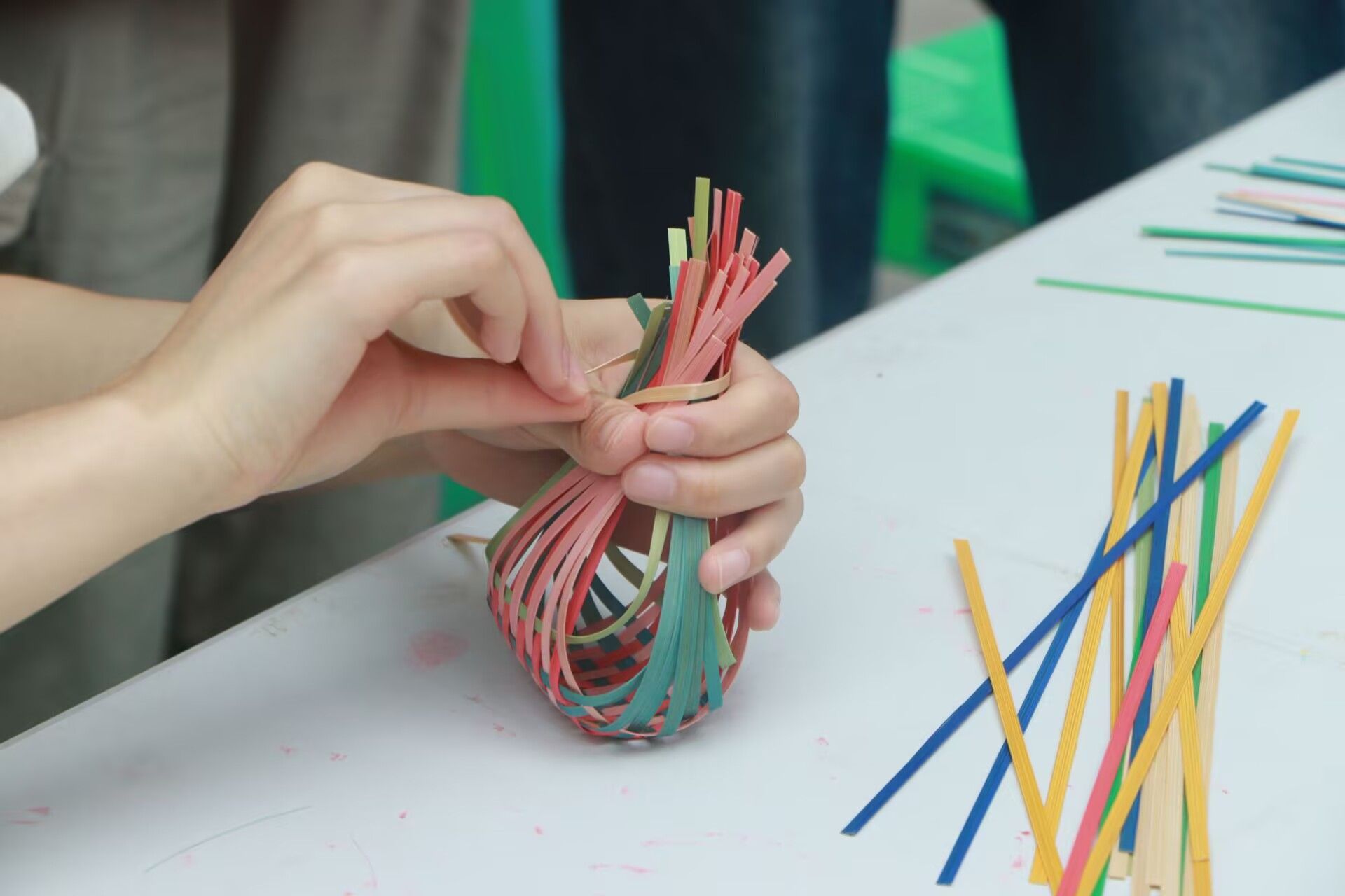 “沙坪坝刺绣・字绣霓裳”与“江津竹编・字织光影”体验区同样人气高涨。参与者用彩线在绢布上绣出“福”“渝”等单字,或用染色竹篾编织“竹”“江”等汉字图案。得益于前期非遗传承人线下工作坊的培训,志愿者们在现场熟练示范刺绣针法与竹编技法,引导新手通过经纬交错的编织或细密的针脚,让汉字在绢布与竹篾间呈现出立体美感。