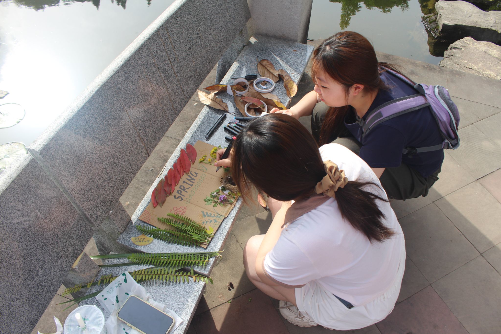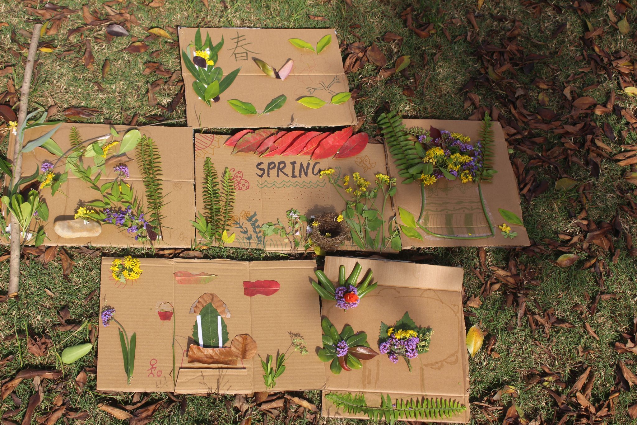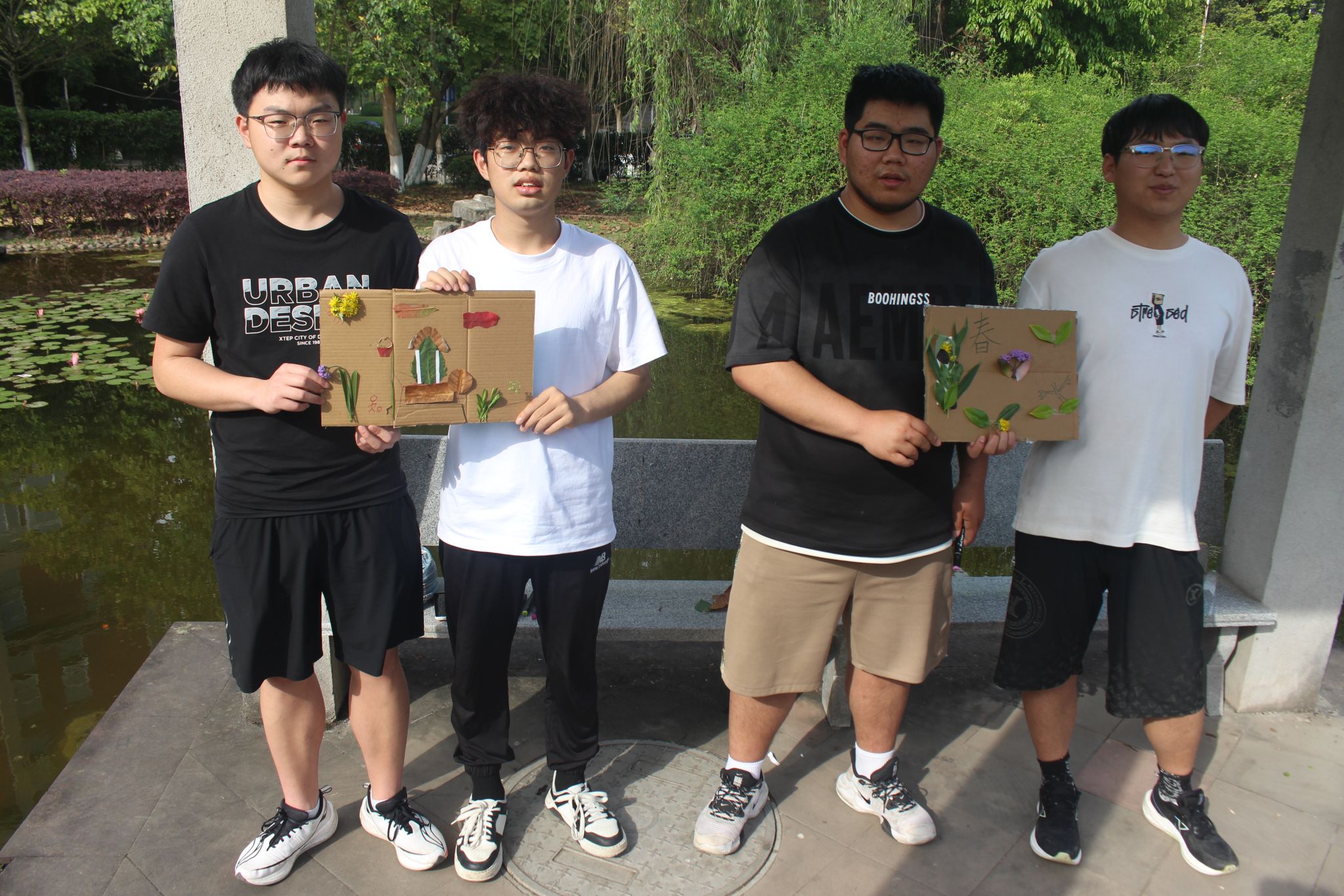 破冰游戏以自然元素卡片为媒,学生通过“树木”、“花朵”等意象快速匹配组队,在欢声笑语中打破专业壁垒。随后,各小组奔赴双子湖畔开展自然探索,在“零破坏”原则指引下,学生们俯身轻拾落叶、花瓣等自然馈赠,以指尖触碰感知生态肌理。活动高潮聚焦于“春之拼图”与“植物标本”两大创意工坊——学生们将零落残叶重组为层叠山影、翩跹蝶群等主题拼贴画,以大地为画布诠释季节更迭;现场作品或灵动写意,或质朴拙雅,将劳动巧思与自然美学凝于方寸之间。