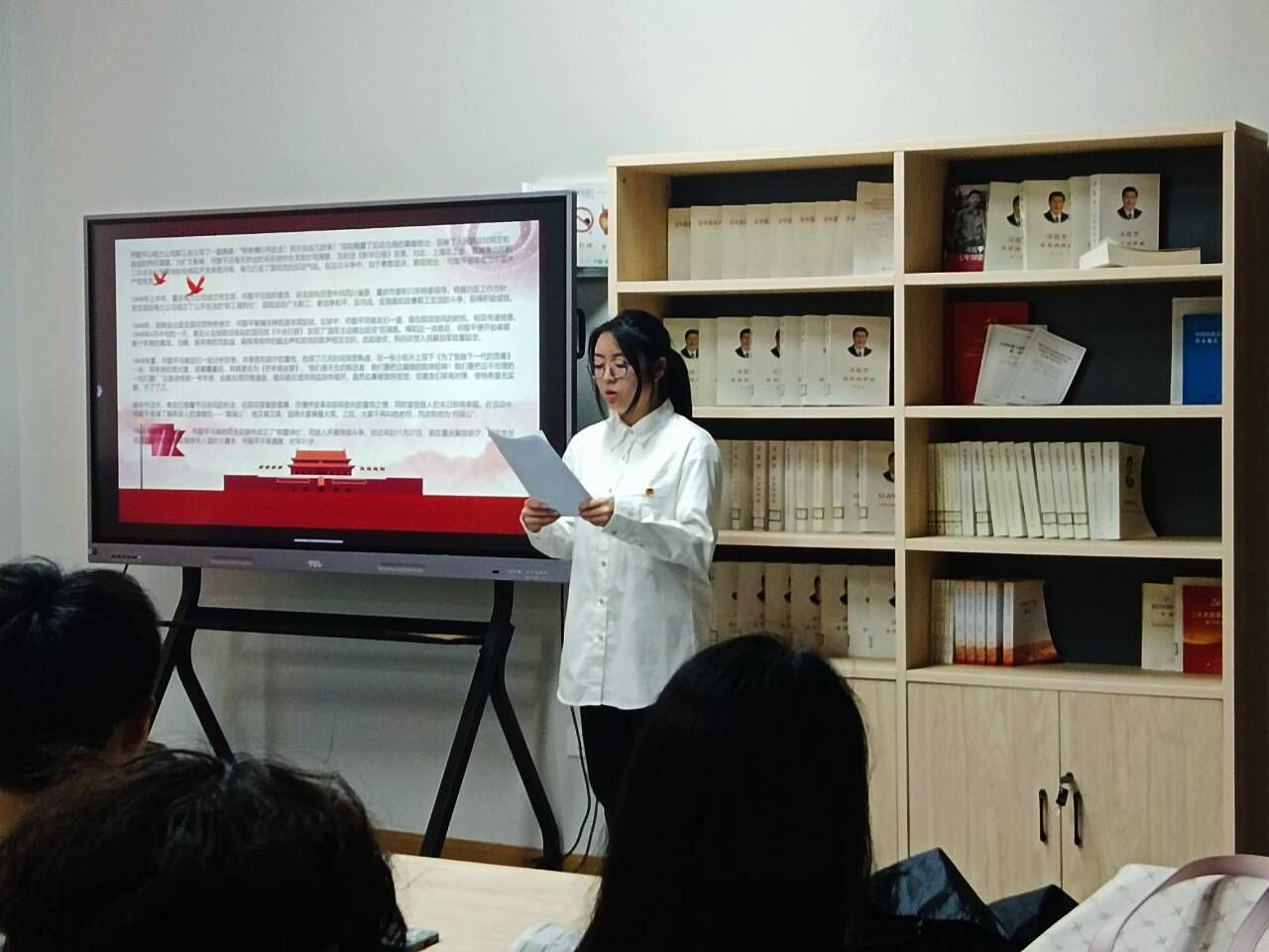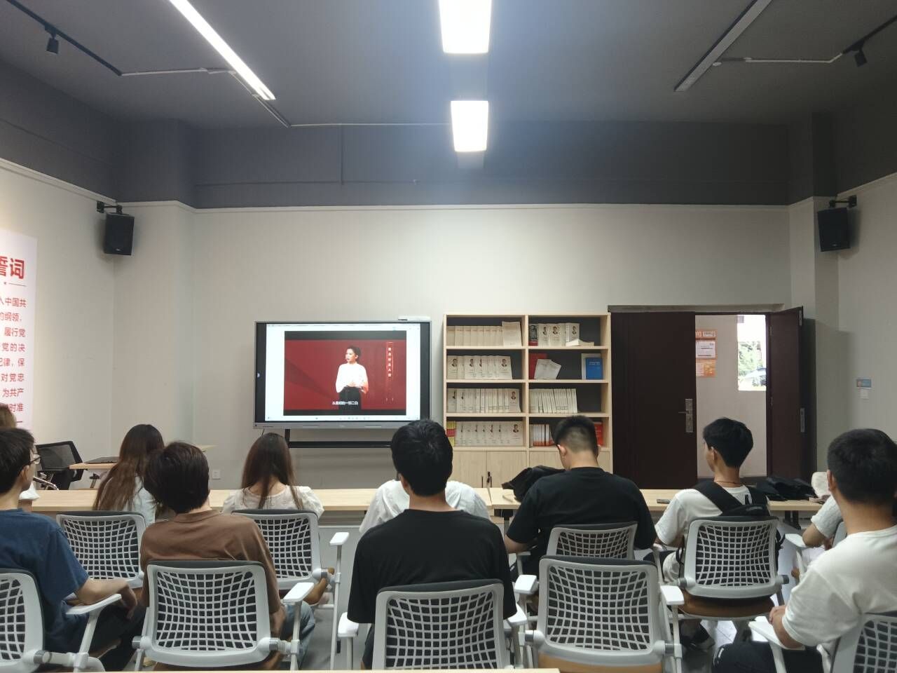 活动接近尾声,全体活动人员一同观看了北京理工大学青马班学生“我为什么加入中国共产党”的演讲。视频中,北理工刘金佳通过讲诉她入党启蒙师徐特立校长和刘福水教授的故事,传递出了对党的深厚情感和为党的事业奋斗的决心,引发了现场强烈的情感共鸣,进一步坚定了大家加入中国共产党的信念。活动最后,全体参与人员共同合影留念,用镜头铭记对党的忠心。