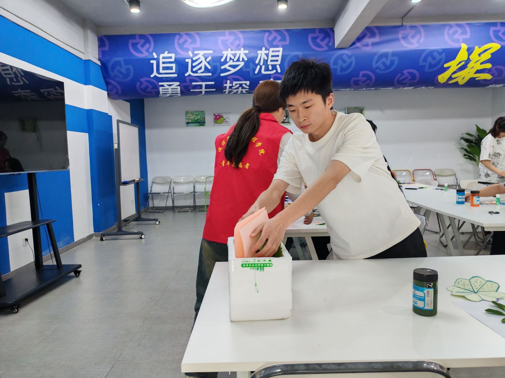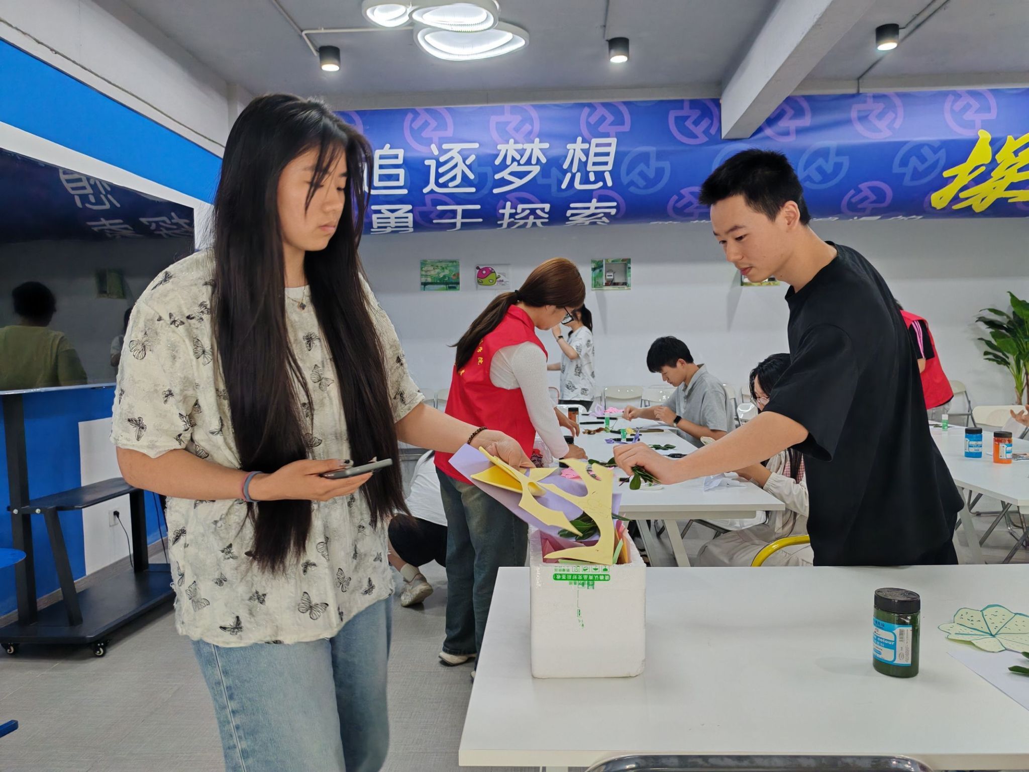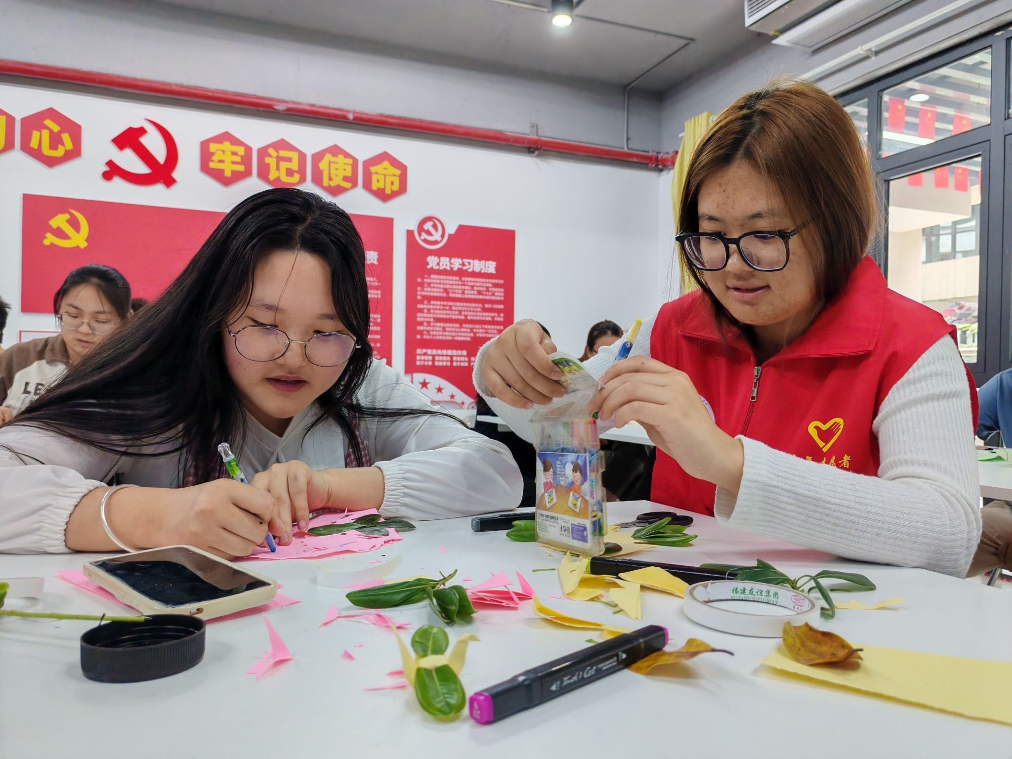 紧接着,志愿者为大家分发废弃树叶,让大家根据树叶的形状和颜色,对废弃树叶进行改造,在纸上进行构思。有人创作拼贴画,有人用颜料写下环保标语,勾勒出独特的环保画卷。志愿者们协助搭配颜料,大家都积极分享自己的创作思路与对环保的理解,现场气氛热烈。