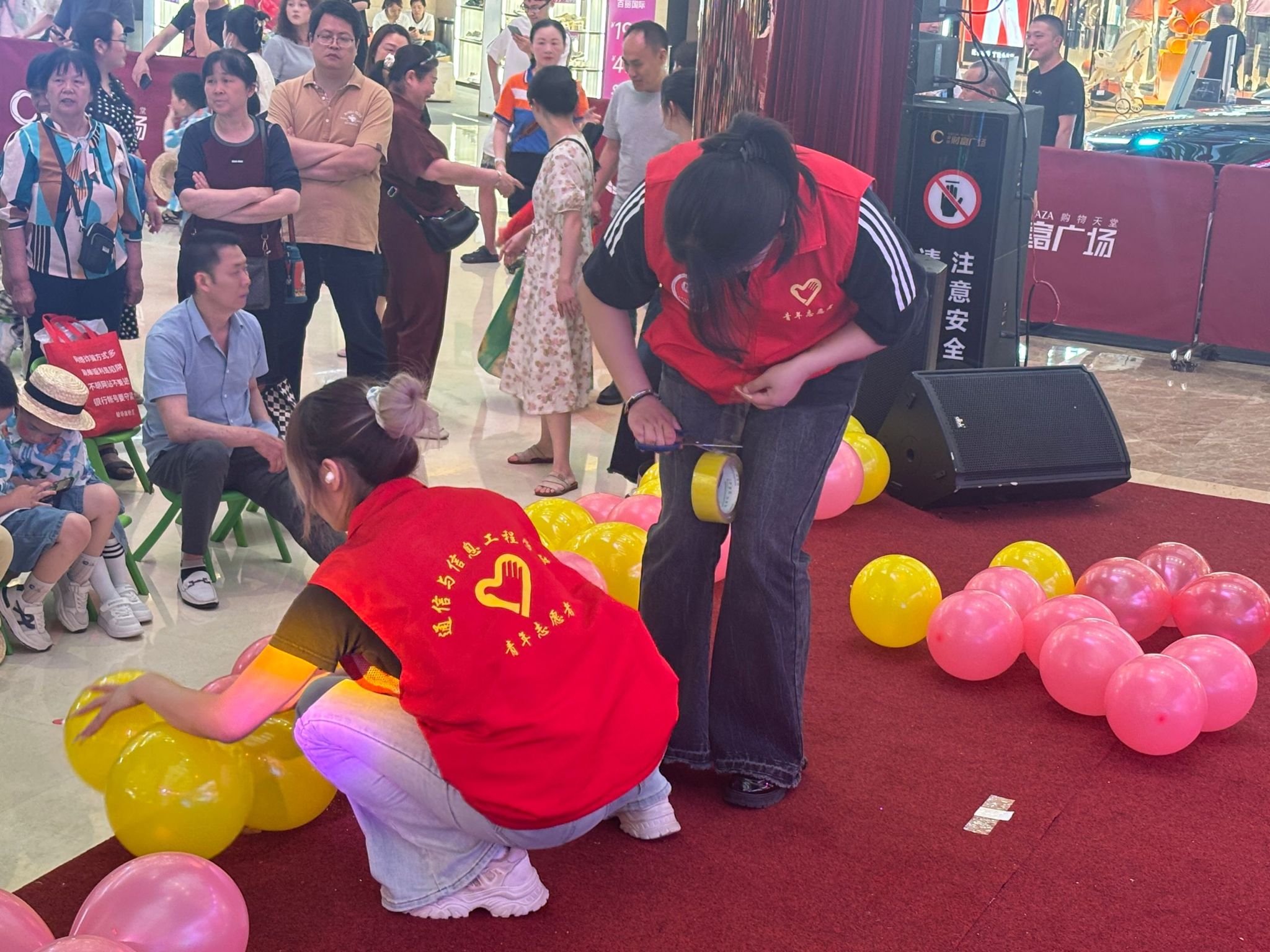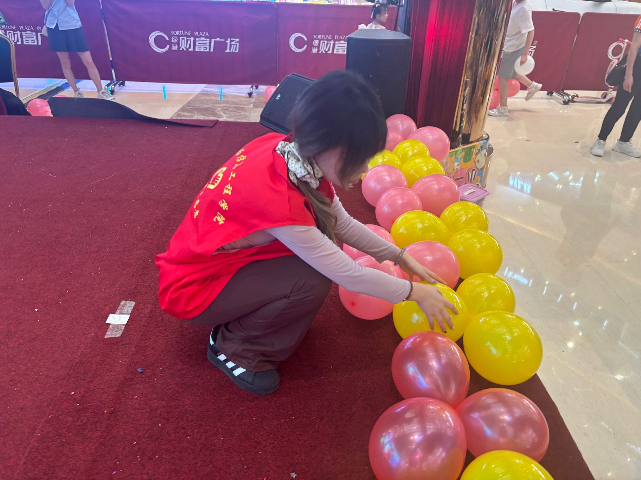活动当天,志愿者们早早来到舞台场地,并迅速投入到工作中。大家分工明确,有的志愿者负责布置场地,将色彩斑斓的气球精心排列布置在舞台周围,为舞台增添活泼氛围;有的志愿者们化身“专业化妆师”。他们耐心地为每一位小朋友化着精致的妆容,根据表演节目类型,为古风节目的小朋友涂上自然的粉底,画上弯弯的柳叶眉;为表演嘻哈的小朋友打造帅气的妆容,勾勒出坚毅的眉形。志愿者们还不时和小朋友们聊天,缓解他们的紧张情绪,让小朋友们在轻松愉快的氛围中完成妆容打造。看着镜子里美美的自己,小朋友们开心得手舞足蹈,脸上洋溢着灿烂的笑容。