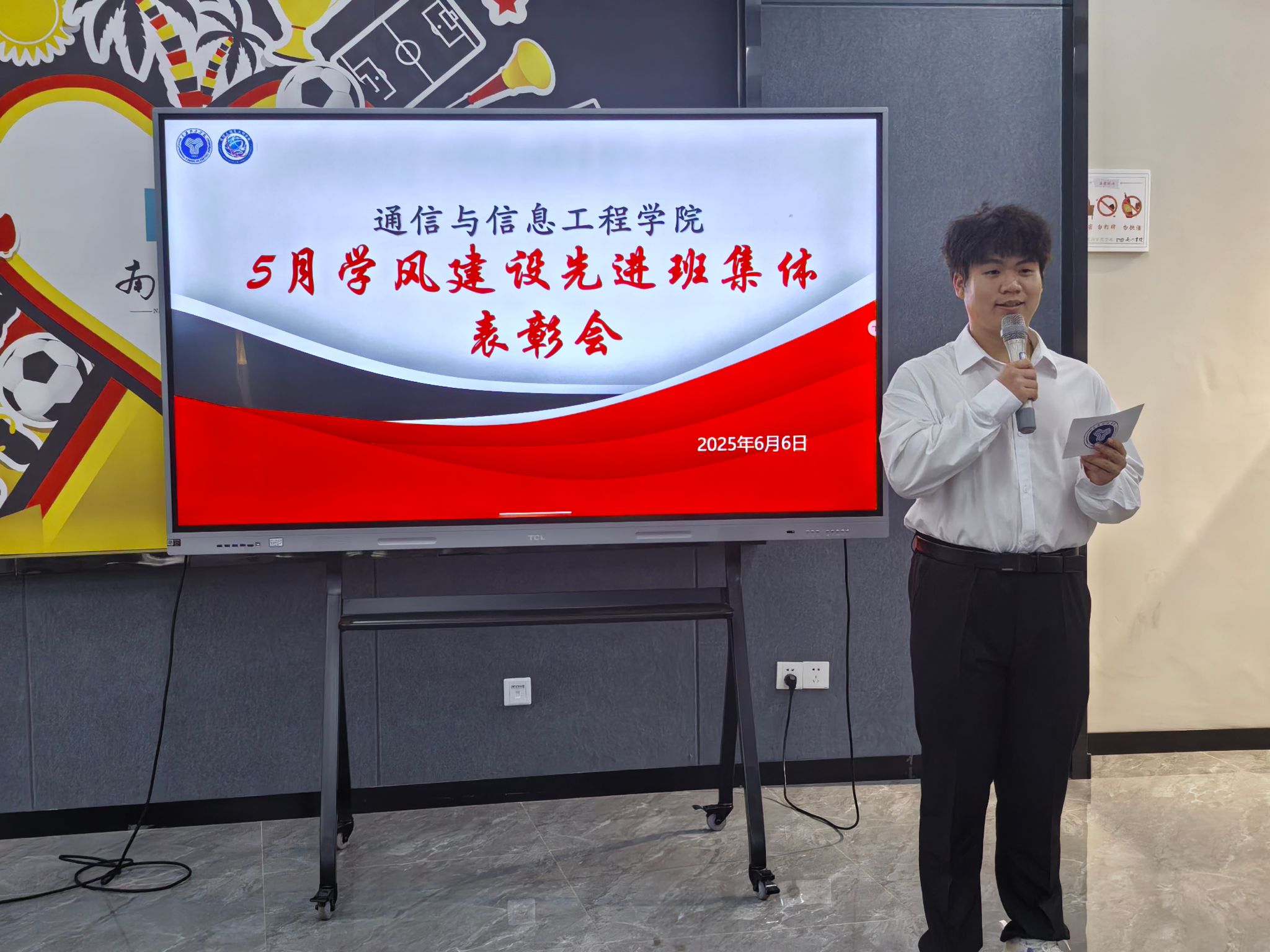 为表彰先进,树立榜样,进一步加强学风建设,营造良好的学习氛围,6月6日,通信与信息工程学院在南湖书院隆重举行5月流动红旗学风班级表彰大会。电子信息调研室费莉副教授、通信与信息工程学院 2024 级辅导员王艺老师与尹琼瑶老师出席活动,全体学生共同参与见证荣誉时刻。