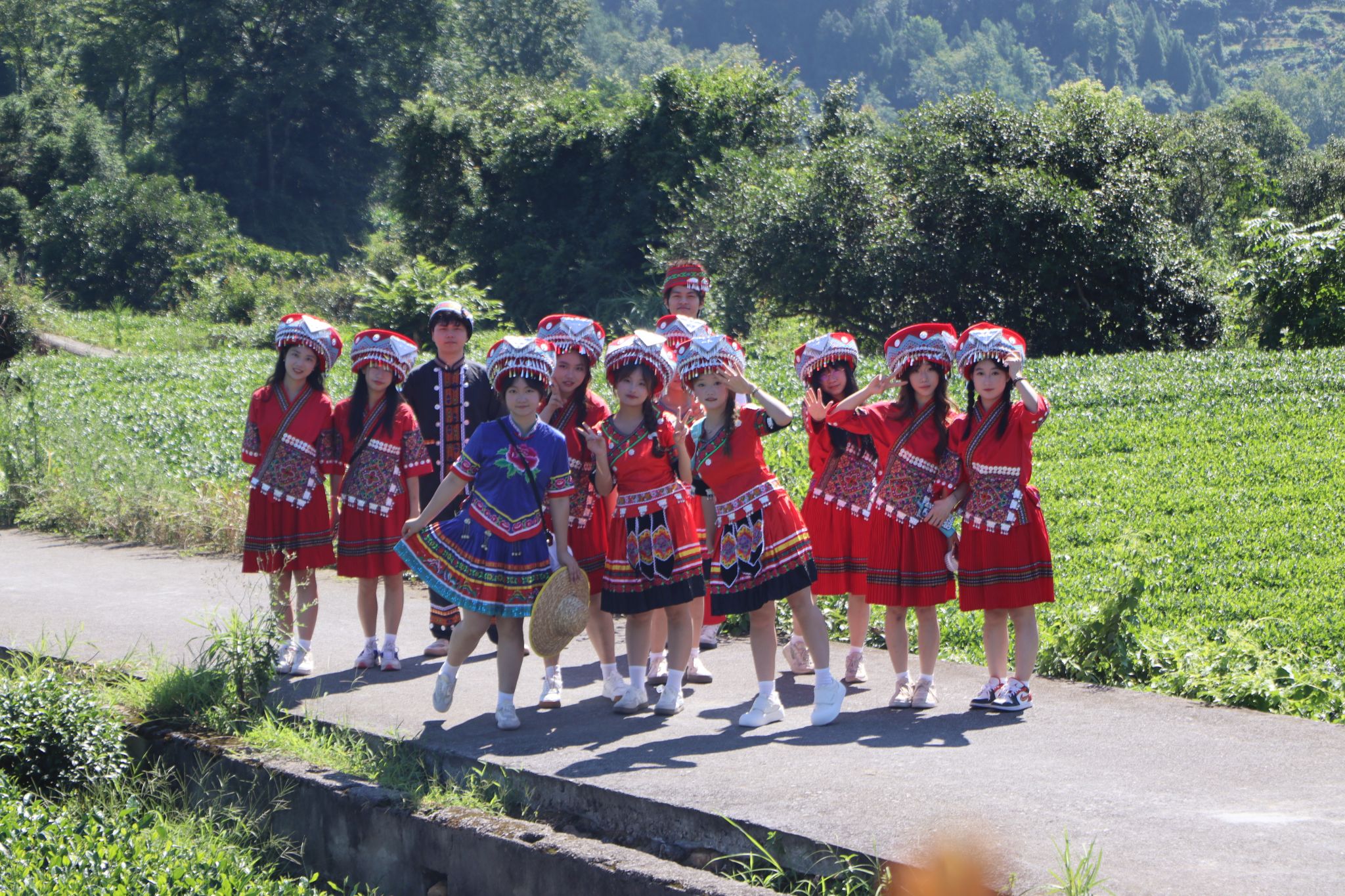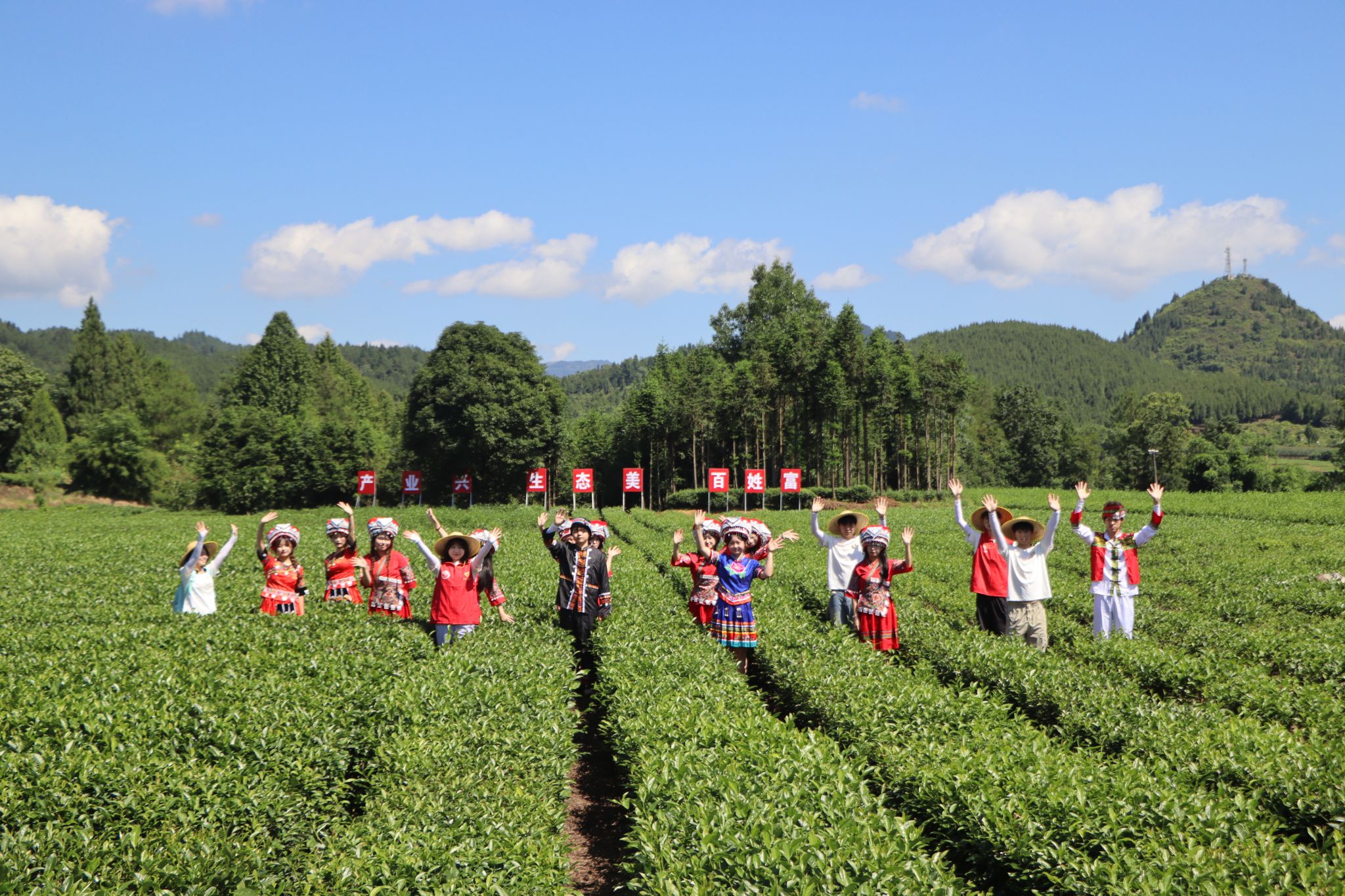 在峨溶镇政府工作人员白元节同志的悉心指引下,“峨溶茶探”乡村振兴促进团顺利抵达大坪茶园基地,开启了一场民族文化与采茶体验之旅。团队成员身着苗族百褶裙和土家族织锦,银冠流苏轻触翠芽,传统刺绣与茶青交相辉映。他们在采摘鲜嫩茶叶的过程中,感受着指尖与茶芽的触碰,仿佛在与自然低语,尽享民族风情与茶韵交融之美。