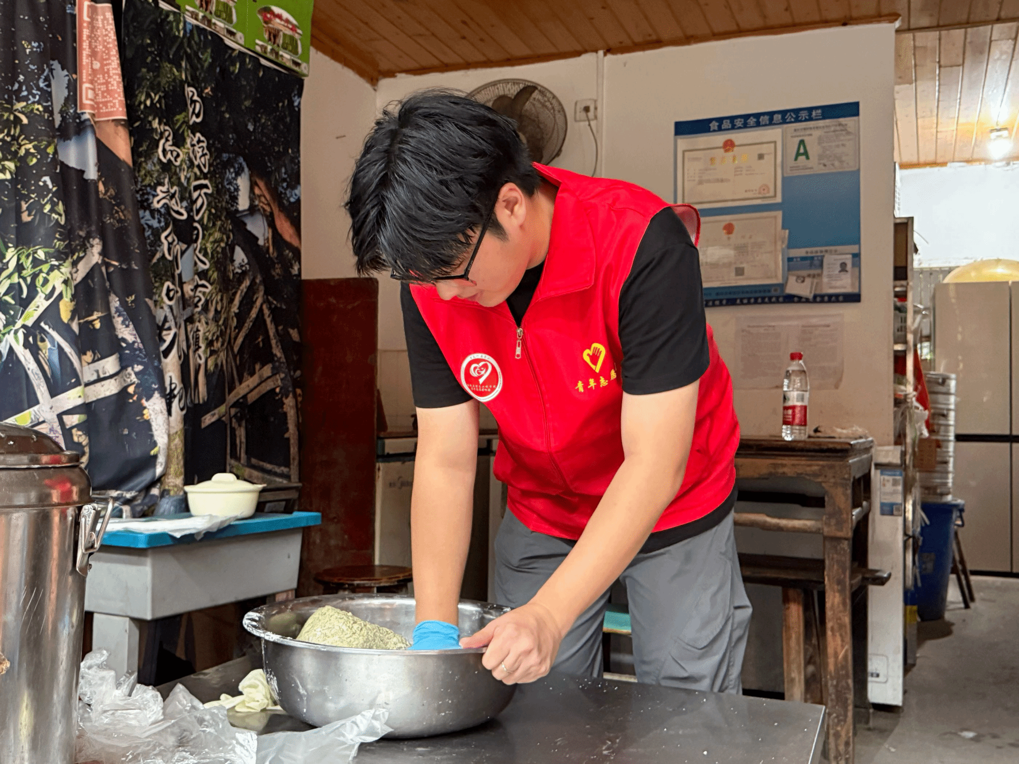 清洗仙茅叶时,李老师说:“叶片要新鲜,绒毛得洗净,不然会涩。”这句叮嘱像把钥匙,打开了我对非遗的理解。和糯米粉时手腕发酸,包馅时总捏不紧边,老师手把手教我们“拇指推、食指收”,指尖的老茧蹭过我的手背,那是岁月磨出的技艺印记。当自己做的叶儿粑在蒸笼里渐渐鼓胀,忽然明白:非遗的珍贵,不在“古老”二字,而在一代代人耐着性子,把寻常食材变成文化符号的坚守。这堂课教会我的,不只是手艺,更是对“慢”与“专”的敬畏。——黄蓉