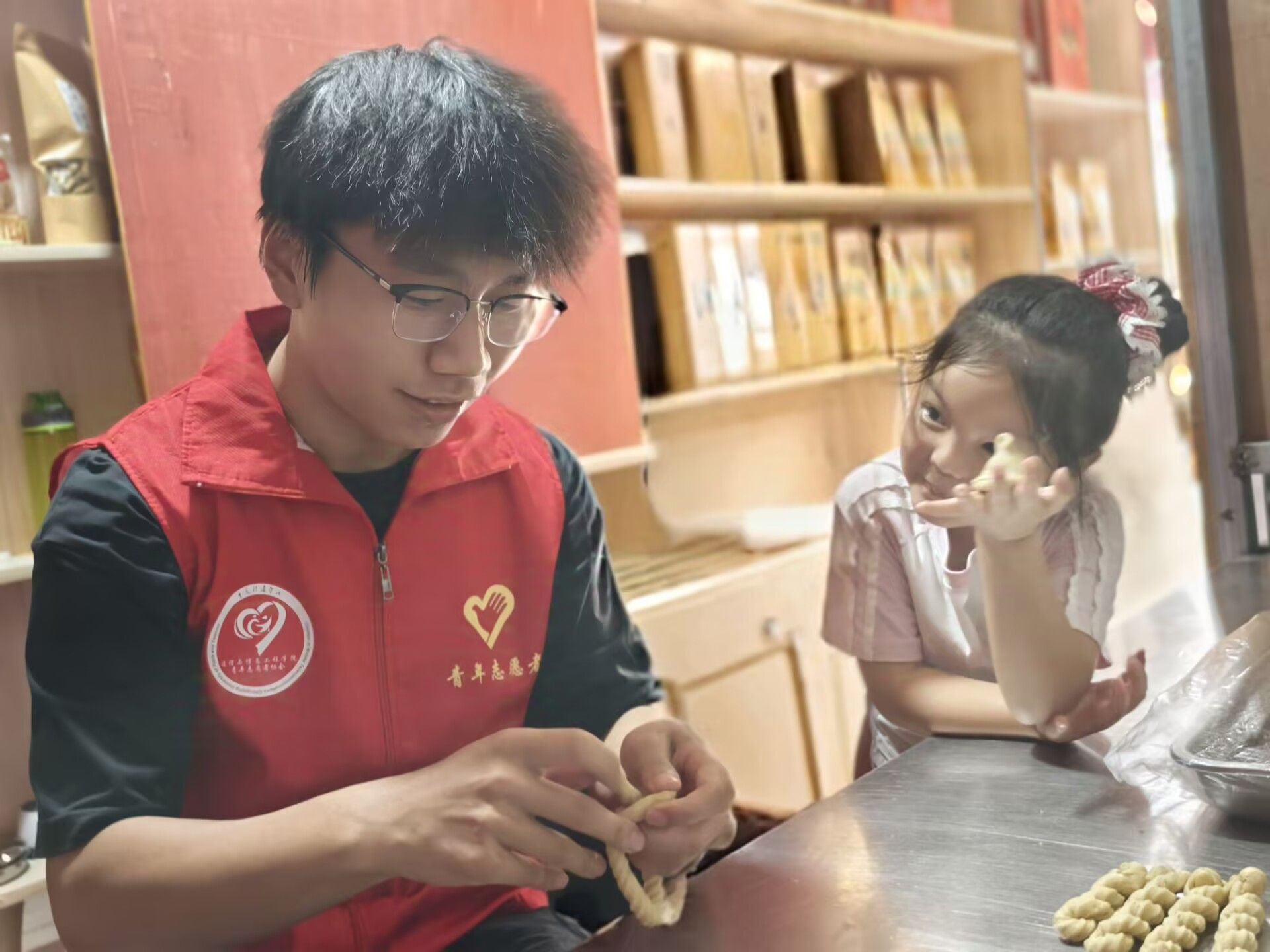 重庆移通学院“万灵赤脉,红韵传薪”党史学习教育团在重庆市万里镇路孔古镇开展了一场非遗传承实践活动,全队15民同学在麻饼非遗传承人赵嬢嬢,叶儿粑非遗传承人李春丽,麻花非遗传承人赵明虎的指导下亲自体验非遗的制作流程感受非遗魅力。这次活动不仅让团队成员品尝到非遗的美味,同时同学们更加了解非遗背后的秘密。