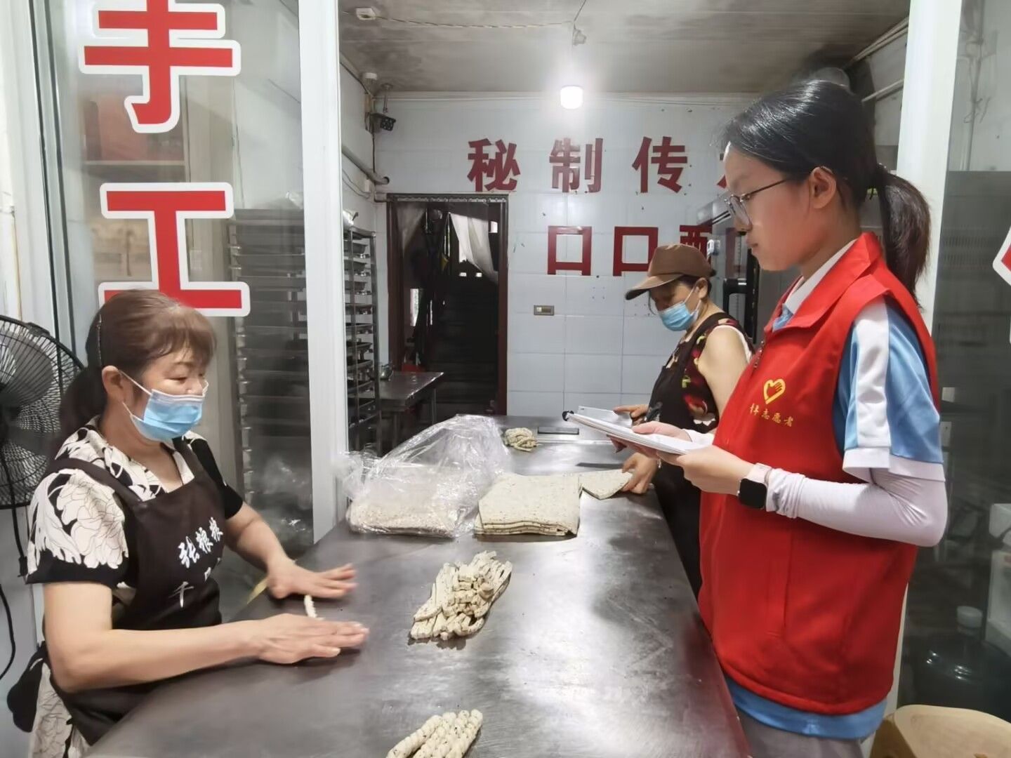 清晨的阳光里,第一组队员走进张粮粮麻花店,货架上的麻花种类丰富,香气扑面而来。非遗传人张仁平女士详细讲解了麻花的全流程制作:从面粉的等级筛选,到芝麻、冰糖等馅料的比例调配,再到烘烤时柴火与温度的精准控制,每一步都延续着家族三代人的工艺标准。“这饼子承载着镇上人的记忆。”张女士坦言,如今快节奏生活让速食占据更多市场,传统糕点受众渐少。但她始终坚持手工制作,希望通过不断创新口味和包装,让年轻人重新爱上这口老味道。