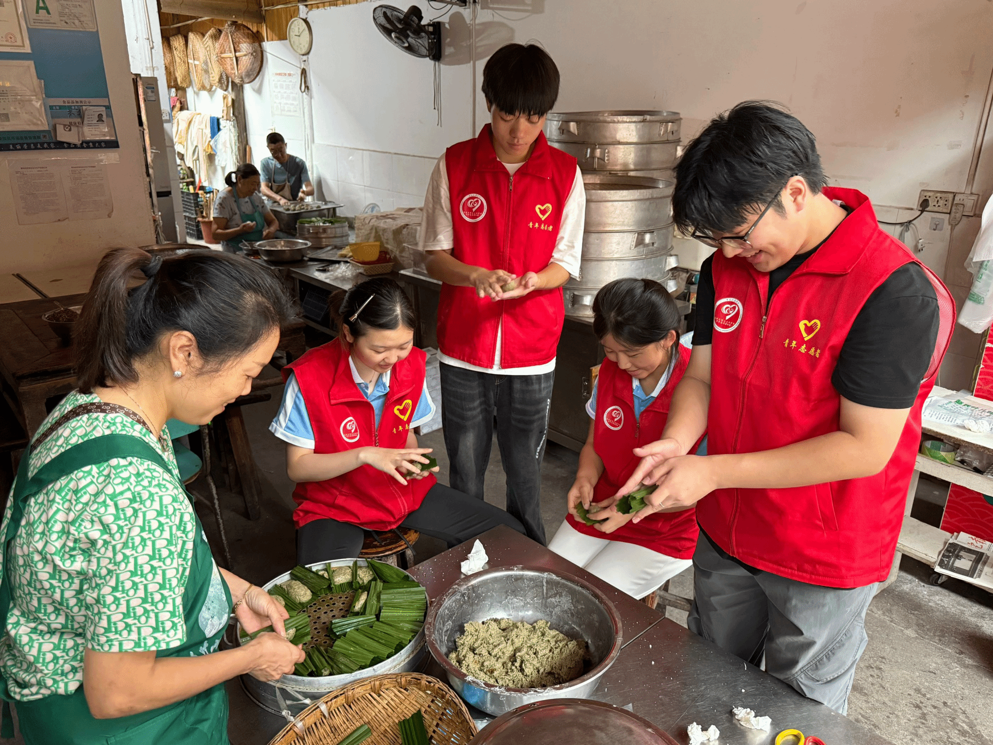 沿溪的作坊里,第二组队员正跟着非遗传承人李春利老师学习叶儿粑制作:清洗仙茅叶和艾草,将艾草汁混入米面团,揉入红糖后搓成小团,再用仙茅叶包裹成型。这套工艺是李老师与她婆婆携手改良的成果,既保留了传统风味,又契合现代人的口感需求。
