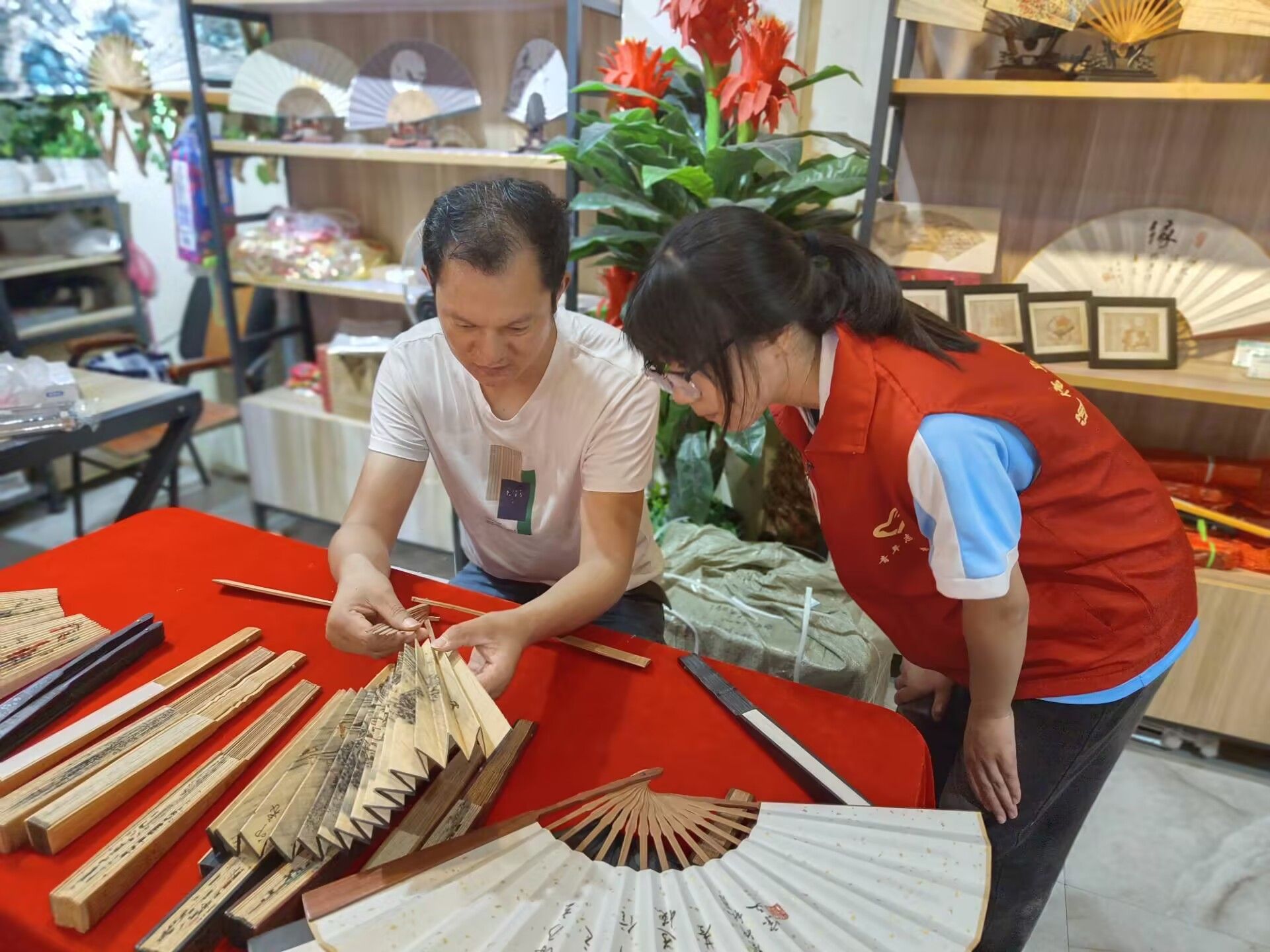 第三组队员的调研地点在夏布扇工坊,刚进门就被墙上挂着的各式扇子吸引:有的扇面画着古镇石桥,有的印着荣昌剪纸纹样,扇骨则透着竹子的原色光泽。非遗传承赵明虎拿起一根扇骨介绍:“这是三年生的楠竹,要先在阴凉处晾半年,去掉水分才不会开裂,打磨到0.3厘米厚,握着手感才舒服。”