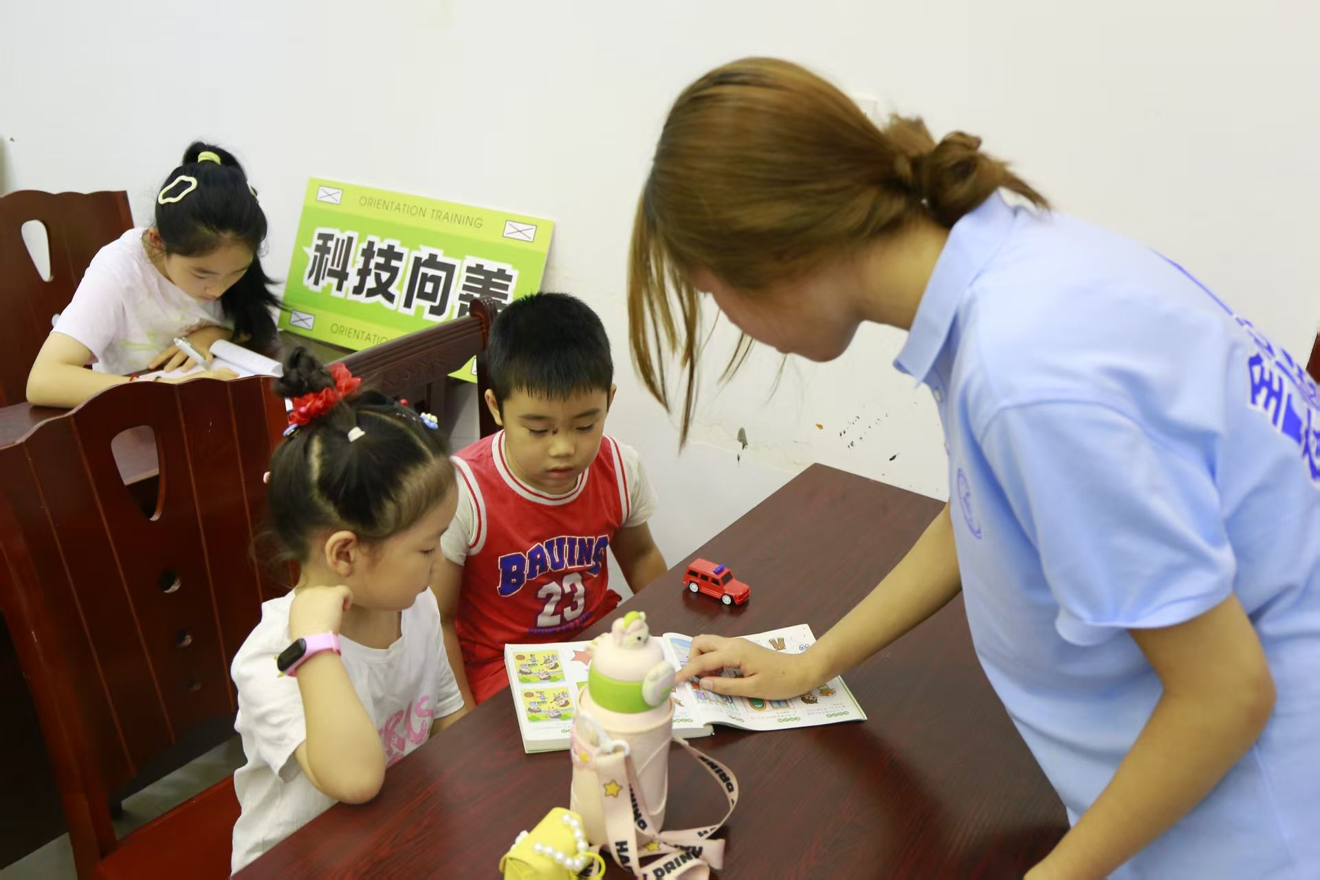 作业辅导则是更贴近孩子日常的"战场"。每天上午的两小时,活动室里总是热闹又有序,小朋友们有的在订正数学错题,有的在练习拼音书写,还有的捧着课外书看得入迷。冯灿同学巡回指点,红笔在错题旁圈画,说着“这步进位错啦”“拼音要标对声调哦”,细碎叮嘱里,不时会有“原来是这样!”的惊讶。