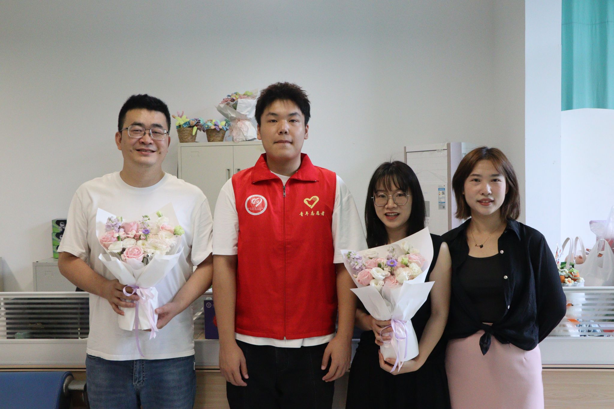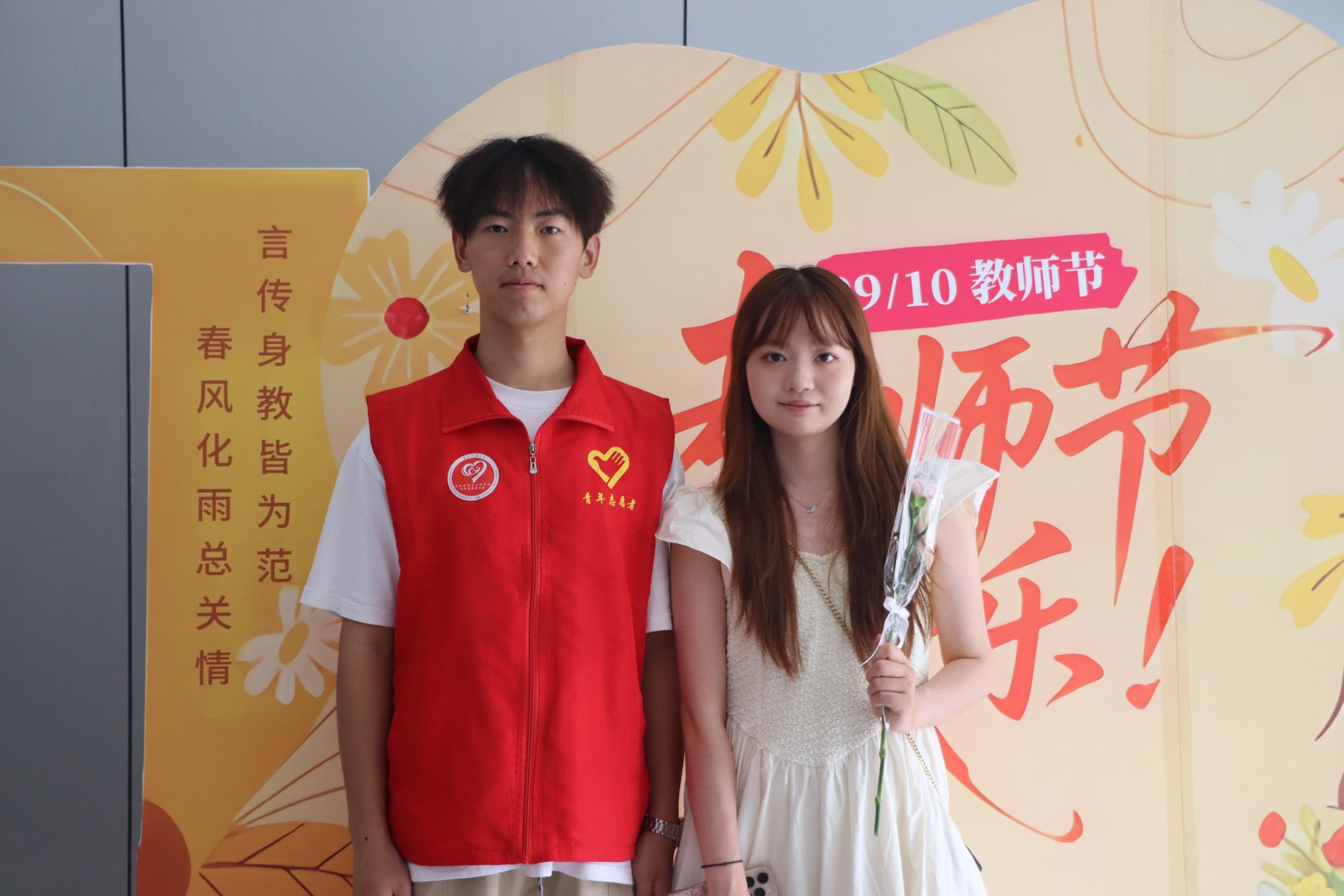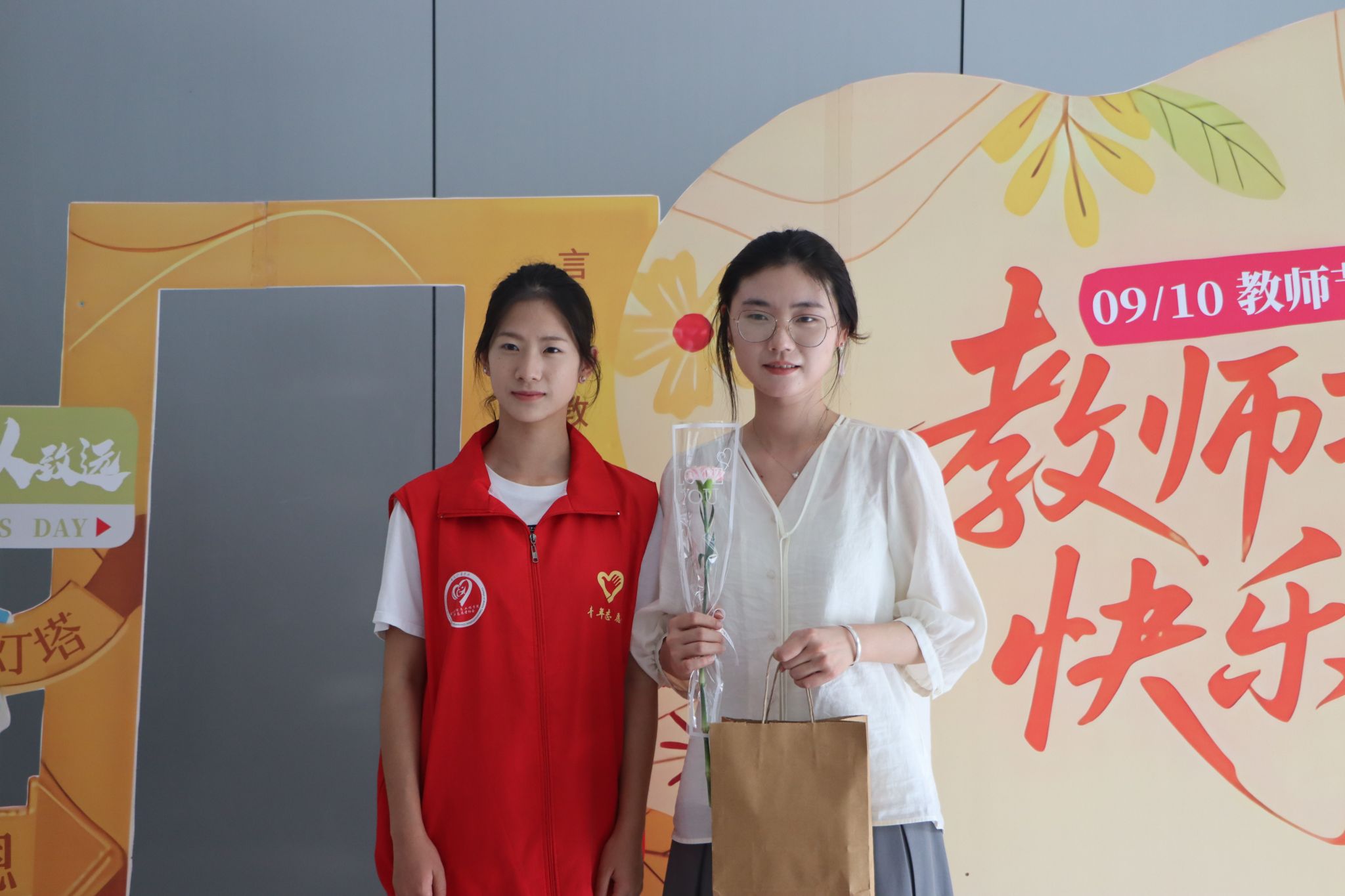 活动在欢快的氛围中徐徐展开,空气中弥漫着暖意融融的温情。志愿者代表向全体教师致以节日的诚挚慰问和美好祝福,感谢他们以渊博的学识和无私的奉献,滋养着一代代学子的成长,为学院发展注入不竭动力.随后,志愿者们依次为老师们献上鲜花,一束束芬芳饱含着学生对师恩的深深感激与崇高敬意。