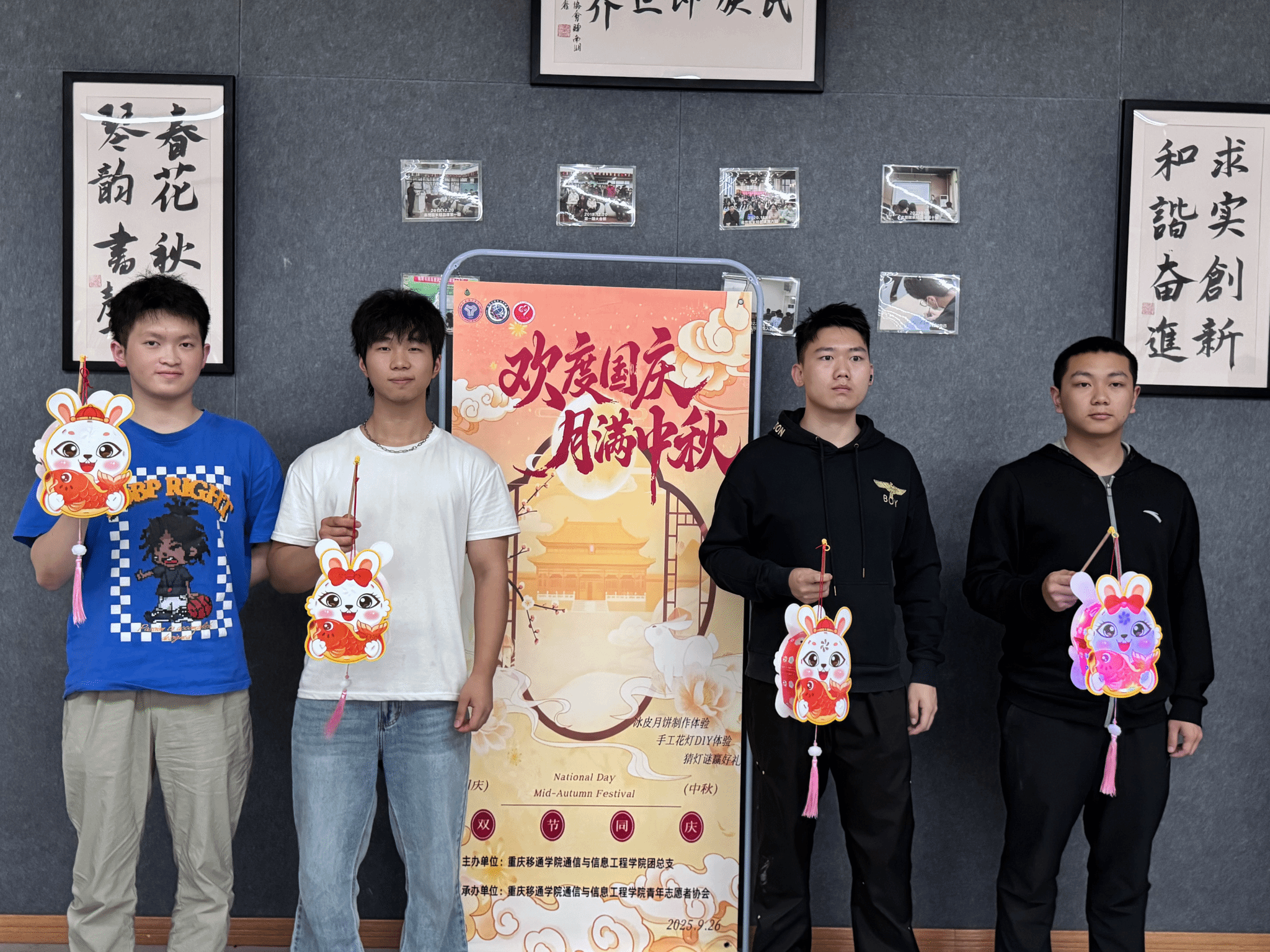 2025年9月26日,通信与信息工程学院青年志愿者协会在南湖书院智慧教室举办了一场充满活力的“月满华诞·情系家国”主题活动。学子们以文化为笔,以心意为墨,在这中秋与国庆的双重盛宴中,绘制出属于这个时代的青春篇章!