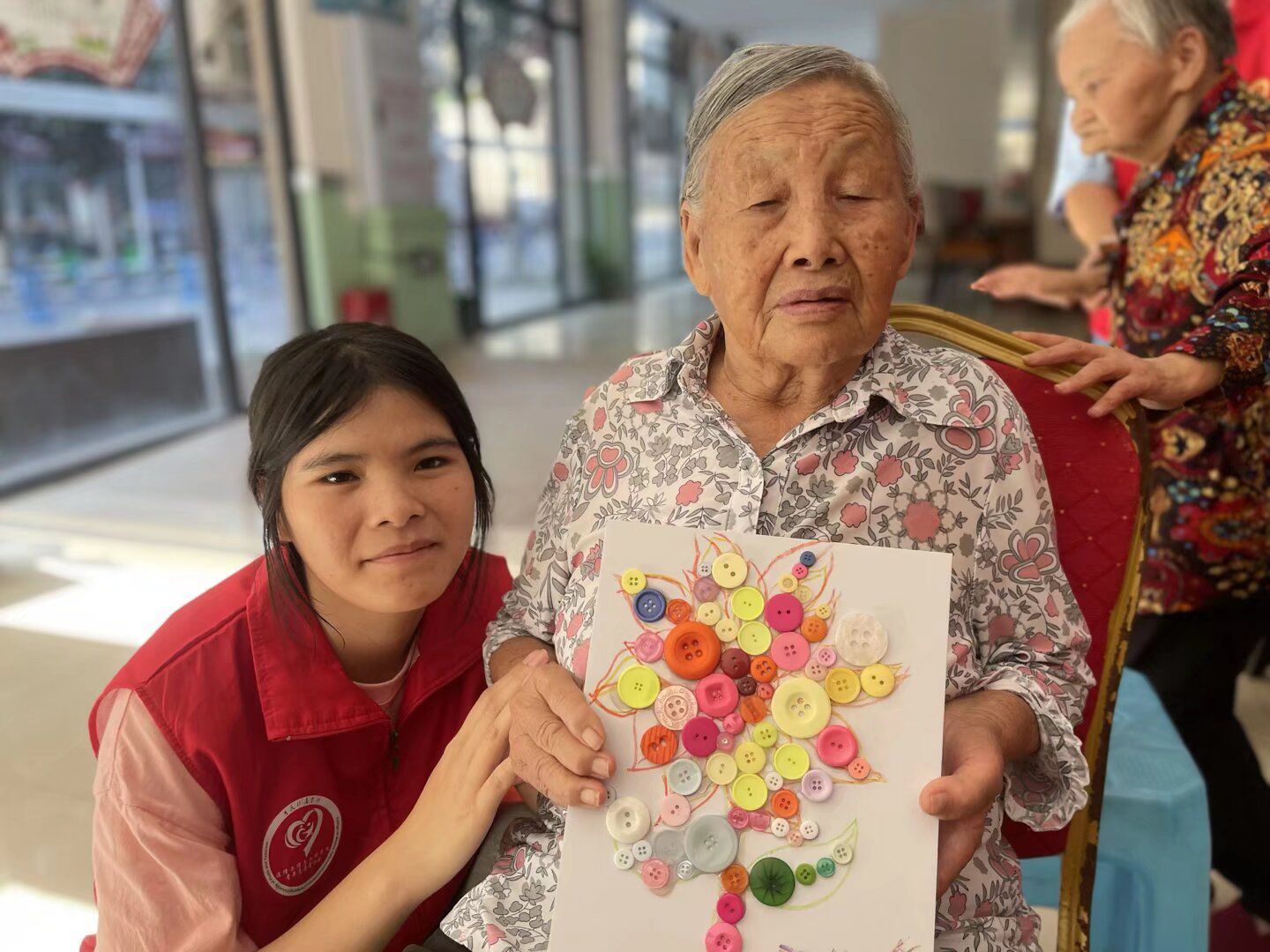 志愿者们身着红马甲向老人们介绍纽扣画的魅力及制作方法。协助老人将各色纽扣分类细心在底板上涂抹白乳胶并为老人固定底板。老人们根据心中构想的图案挑选纽扣按压在相应区域。当色彩层次不够时,志愿者们为老人提出选择同色系纽扣进行叠加以增加立体感。最后,老人们自豪地展示完成的纽扣画,现场洋溢着温馨与成就感。