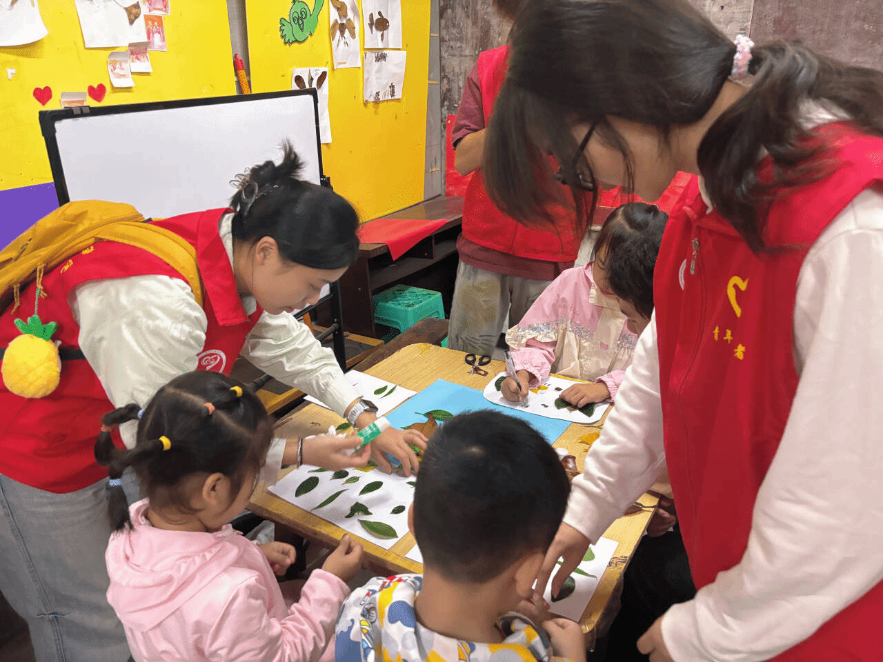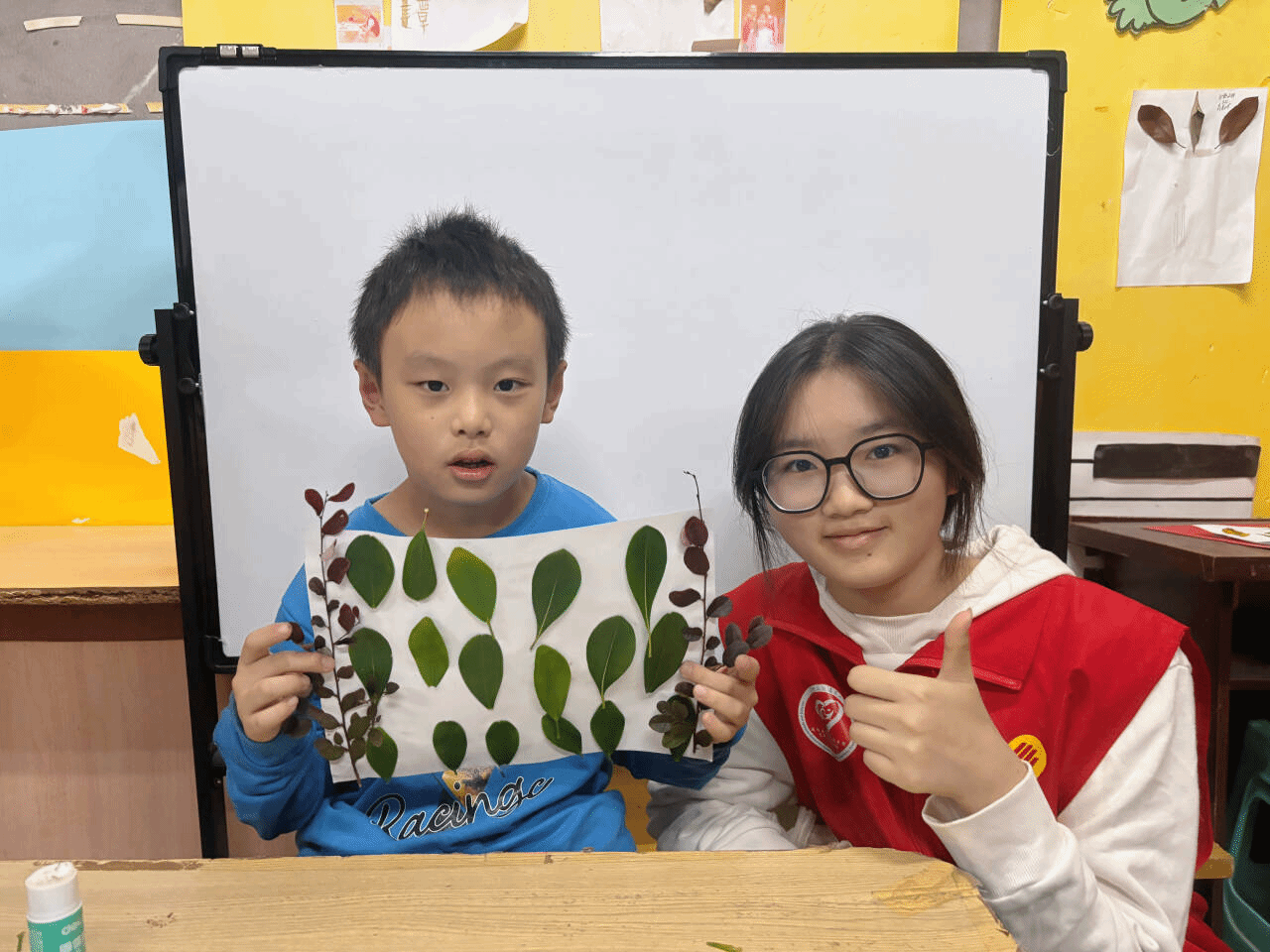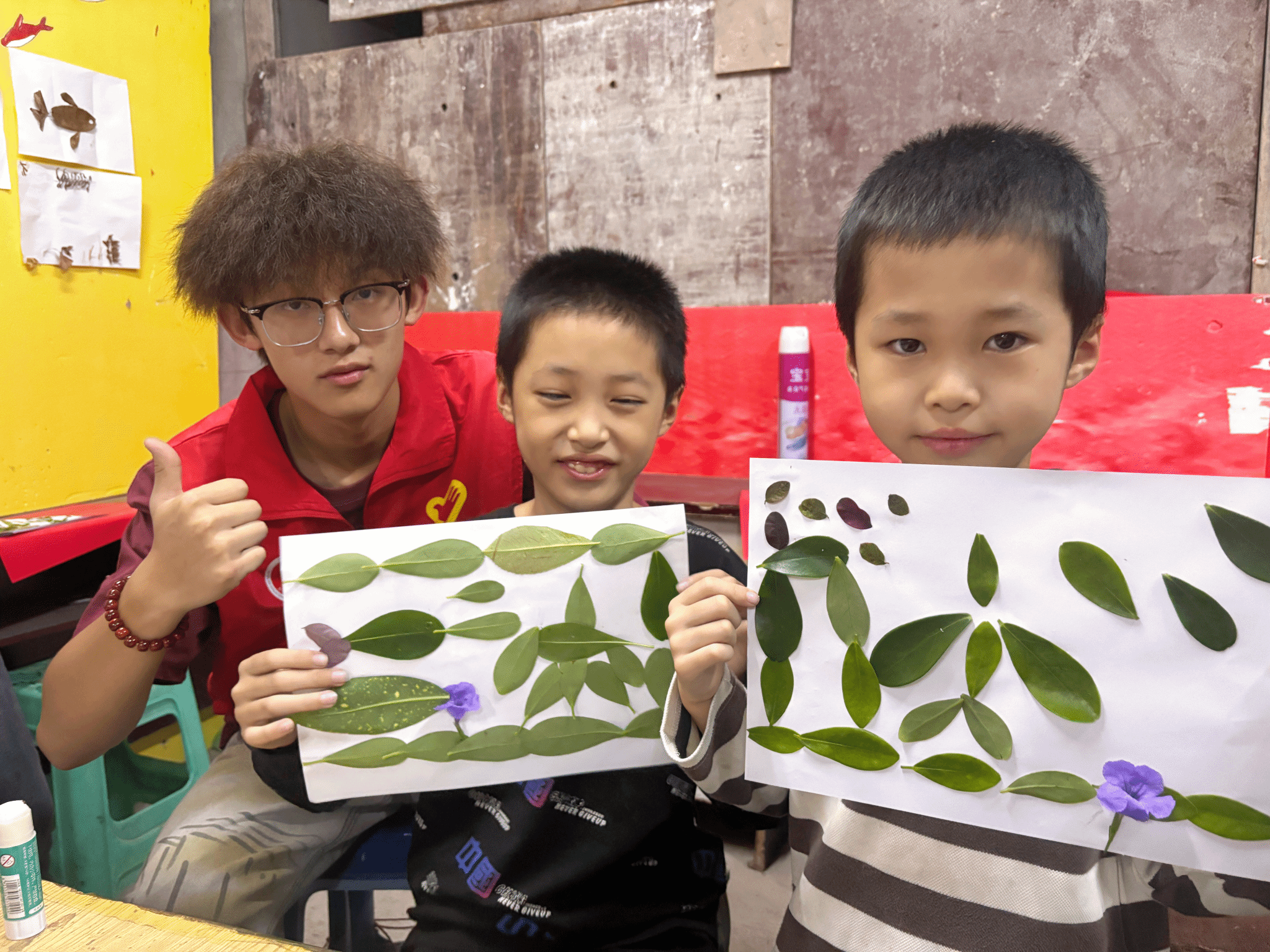 随后,志愿者们在辅导孩子完成课业后,带领他们走进自然收集落叶。孩子们充分发挥想象力,将片片落叶拼贴成生动的创意画作。志愿者适时引导,将“变废为宝”的实践与“勤俭节约”的理念相结合,让环保意识在亲手创造中悄然扎根。