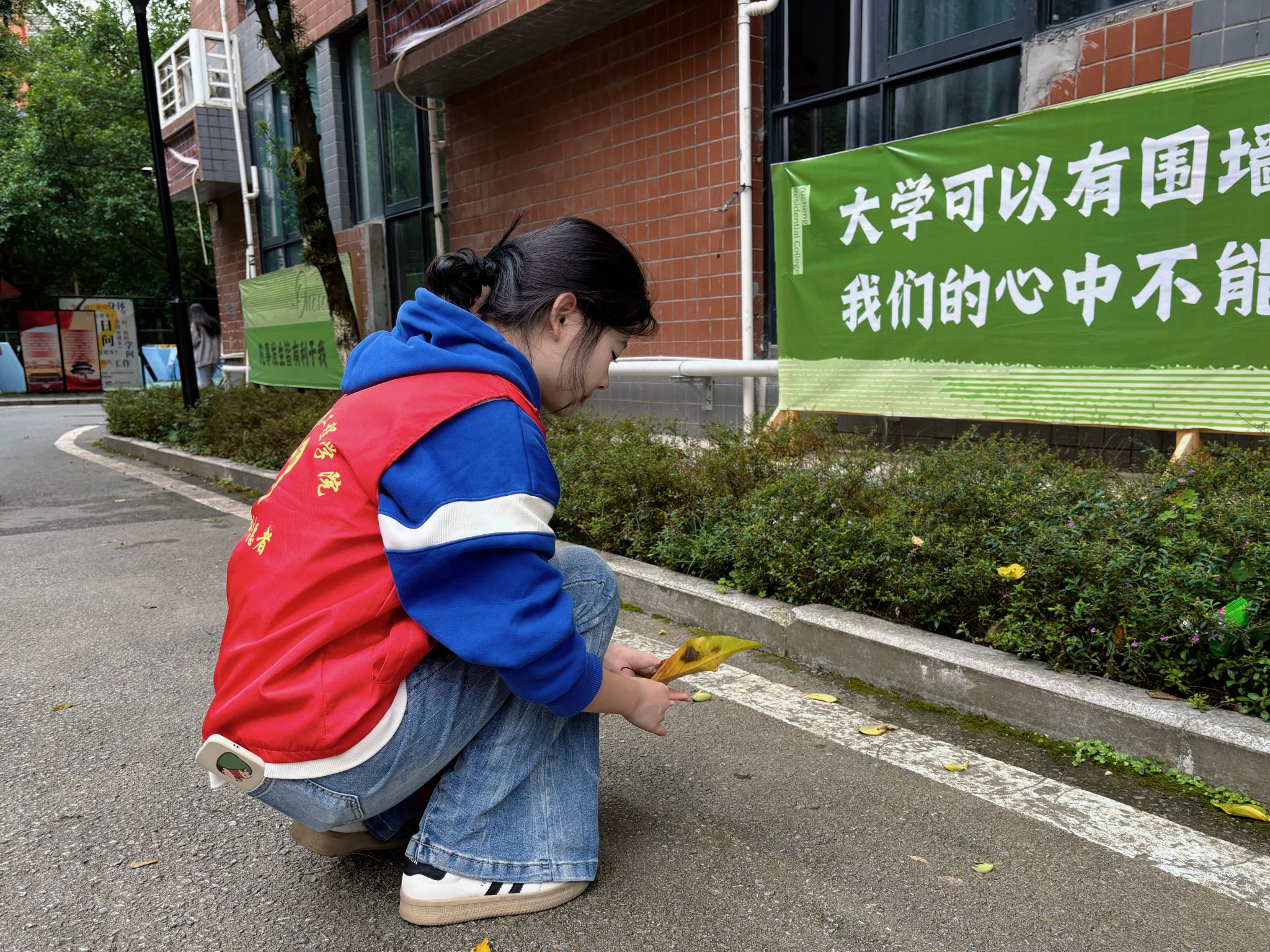 活动伊始,志愿者带领同学们走出室内,在校园林荫道、操场周边及校外安全区域分工捡拾落叶。同学们细心挑选叶片完整、纹理清晰的素材,在亲近自然的过程中践行环保理念,为手工创作储备材料。