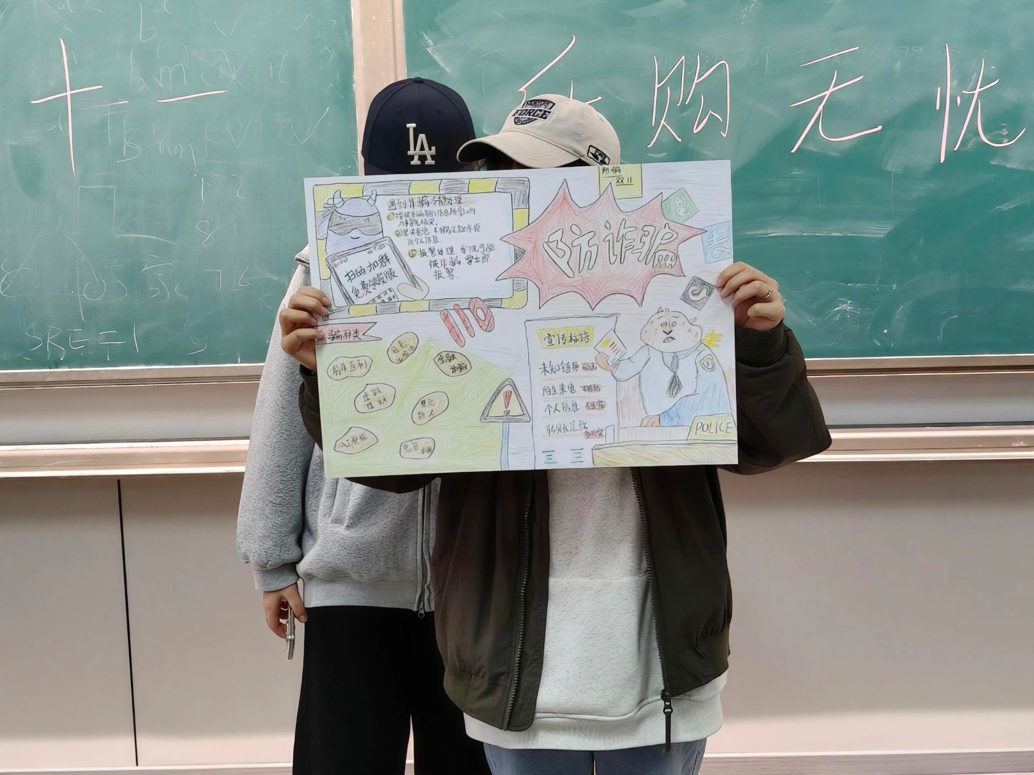 同学们以小组为单位积极投入创作,每个小组都围绕不同的防诈骗主题展开深入探讨。在准备过程中,大家先通过集体讨论明确方向,然后分工合作,资料收集、内容编排、绘画,充分发挥各自的优势。有的小组聚焦“警惕虚假促销”,用生动漫画展现“低价陷阱”“虚假广告”的套路,细致刻画商家如何利用消费者心理设置消费陷阱,以及如何识别虚假折扣;有的小组专注“支付安全防护”,不仅以图文结合的形式解析钓鱼链接、虚假支付平台的危害,还逐步演示了常见诈骗手段的操作流程,并结合实际场景传授安全支付技巧;还有的小组倡导“理性消费”,通过真实案例和数据分析警示过度消费的弊端,引导大家树立正确的消费观念,避免因冲动或虚荣心落入诈骗陷阱。
