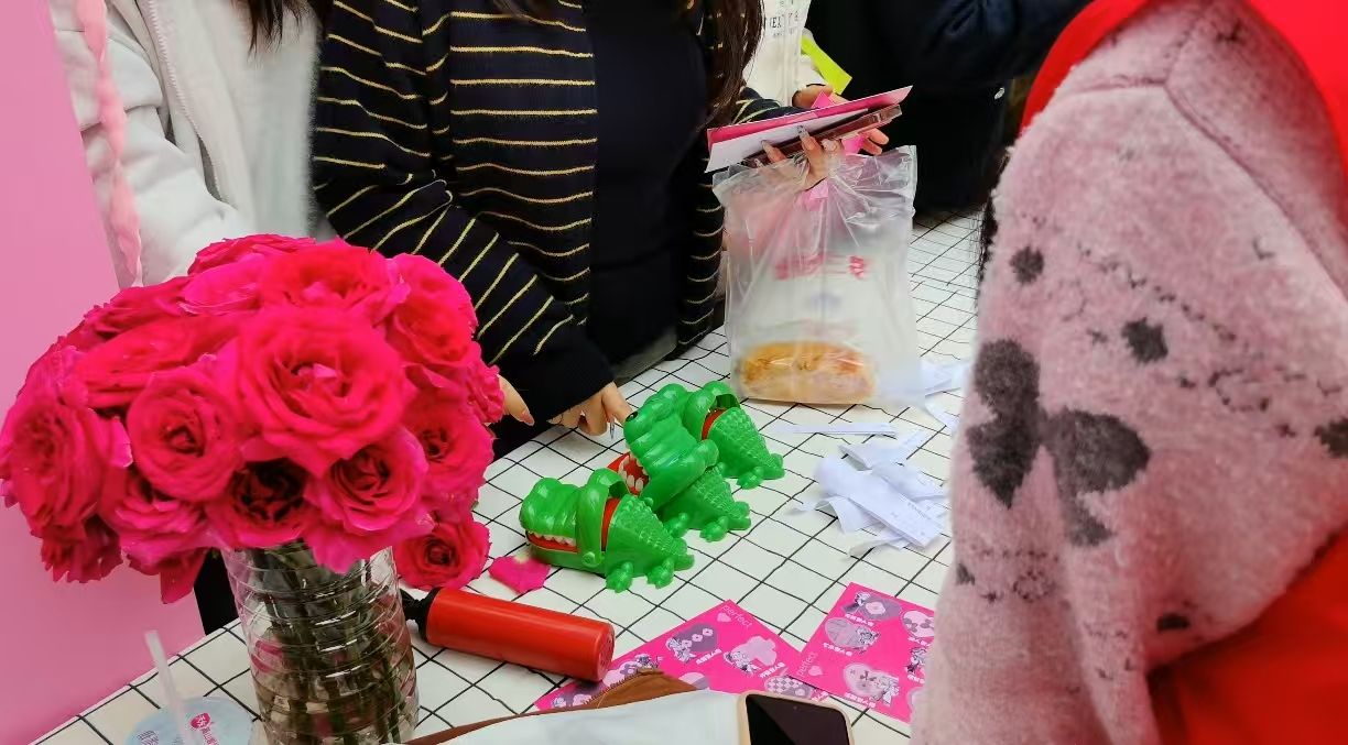 活动尚未正式开始,签名打卡处便排起了长队,同学们纷纷写下对理性恋爱的期许与感悟,玩偶墙前更是热闹非凡,大家抱着可爱玩偶合影留念,粉色气球与漂浮的泡泡相映成趣,提前点燃了活动氛围。核心互动环节“鳄鱼牙齿,谁被咬谁继续”成为全场焦点,同学们自愿两两组队,围坐在一起轮番按下鳄鱼牙齿,随着“咔嗒”一声清脆咬合,被“咬”到的同学需即刻开启双重闯关挑战。
