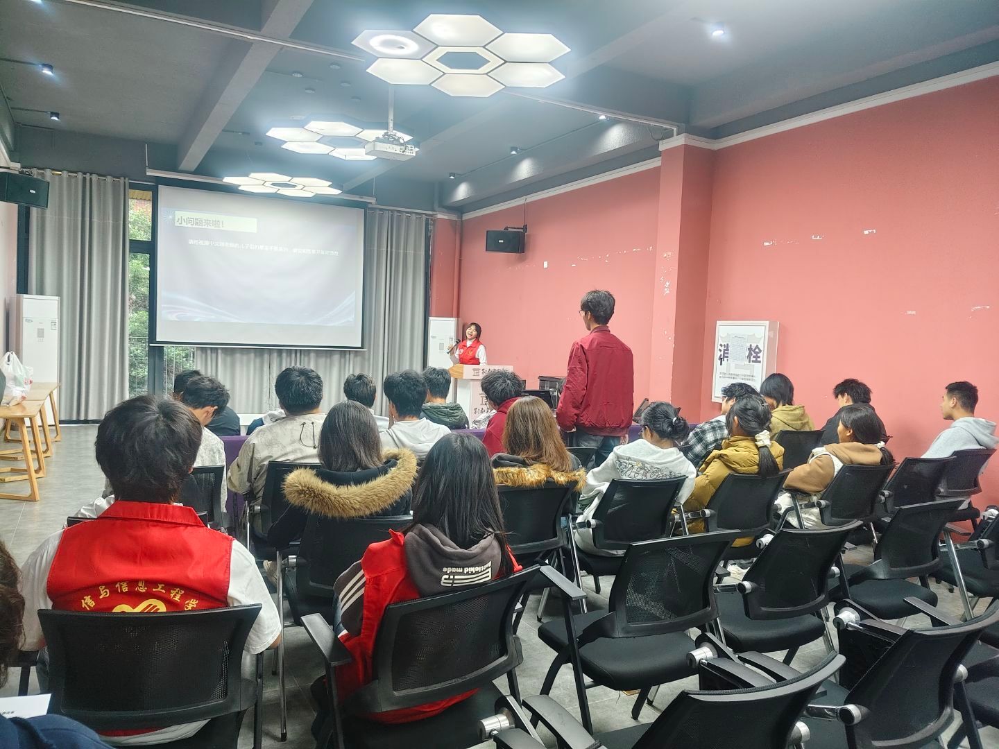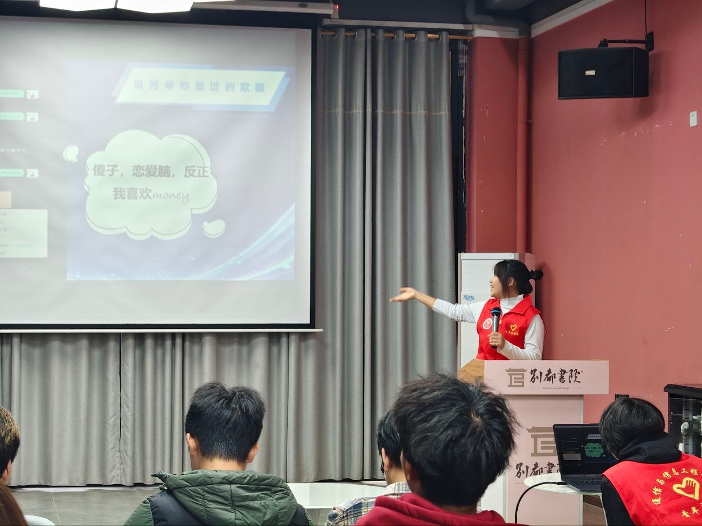活动现场,志愿者们走上讲台给同学们剖析最新诈骗案例,演示新型诈骗过程、诈骗手段,讲解防范要点,现场答疑,让同学们清晰掌握诈骗作案的全流程来预防诈骗的发生。