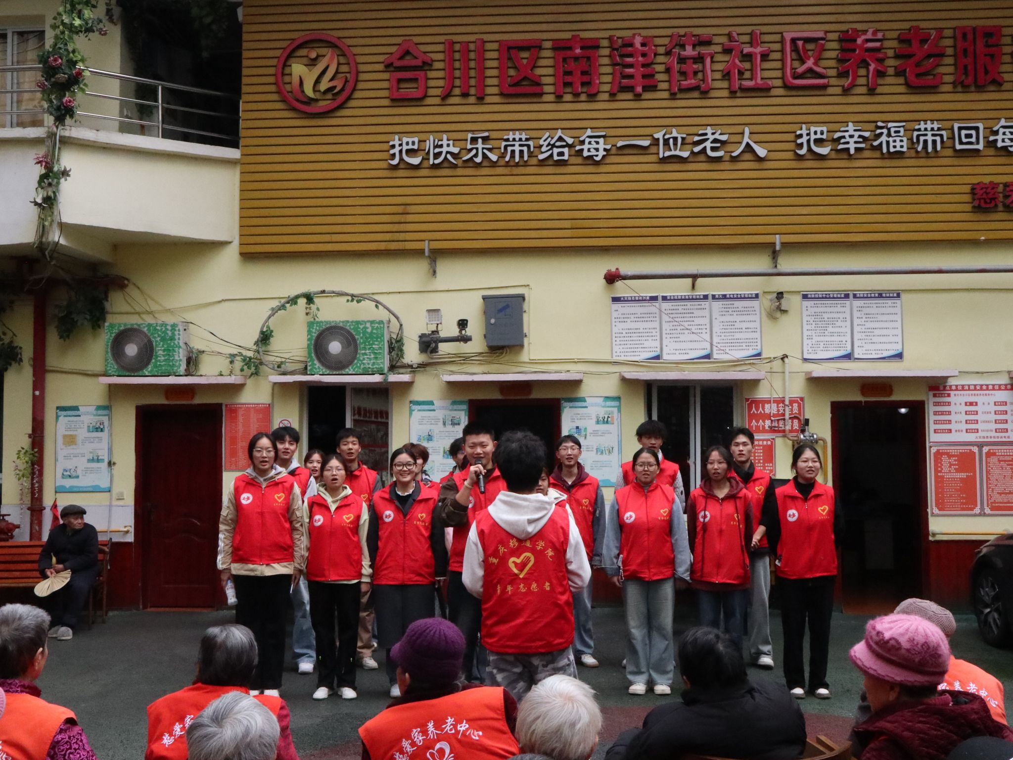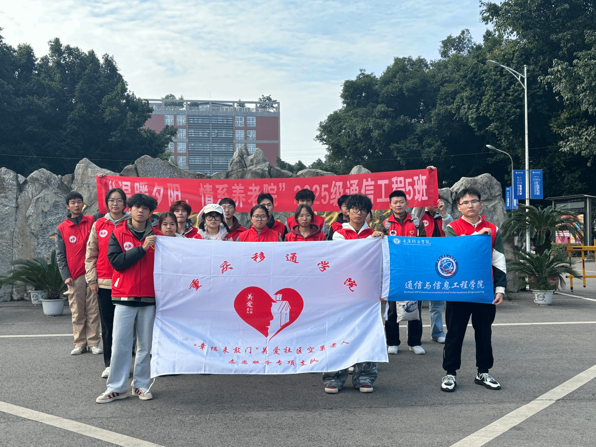 为践行“完满教育”理念,搭建青年与老年群体互动的实践平台,11月21日下午,通信与信息工程学院“幸福来敲门”关爱社区空巢老人志愿服务专项支队联合2025级通信工程05支部,走进慈爱家养老院开展“温暖夕阳,情系养老院”主题志愿服务活动。20余名志愿者与院内老人共度温馨时光,以实际行动诠释尊老敬老的传统美德,为秋日里的养老院增添了浓浓暖意。