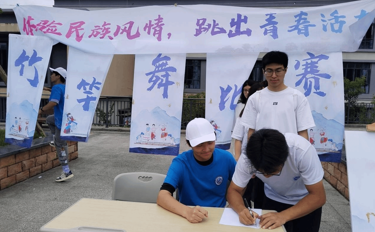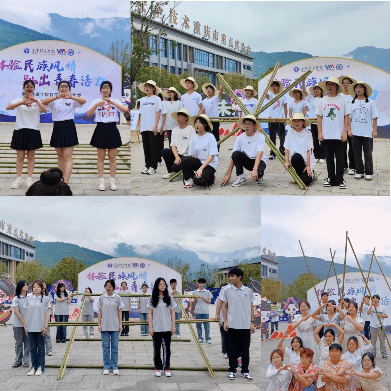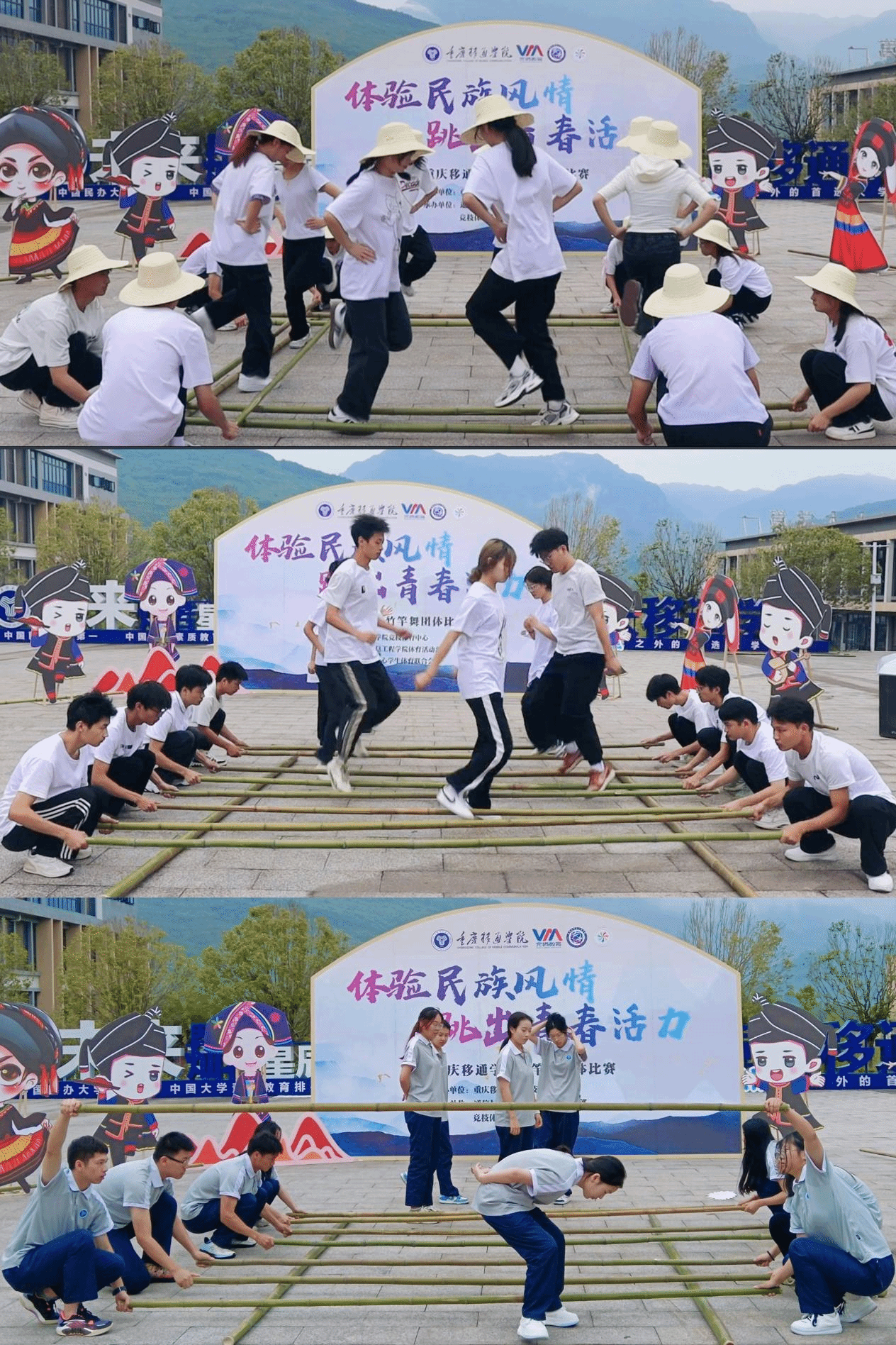 为积极响应校园体育文化节的号召,传承和弘扬我国传统民族文化,丰富校园体育文化生活,提高大学生团队协作能力,重庆移通学院“体验民族风情,跳出青春活力”竹竿舞团体比赛于2024年5月29日在图书馆前广场举行。此次活动由通信与信息工程学院体育活动部与竞技体育中心学生体育联合会联合举办,共有来自9个学院组成的8支队伍参赛,150余名同学欢聚图书馆门前,一起体验竹竿舞的乐趣,感受传统民族体育项目的魅力。