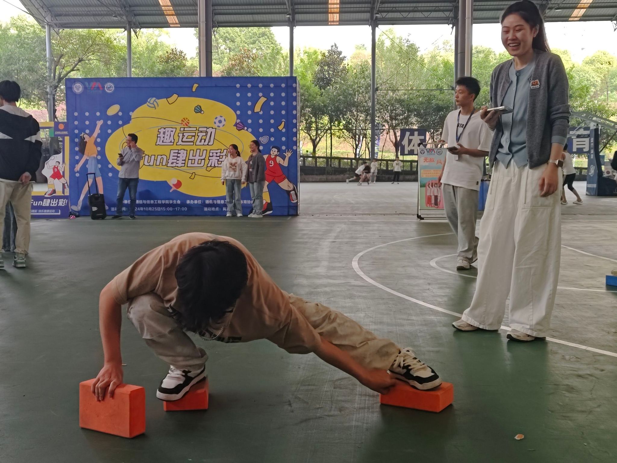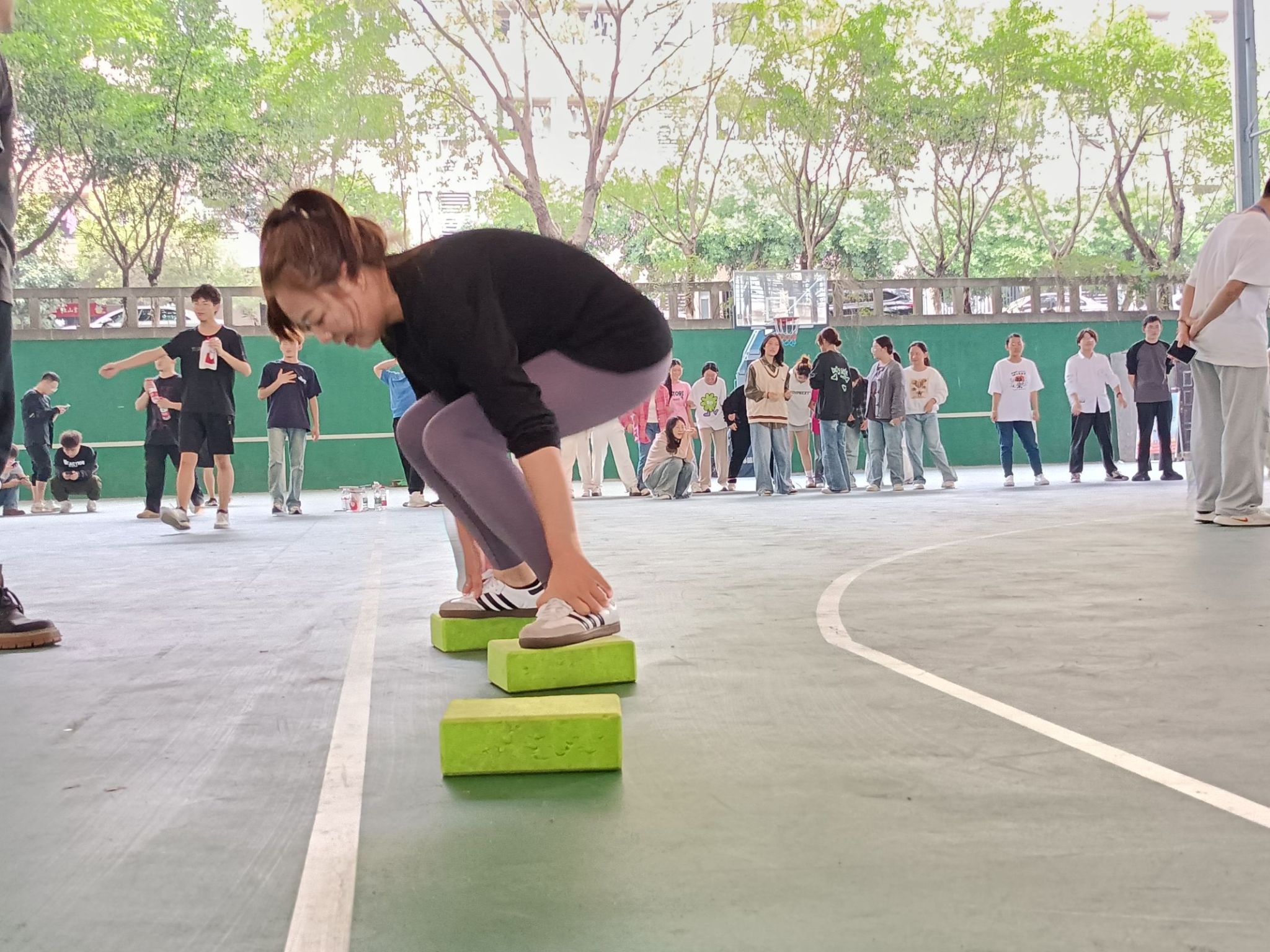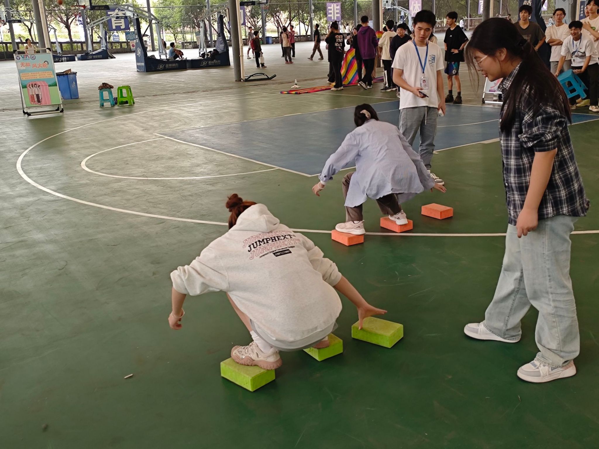 这款小游戏虽然看起来简单,实际上却对同学们的平衡感和持久力提出了挑战。在放置方块的过程中,有些同学未能精确掌握间距,导致在落脚时几乎要失足,身体摇摆不定地努力保持平衡,那惊心动魄的瞬间让旁观者不由自主地为他们捏一把汗。相反,当有同学成功完成一段距离,并将方块顺利传递给下一位队友时,观众席上便会爆发出一阵阵热烈的掌声和欢呼,整个游戏过程既具有一定的挑战性,又充满了乐趣和刺激。
