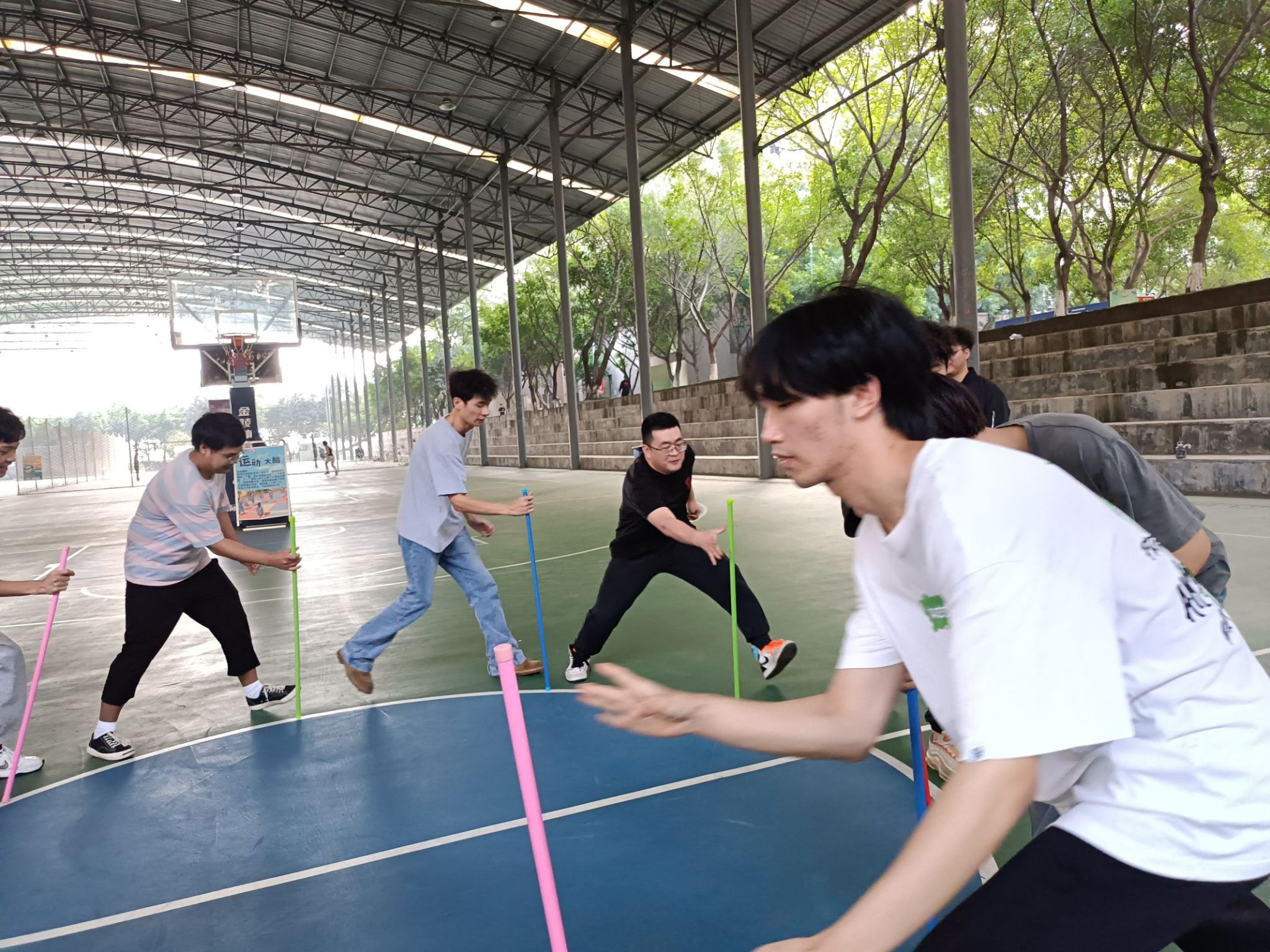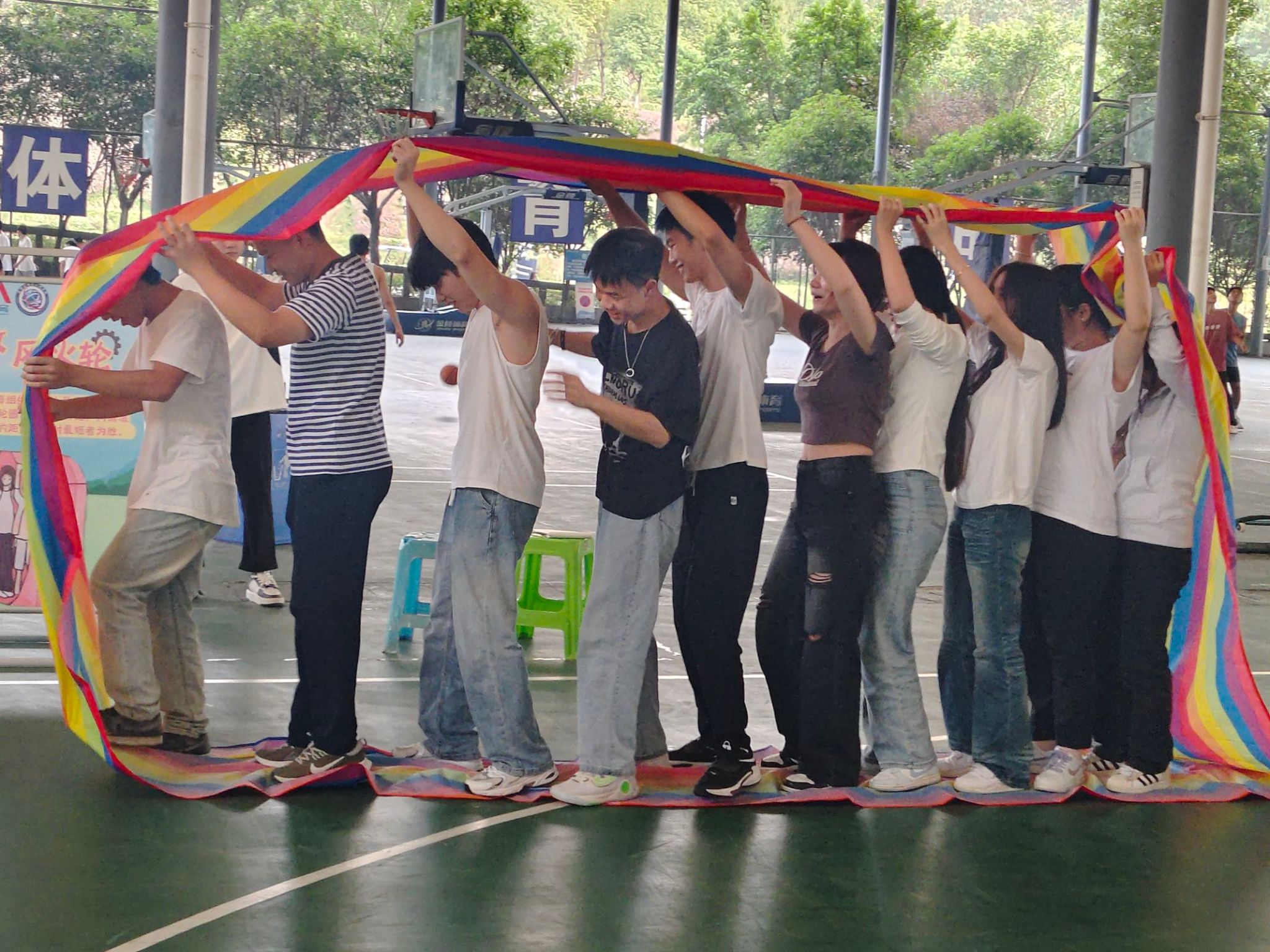 在此项游戏里,老师和同学们展现了卓越的团队协作精神,通过精确的移动和默契的配合,共同保持杆子稳定。这场活动不仅锻炼了团队成员的协调能力,还加深了彼此间的信任与合作。