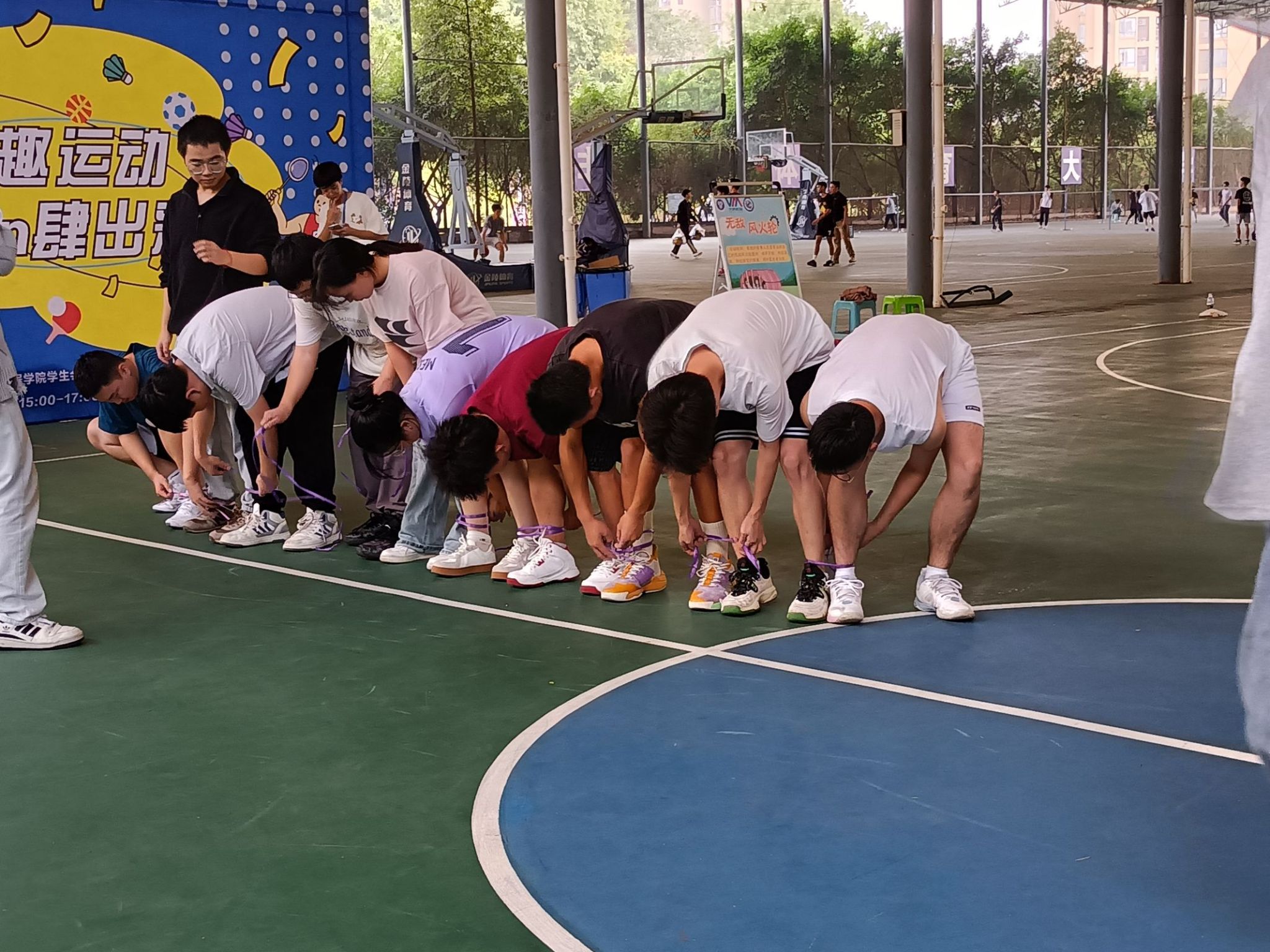 在现场的一隅,随着裁判的一声令下,各小组的同学们齐声喊着“一二、一二”的口号,努力协调步伐,奋力向前迈进。他们脸上洋溢着坚定而兴奋的神情,每迈出一步都伴随着大家共同的呼喊声。现场加油助威的声音此起彼伏,整个氛围紧张而又充满欢乐。