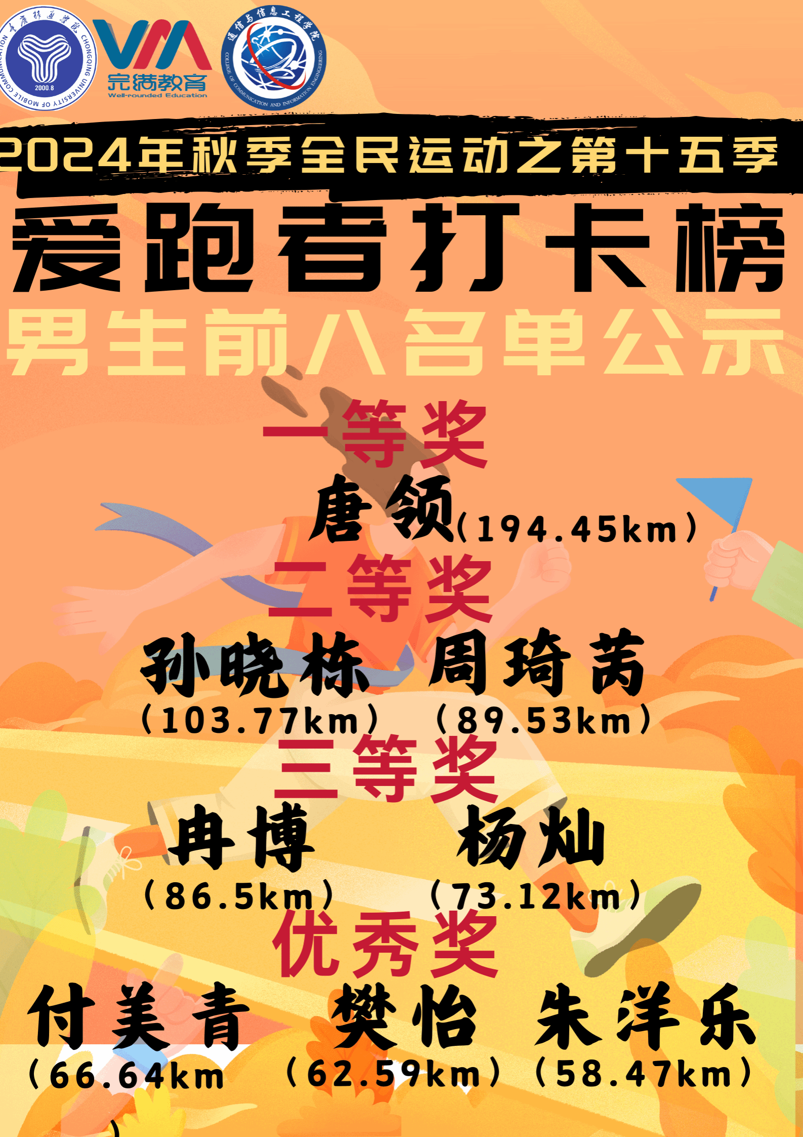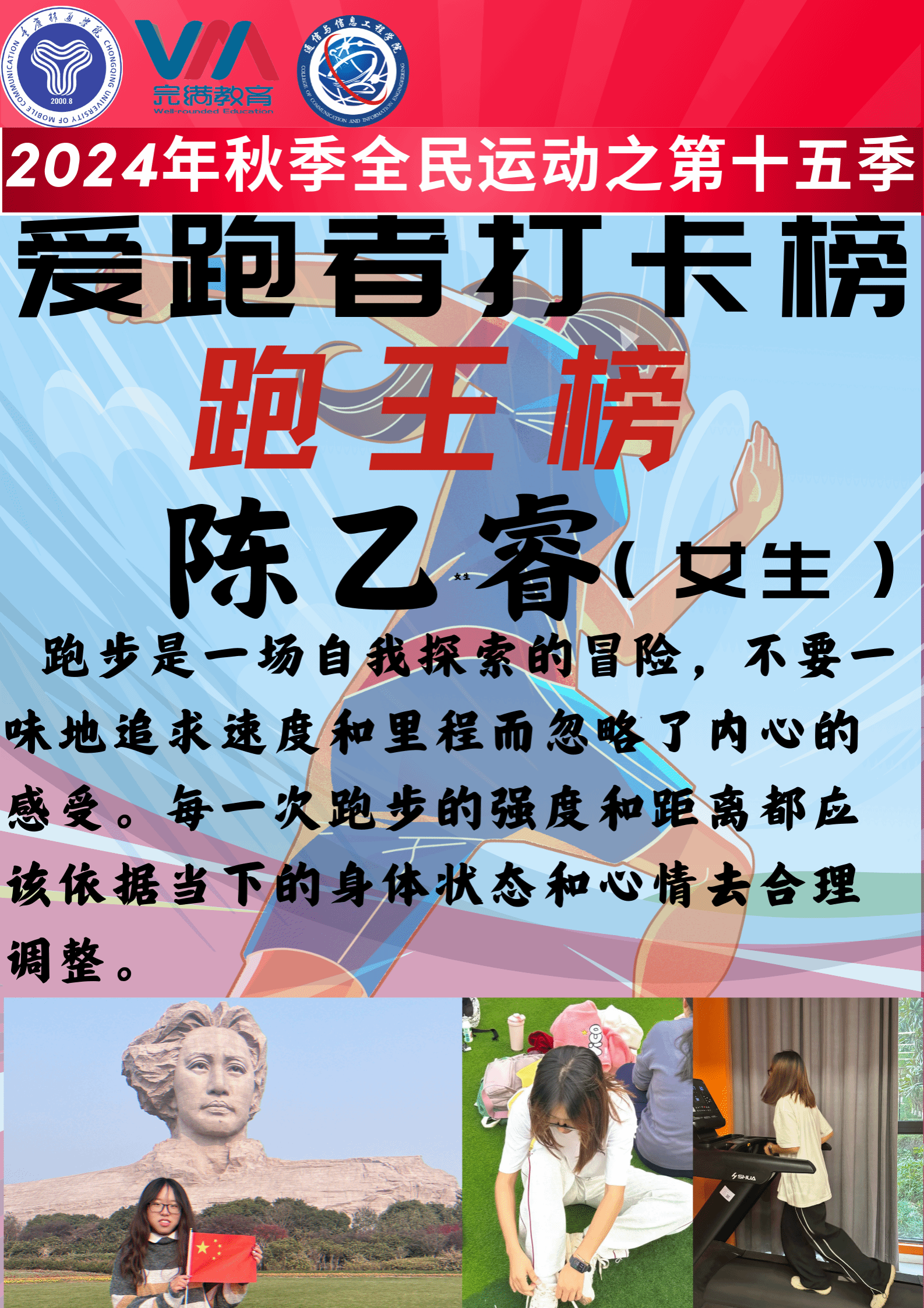 2024年12月22日,由重庆移通学院竞技体育中心主办、通信与信息工程学院承办的2024-2025学年全民运动计划之“奔跑逐梦,活力飞扬”第15季爱跑者打卡榜圆满结束。本次第15季爱跑者活动结合线上线下双模式开展,共开展18天,双校区共2052名同学参与,跑步里程累计55324公里。