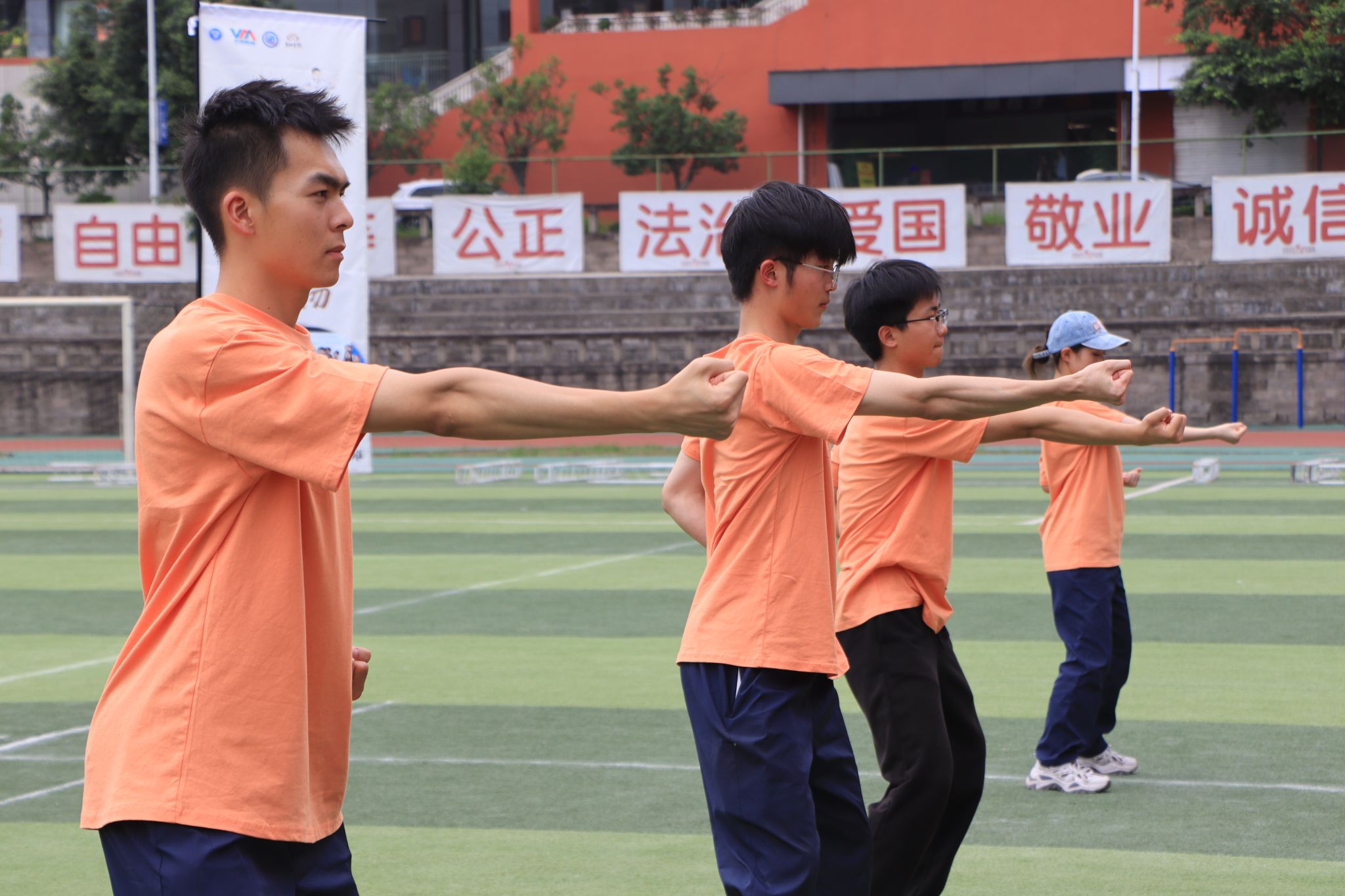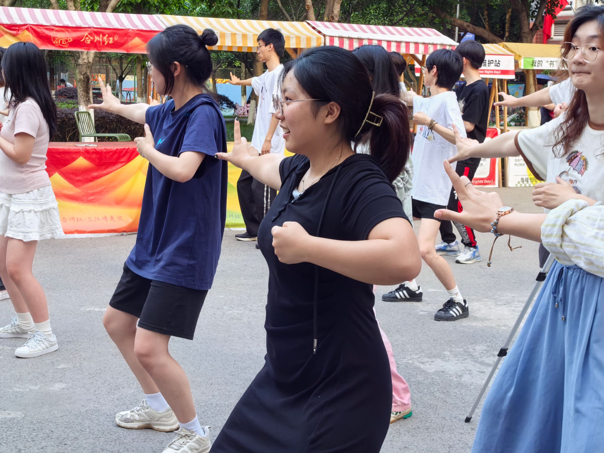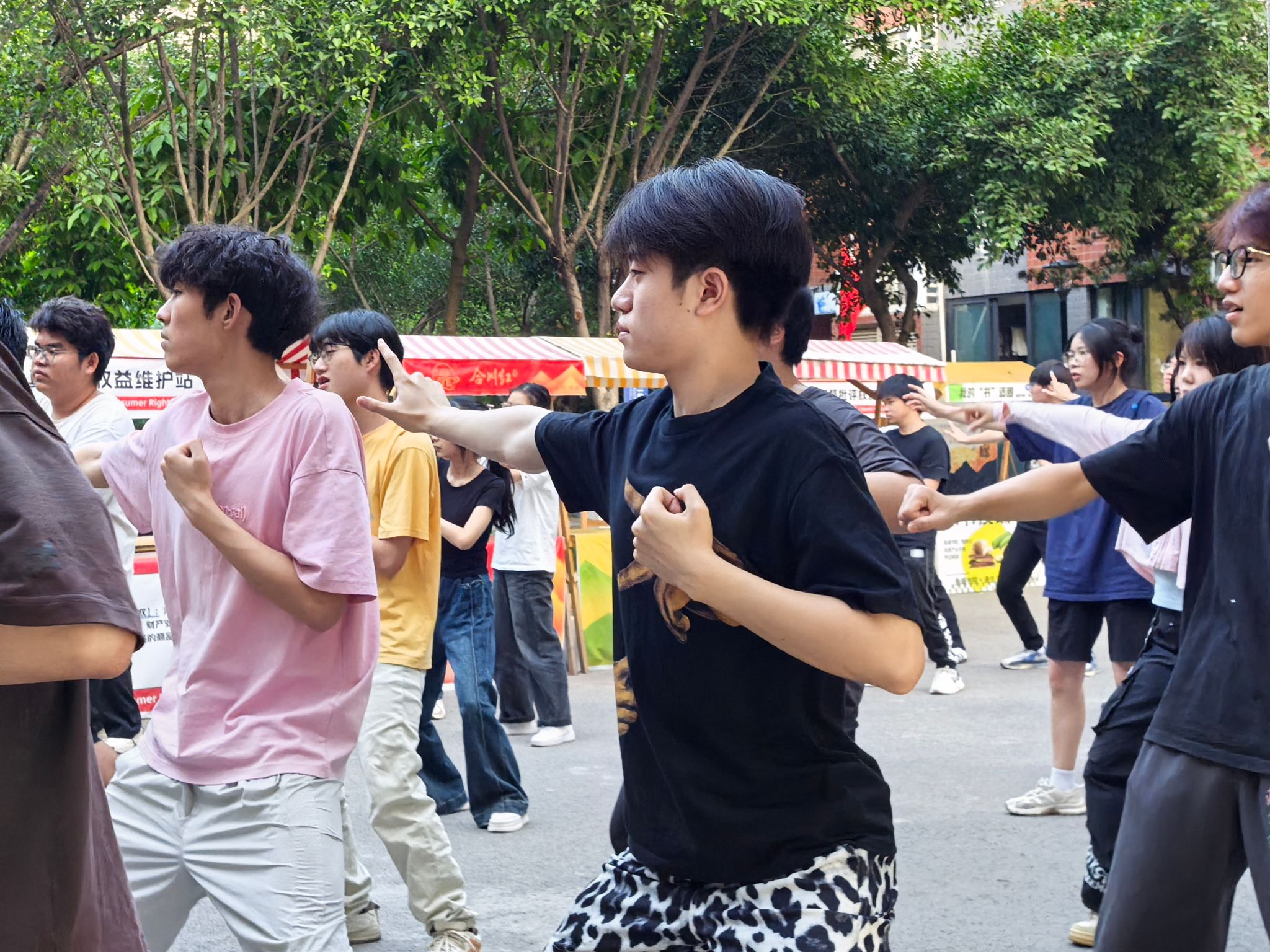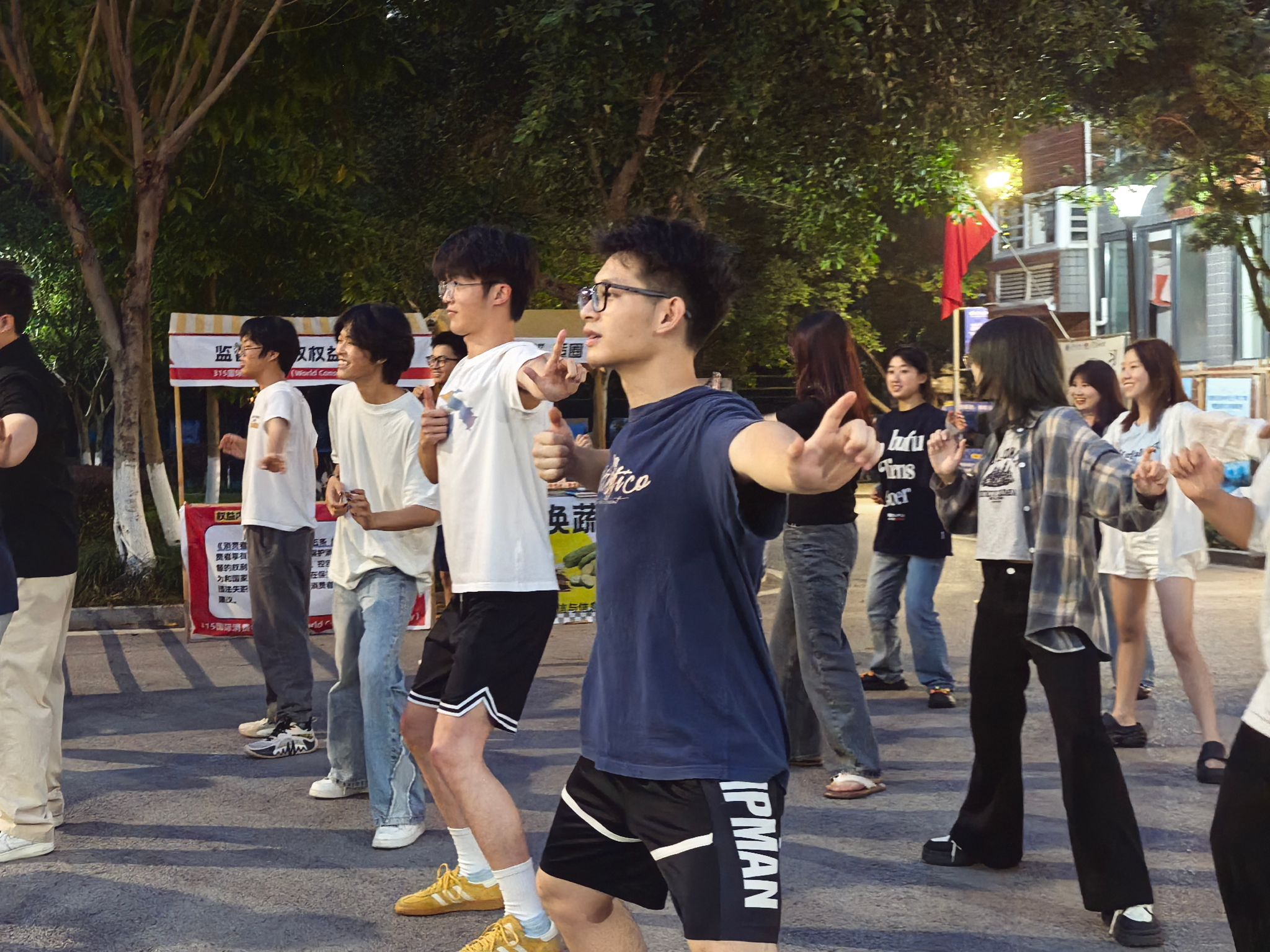 训练初期,队员们对 “两手托天理三焦”“左右开弓似射雕” 等招式的发力方式和呼吸节奏掌握不足,动作常显僵硬。我们邀请鱼城书院的老师进行动作指导。第一次合练时,队伍的连贯性差,单是的转手角度就反复纠正。傍晚的训练场不仅是技能提升的阵地,更是团队凝聚力的熔炉。老师们的精心指导,成员们互相纠错,互帮互助。“那些在夕阳下挥汗的傍晚,让我们真正懂得了‘台上一分钟,台下十年功’的含义。”