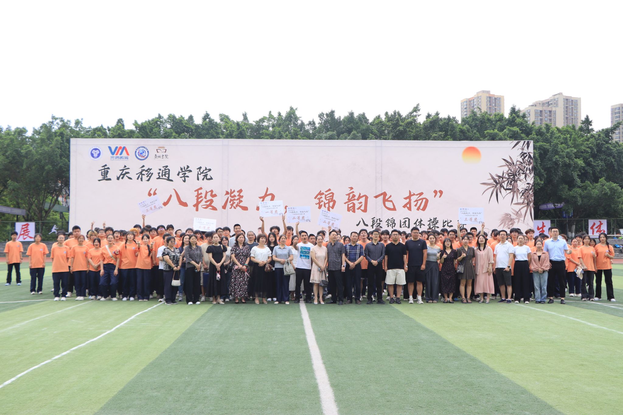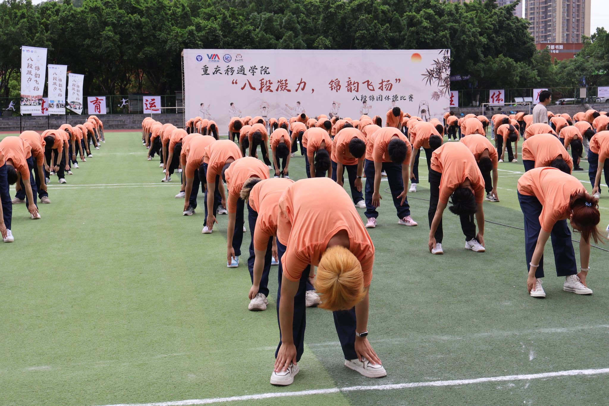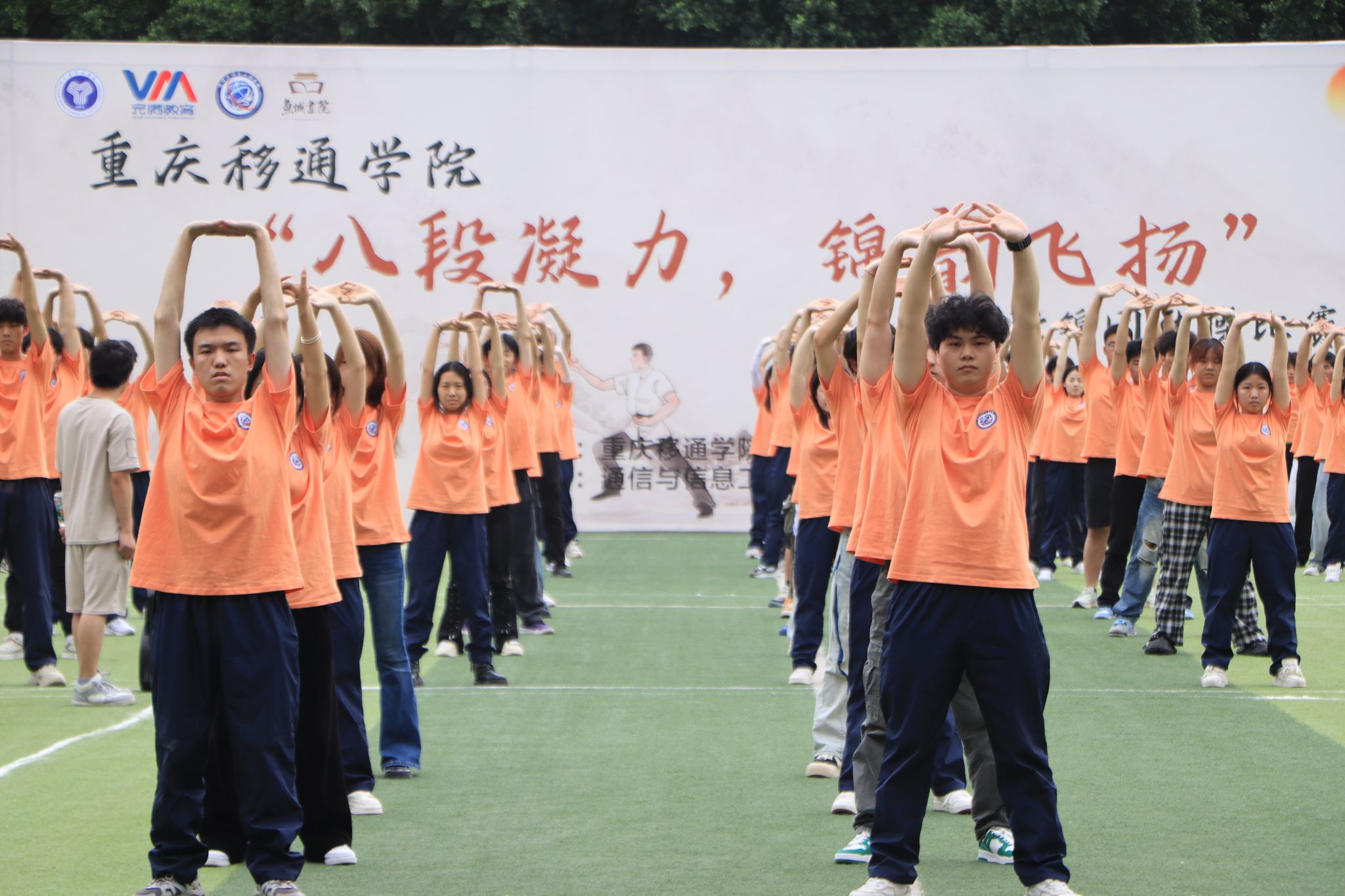 2025 年 5 月 23日,重庆移通学院迎来一场融合青春活力与传统文化的盛宴 ——“八段凝力,锦韵飞扬” 团体操八段锦比赛在学校大操场精彩上演。本次比赛由校竞技体育中心主办,吸引了9支班级队伍、共计 300余名学生踊跃参与。选手们以整齐划一的动作、蓬勃向上的精神风貌,为现场观众呈现了一场美轮美奂的视觉与文化双重盛宴。