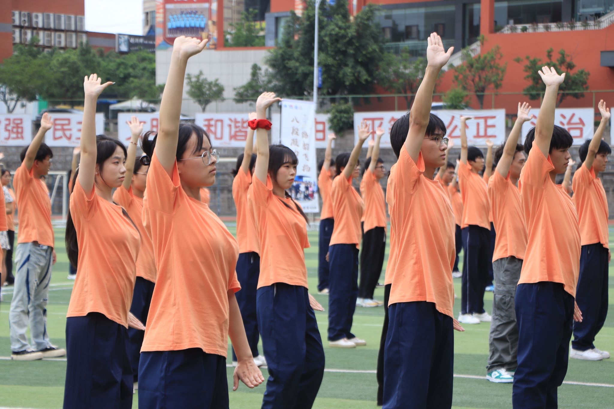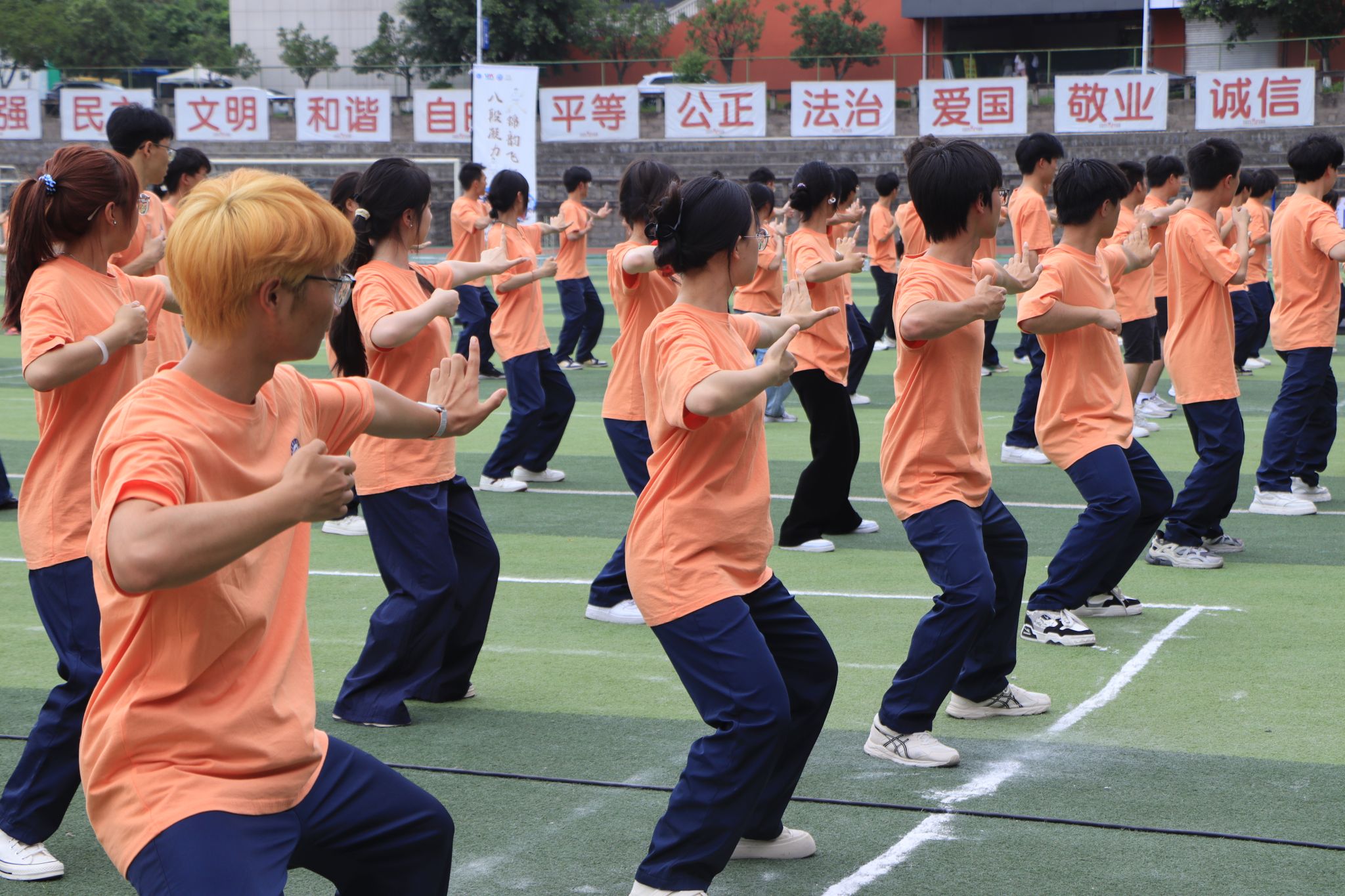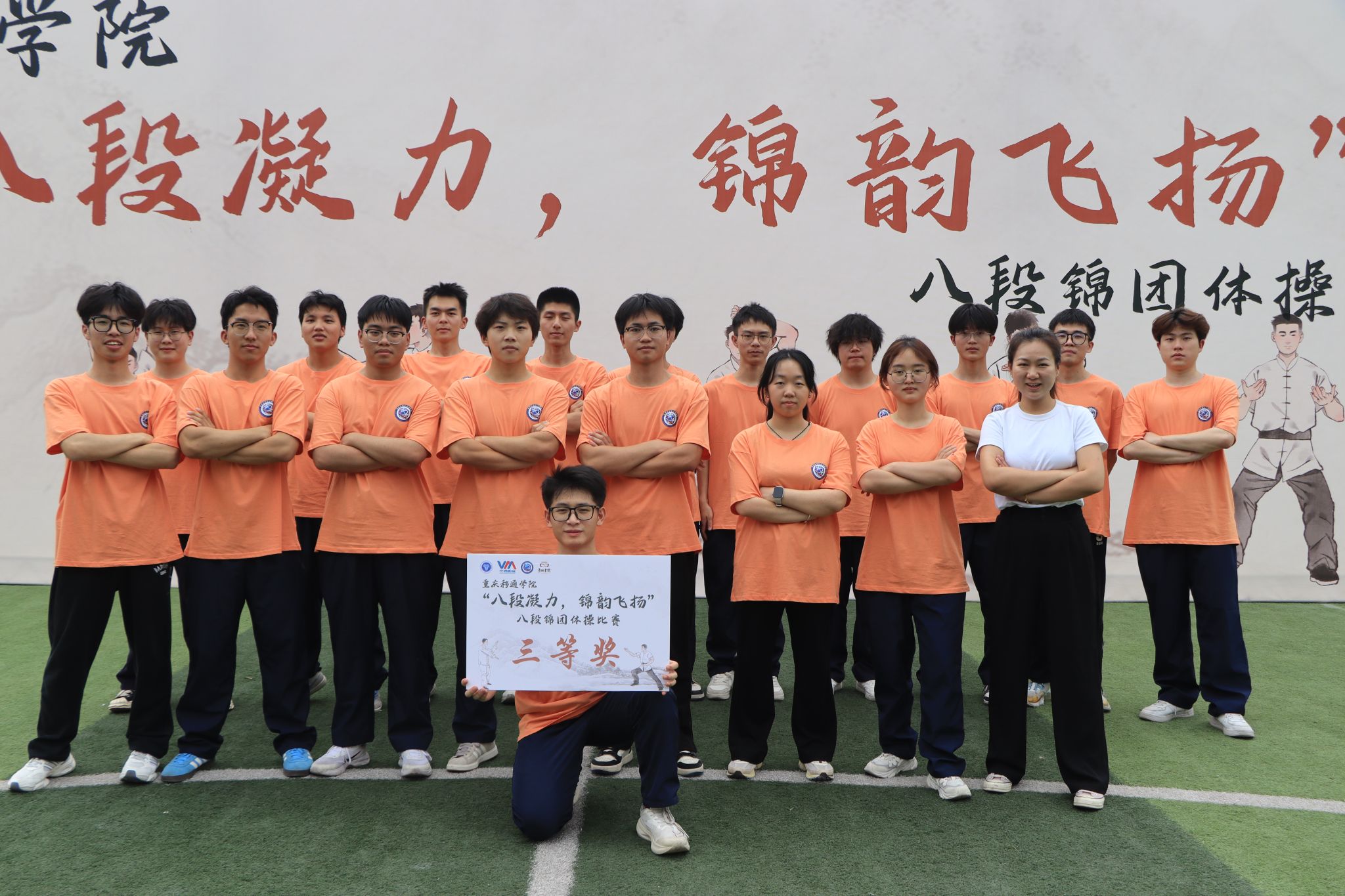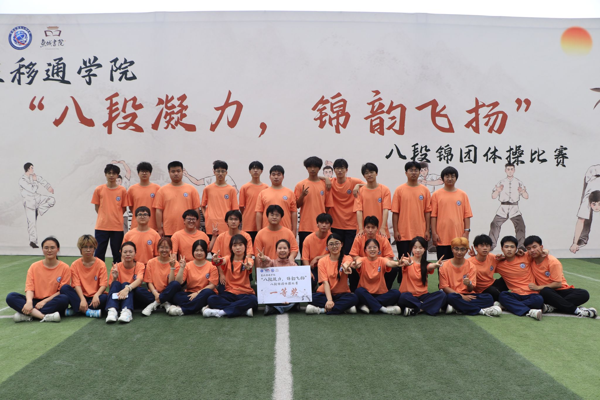 2025 年 5 月 23日,重庆移通学院迎来一场融合青春活力与传统文化的盛宴 ——“八段凝力,锦韵飞扬” 团体操八段锦比赛在学校大操场精彩上演。本次比赛由校竞技体育中心主办,吸引了9支班级队伍、共计 300余名学生踊跃参与。选手们以整齐划一的动作、蓬勃向上的精神风貌,为现场观众呈现了一场美轮美奂的视觉与文化双重盛宴。