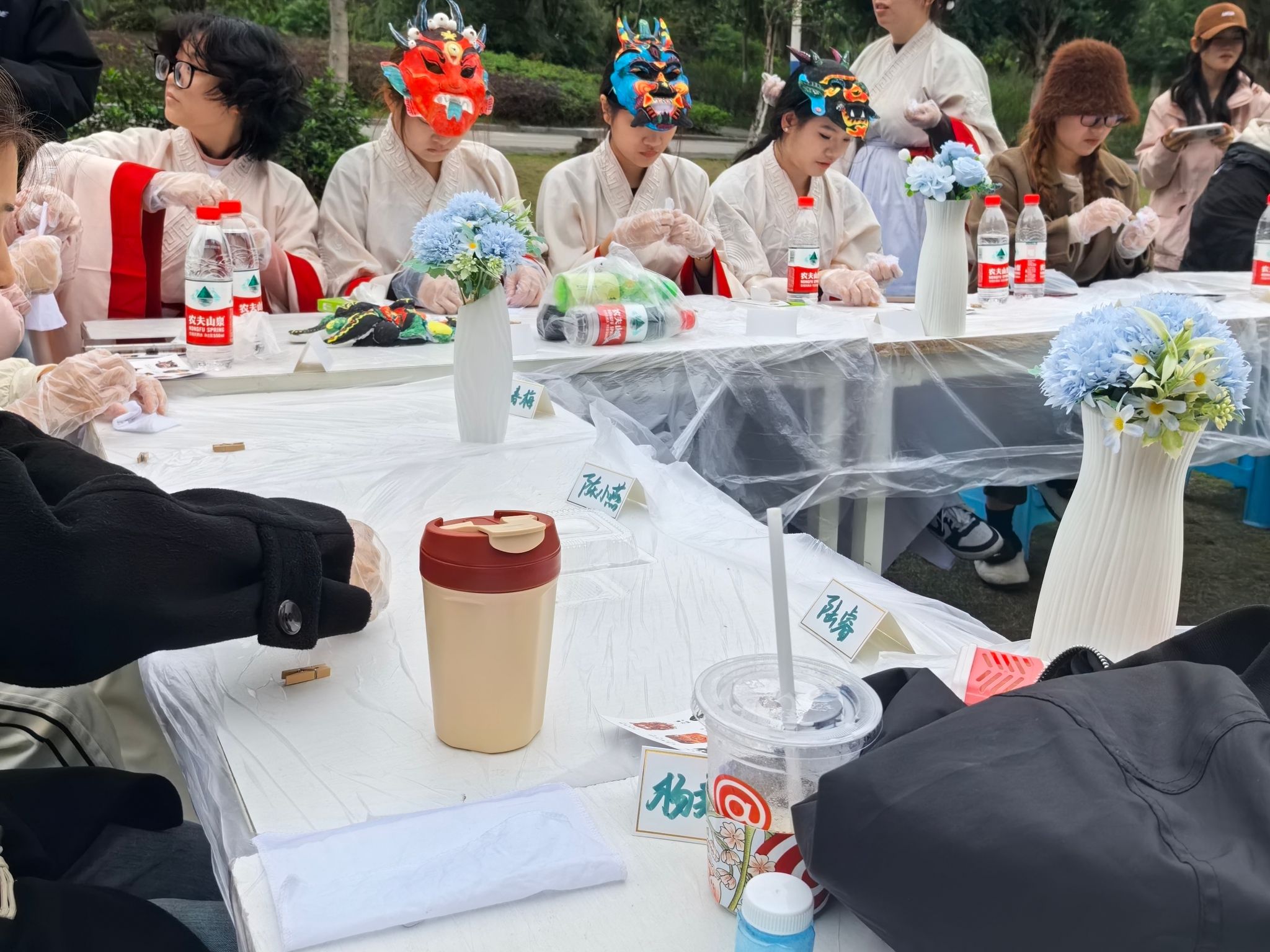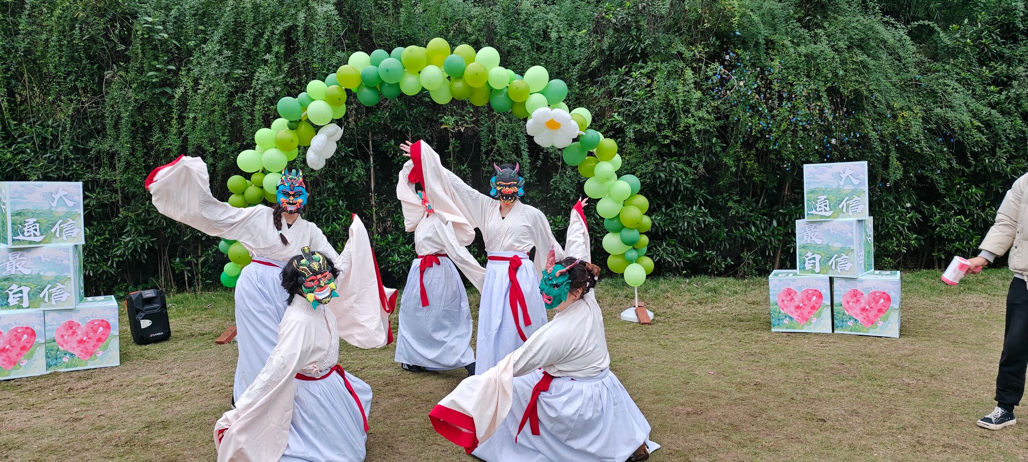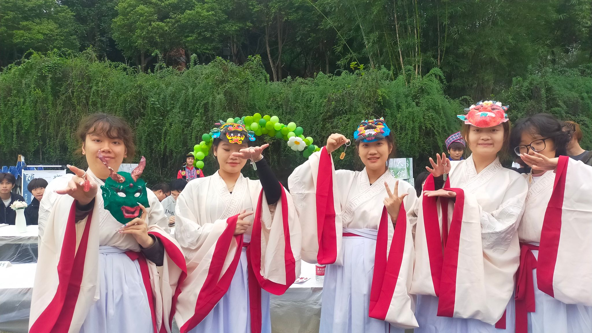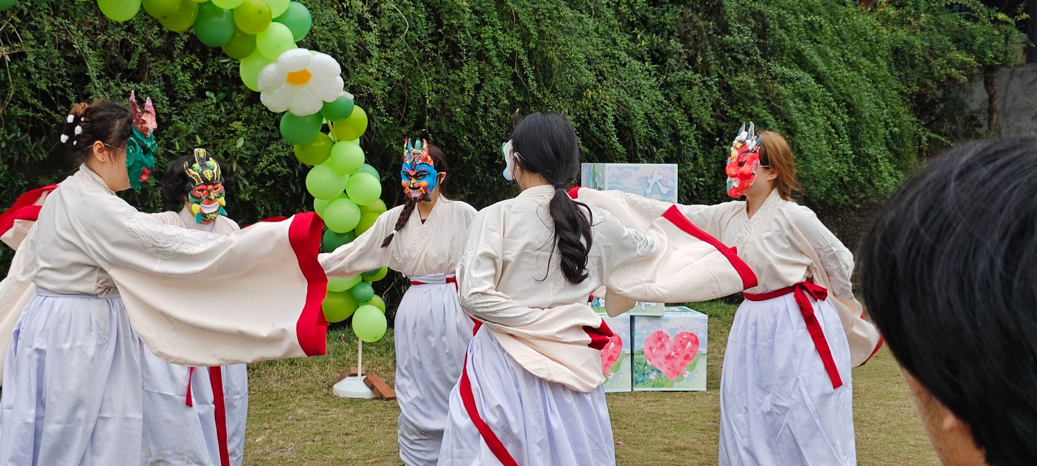 随着曲水流觞般的成语接龙环节落下帷幕,活动现场迎来了一场视觉盛宴—傩戏舞蹈的精彩表演。五位同学盛装登场,她们身着统一且极具民族特色的服饰,脸上佩戴着精致无比的傩戏面具,宛如从古老岁月中走来的文化使者。伴随着富有节奏感的鼓点,她们翩翩起舞,动作古朴而粗犷,完美遵循着 “先娱神再娱人” 的独特创作宗旨以及相应的风格规律。而舞者们所佩戴的傩面,更是成为了全场瞩目的焦点,那细腻的纹理、精巧绝伦的设计,每一处细节都彰显出传统工艺所蕴含的极致匠心,仿佛在无声诉说着古代人民的信仰、价值观以及生活方式,承载着深厚且丰富的文化内涵,无疑是中华民族民俗活动中文化特点极为鲜明的代表,令人不禁为之赞叹与折服。
