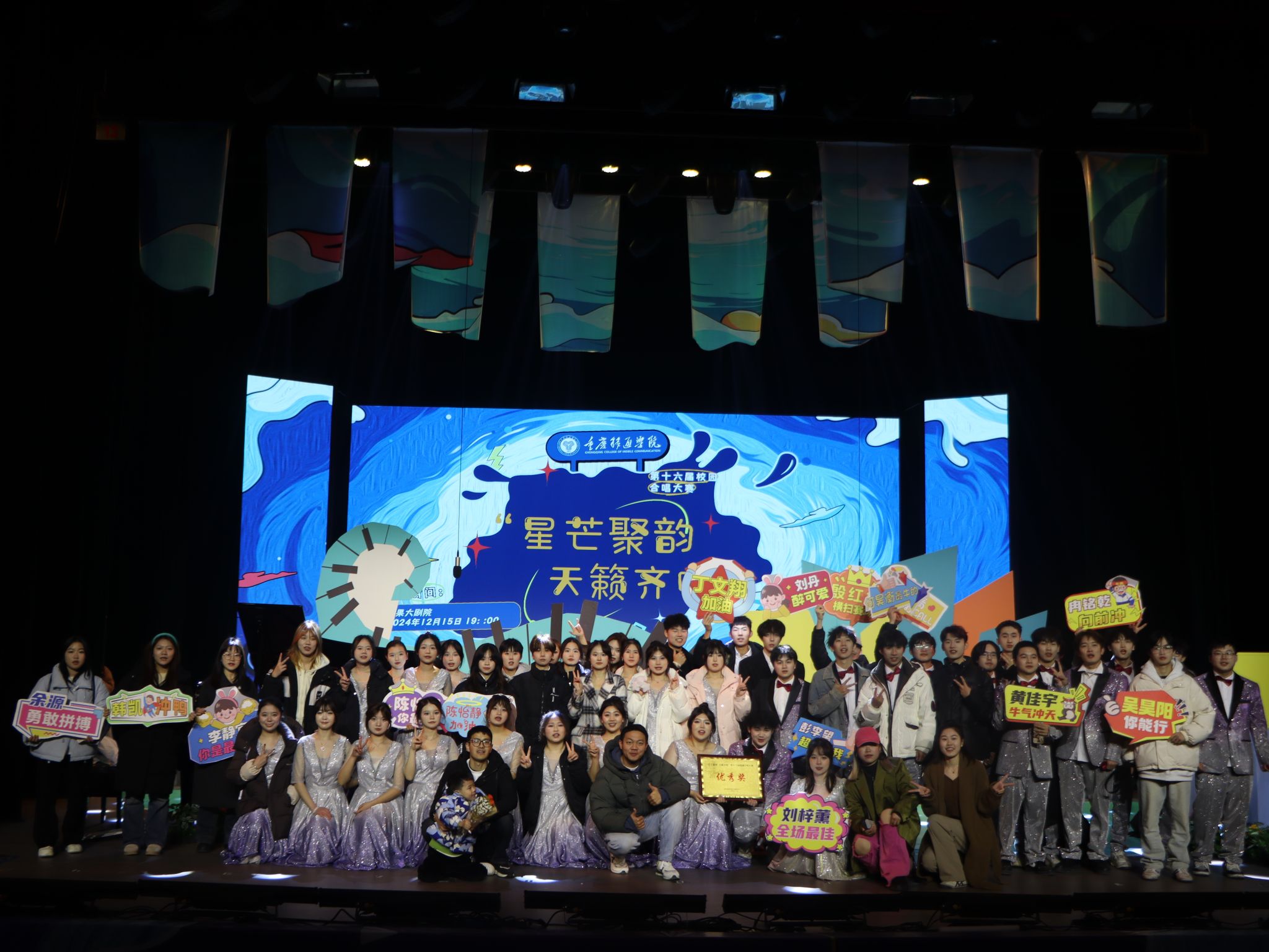 2024年12月15日重庆移通学院(合川校区)第十六届校园合唱大赛在缤果大剧院圆满举办。通信与信息工程学院合唱团由 46 名同学组成参赛队伍演唱《知足》,凭借优美歌声与精彩表现荣获第四名佳绩,充分展现出团队协作能力与音乐创艺能力。