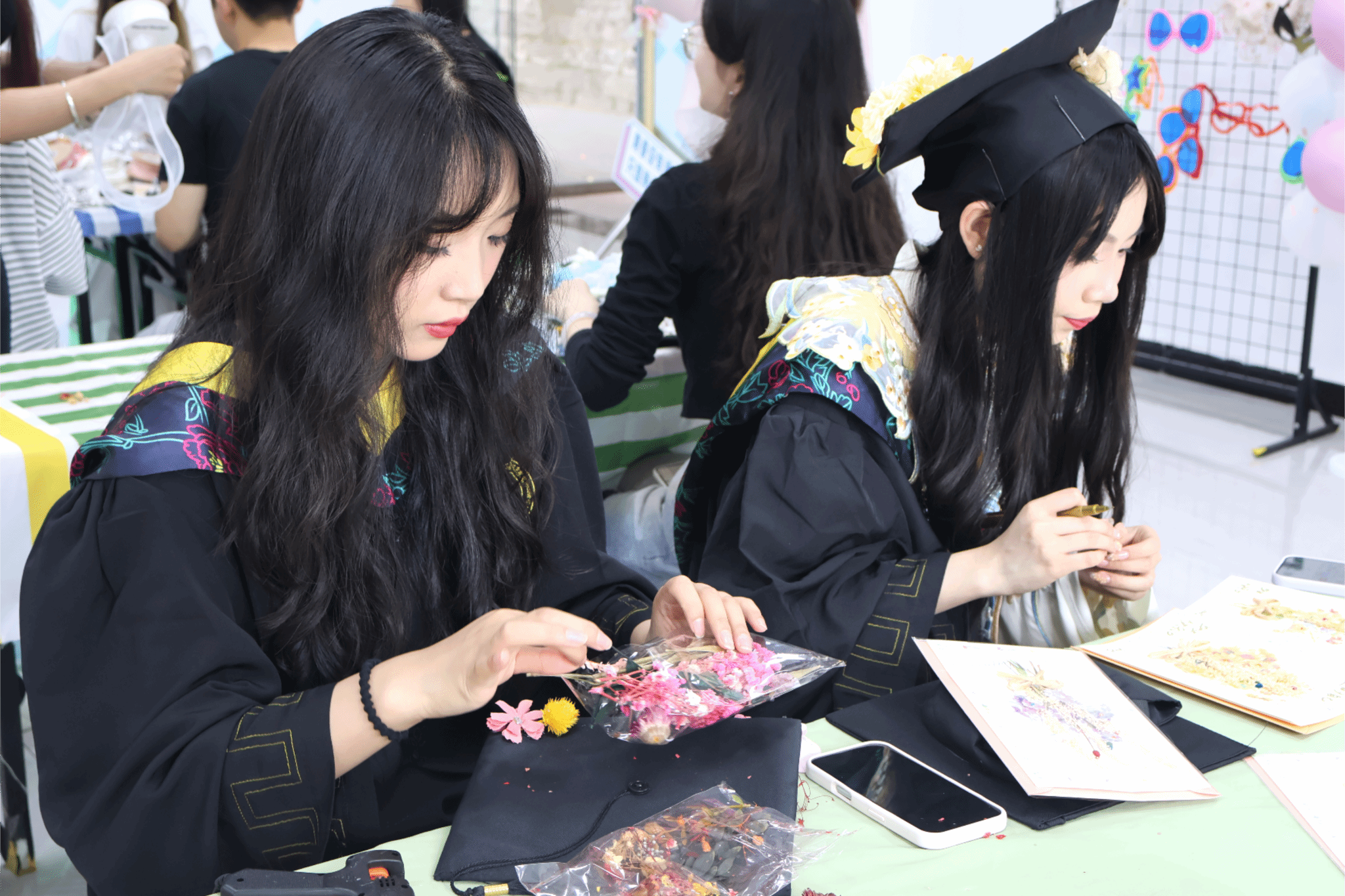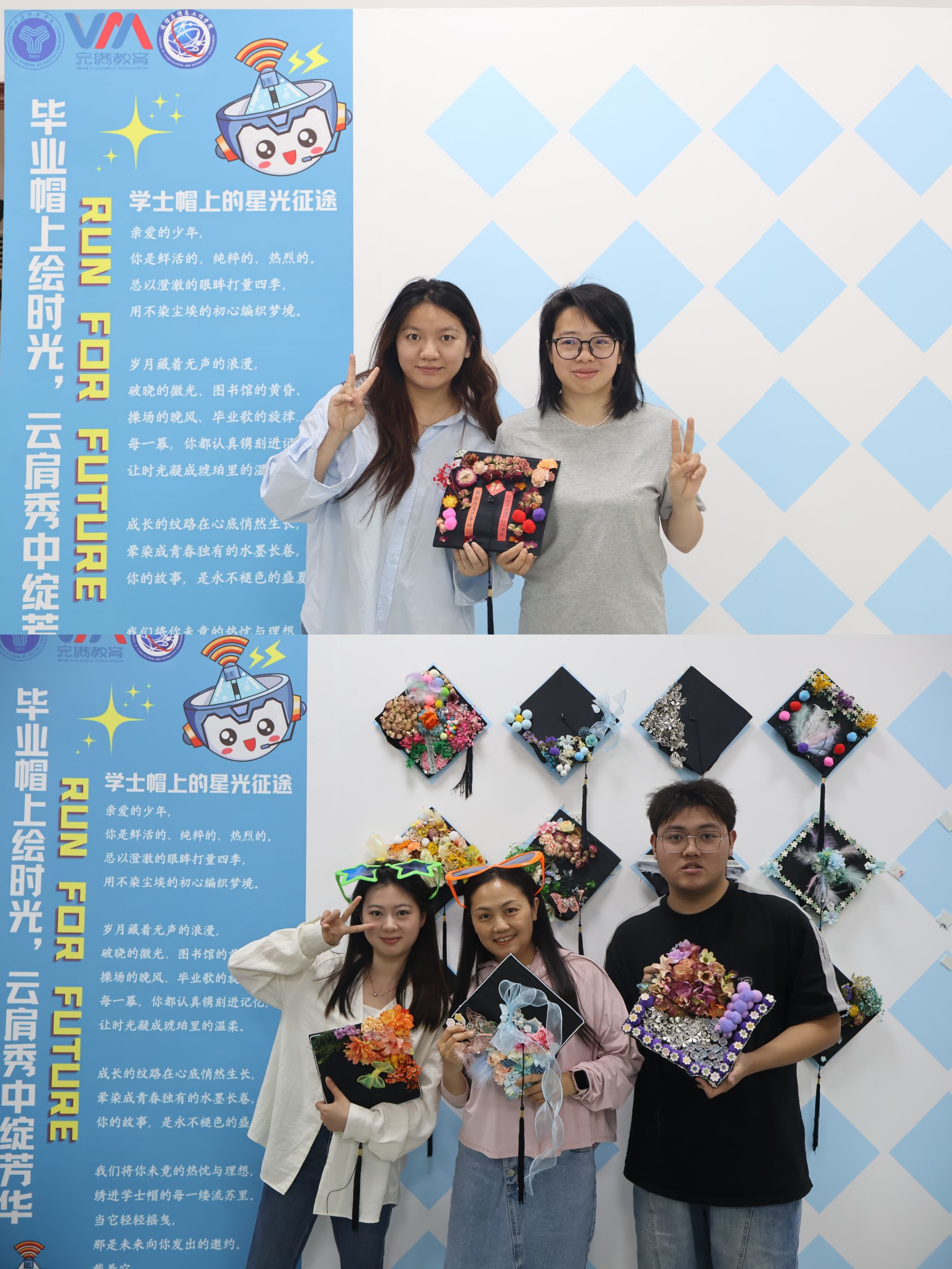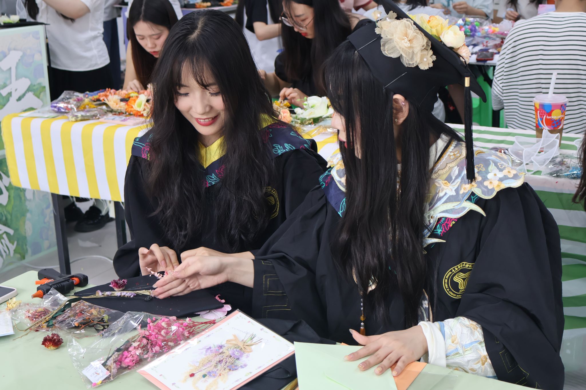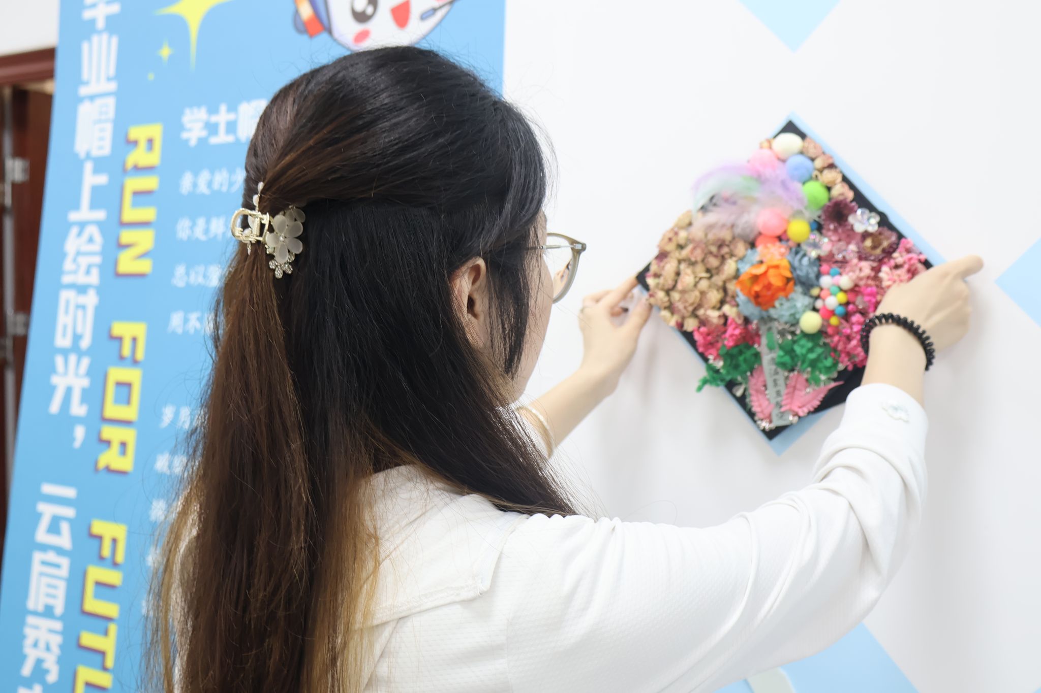 活动前期,学校通过线上线下相结合的宣传方式,进行了为期一周的预热,提前向毕业班学生和辅导员发出诚挚邀请,并精心做好物资筹备等工作。活动当日,现场氛围热烈而欢快。大家都积极参与其中,他们的创作类型精彩纷呈,有以“花影扶疏处,青春不散场”为主题,用干花压印在学士帽上,将青春的美好瞬间凝固;也有以笔为媒,在帽顶手写优美词句,诉说着对校园时光的眷恋;还有人在毕业帽和云肩上绘制出绚丽多彩的花朵、灵动的飞鸟,寓意着自己即将奔赴充满希望的未来。