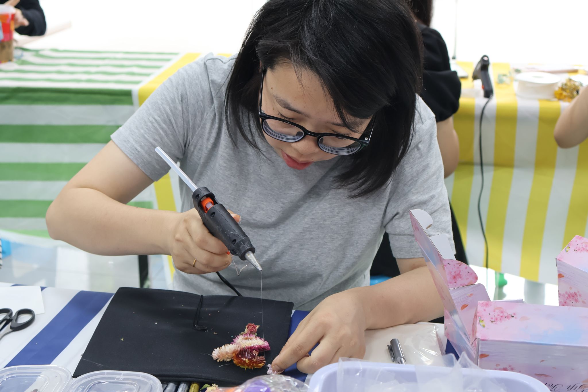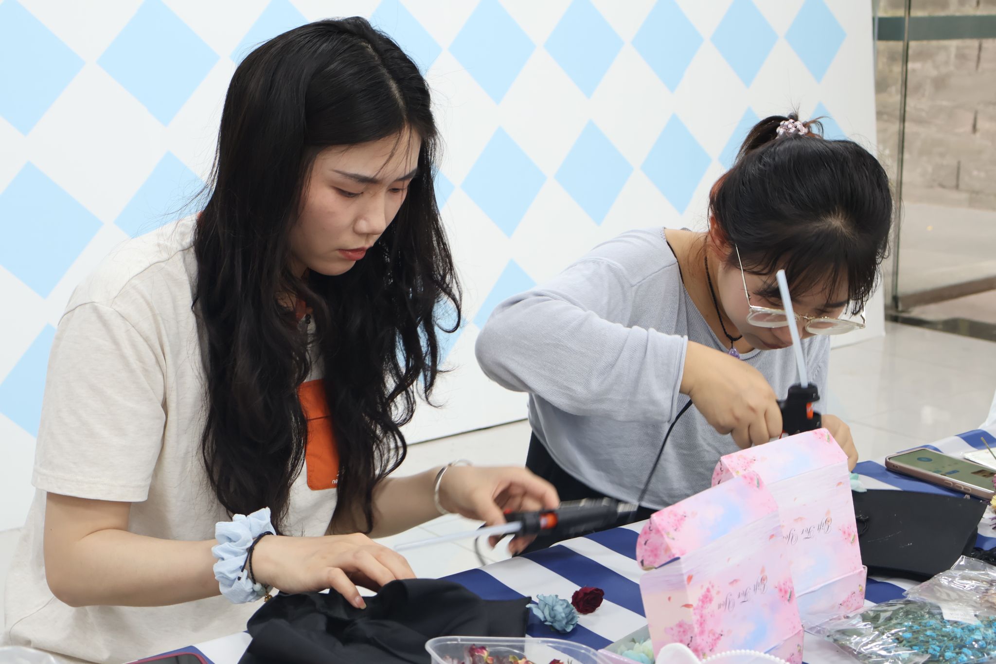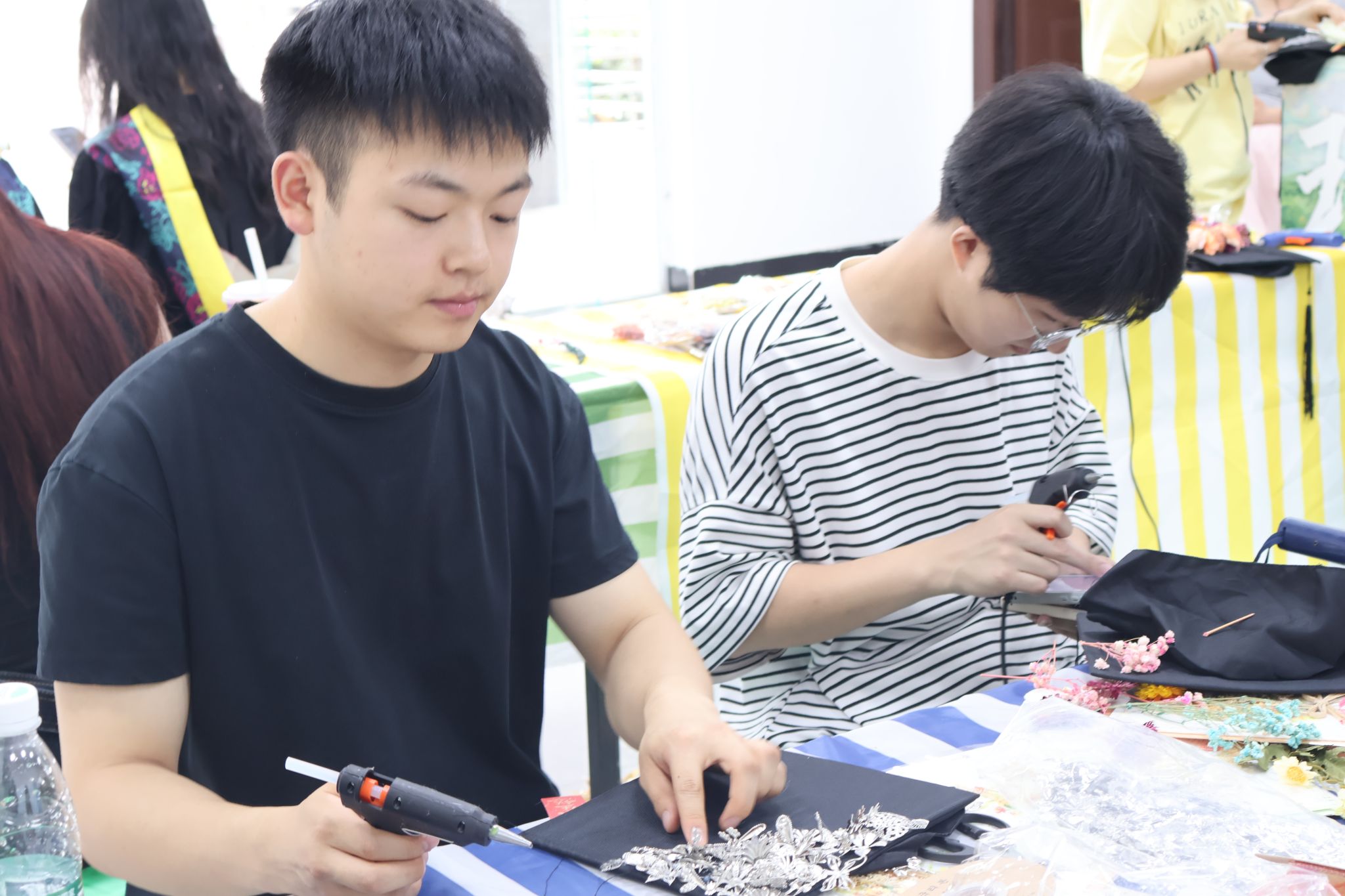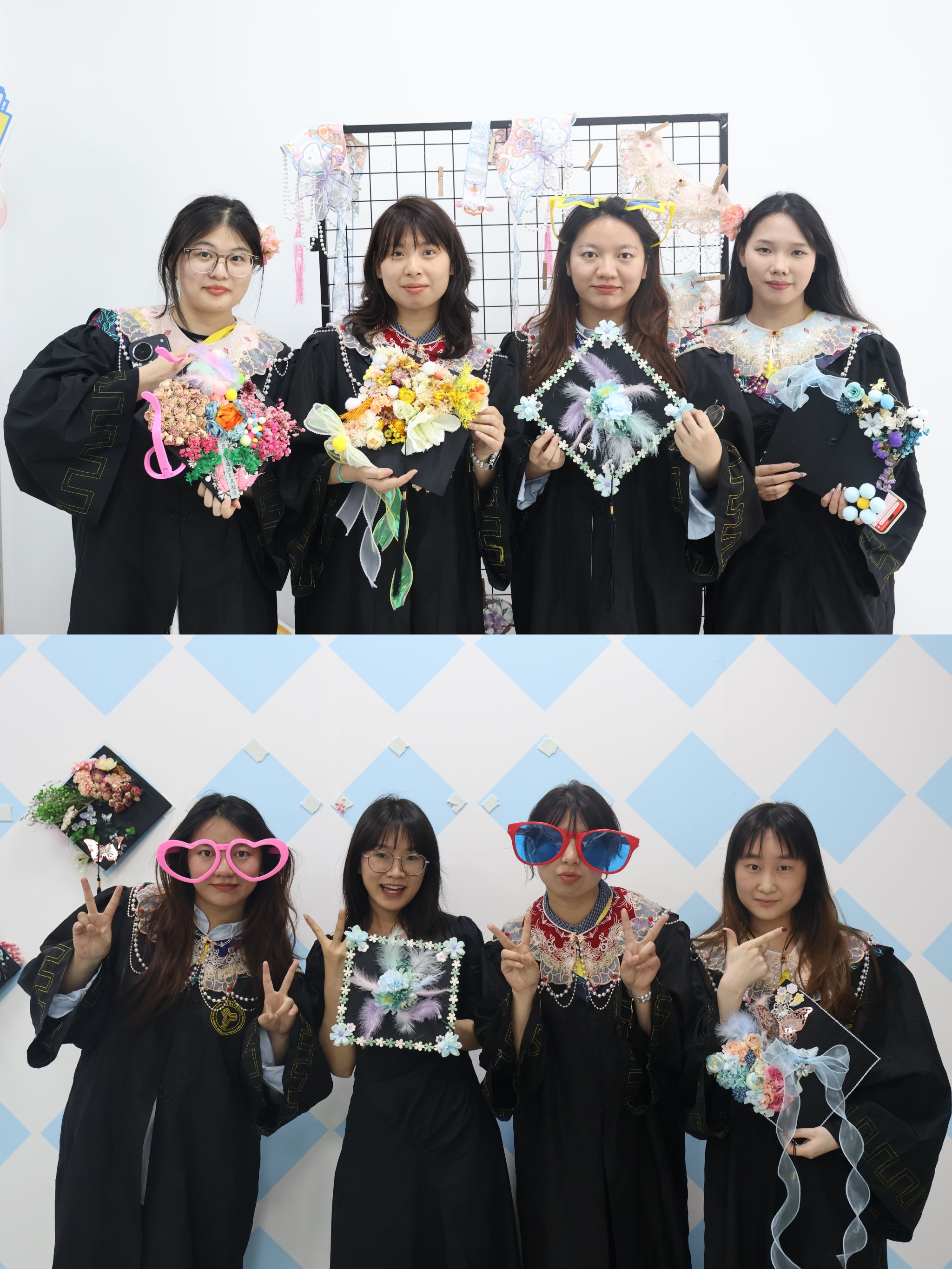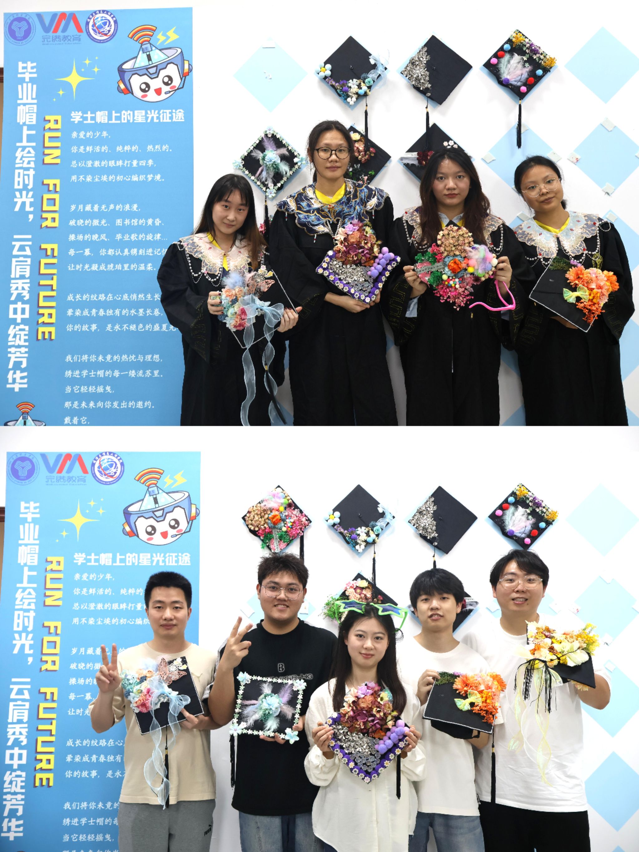 活动前期,学校通过线上线下相结合的宣传方式,进行了为期一周的预热,提前向毕业班学生和辅导员发出诚挚邀请,并精心做好物资筹备等工作。活动当日,现场氛围热烈而欢快。大家都积极参与其中,他们的创作类型精彩纷呈,有以“花影扶疏处,青春不散场”为主题,用干花压印在学士帽上,将青春的美好瞬间凝固;也有以笔为媒,在帽顶手写优美词句,诉说着对校园时光的眷恋;还有人在毕业帽和云肩上绘制出绚丽多彩的花朵、灵动的飞鸟,寓意着自己即将奔赴充满希望的未来。