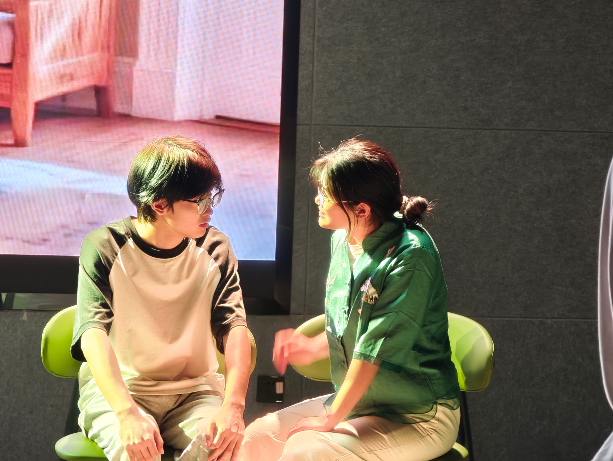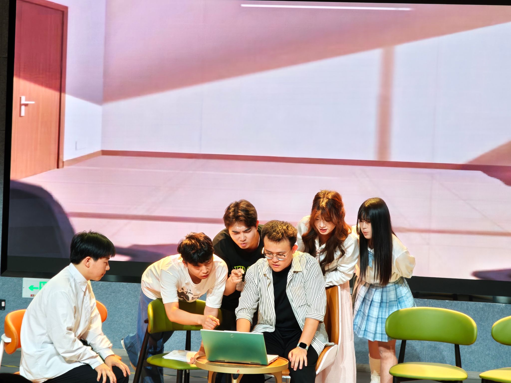 25日晚上七点,《以AI之名》剧组已然严阵以待。眼中眸光闪烁,交织着激动与紧张。当灯光悠悠亮起,黄佳宇同学饰演的伯醇似乎从纸张中活了过来;廖子乐“妈妈”好像也有了母亲的慈爱;AI作弊器似乎真的成为了“人生直通车”。他们以精湛的演技,将戏剧独特魅力娓娓道来,每一次自然流畅的对话,都映照着彼此间合作的无间默契。