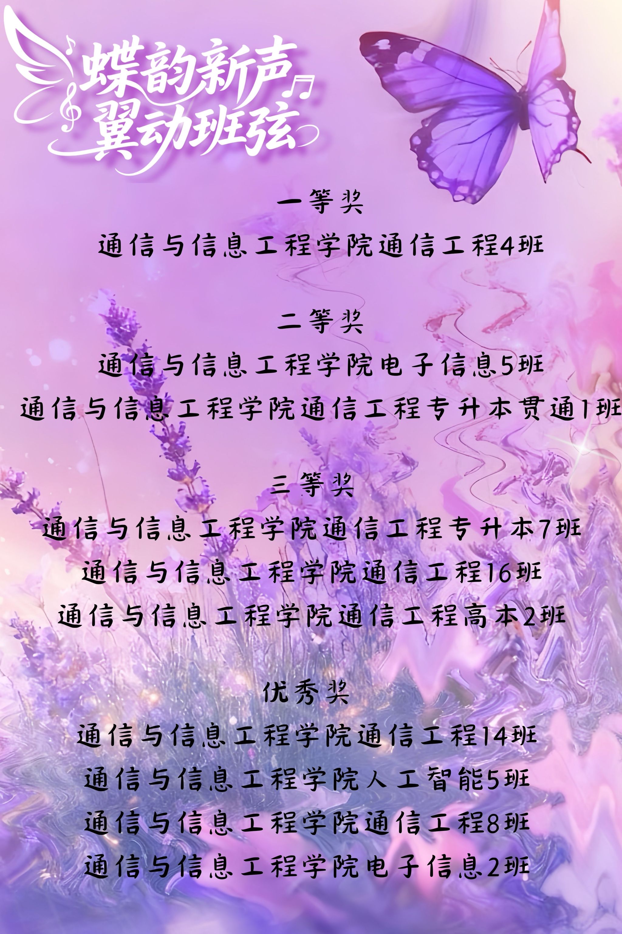 青春如诗,音符如翼。2025年11月12日,由通信与信息工程学院主办的“蝶韵新声,翼动班弦”班级合唱大赛在下里巴人剧场圆满落下帷幕。本次大赛以“党建+艺术”为引领,将思想政治教育与艺术实践深度融合,充分发挥党组织在育人过程中的核心作用,以音乐为载体,凝聚班级力量,展现青春风采,为全院师生呈现了一场视听与情感交融的文艺盛会。
