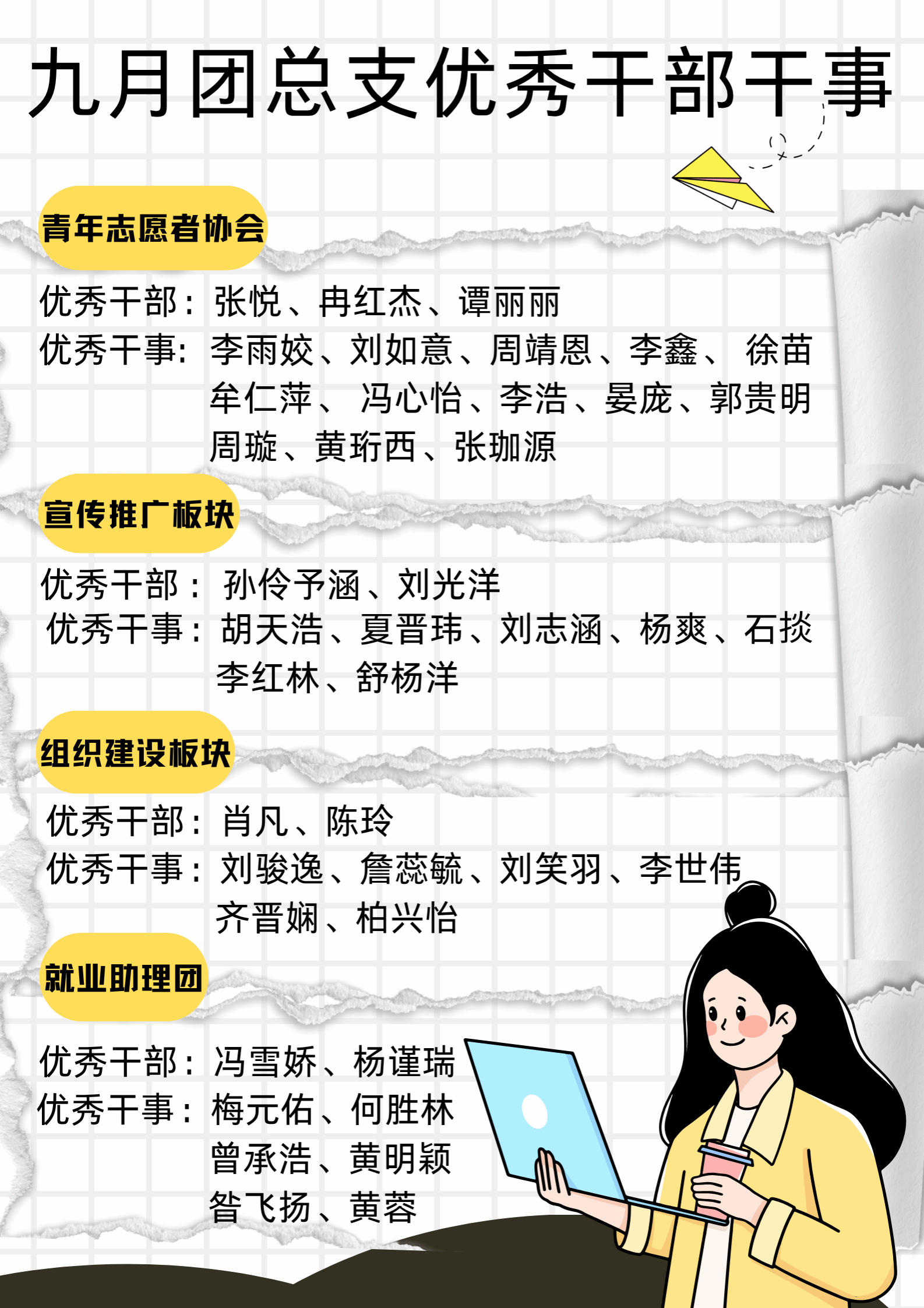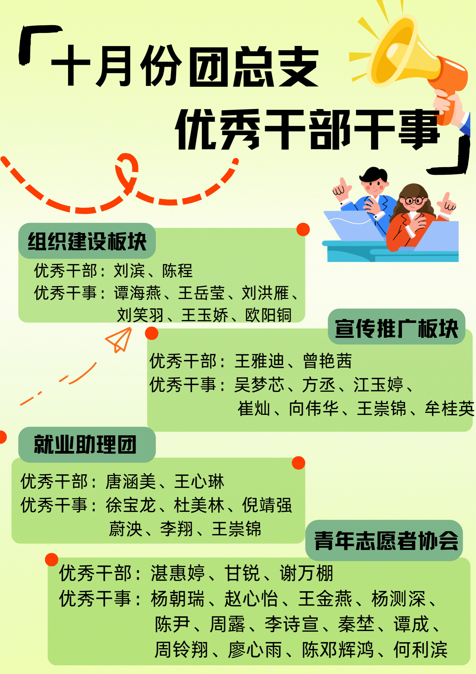 在过去的九月和十月里,学生组织工作人员始终以饱满的热情和积极的态度,全心投入校园活动组织与服务同学的工作中,在各自岗位上恪尽职守,为学生组织工作的有序推进奠定了坚实基础。为嘉奖表现突出的工作人员,通信与信息工程学院特此开展九、十月优秀工作人员评选,评选结果已新鲜出炉。